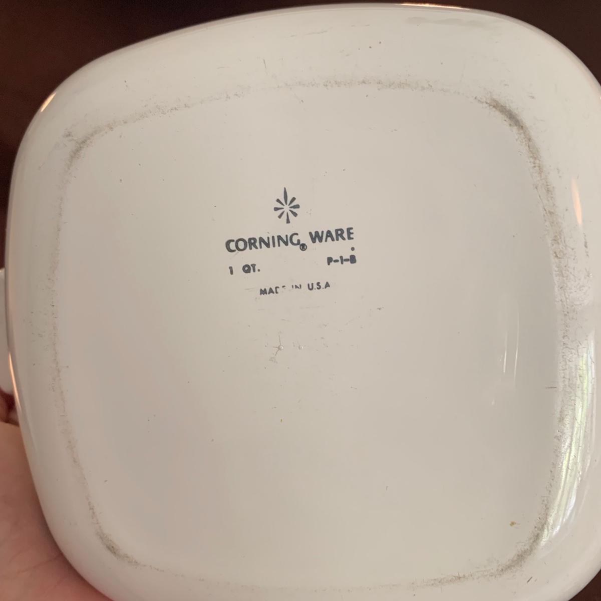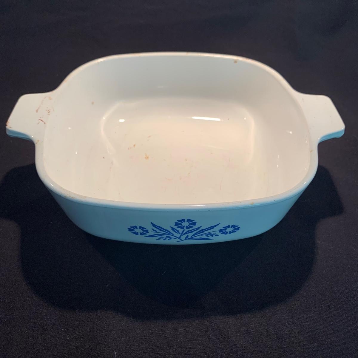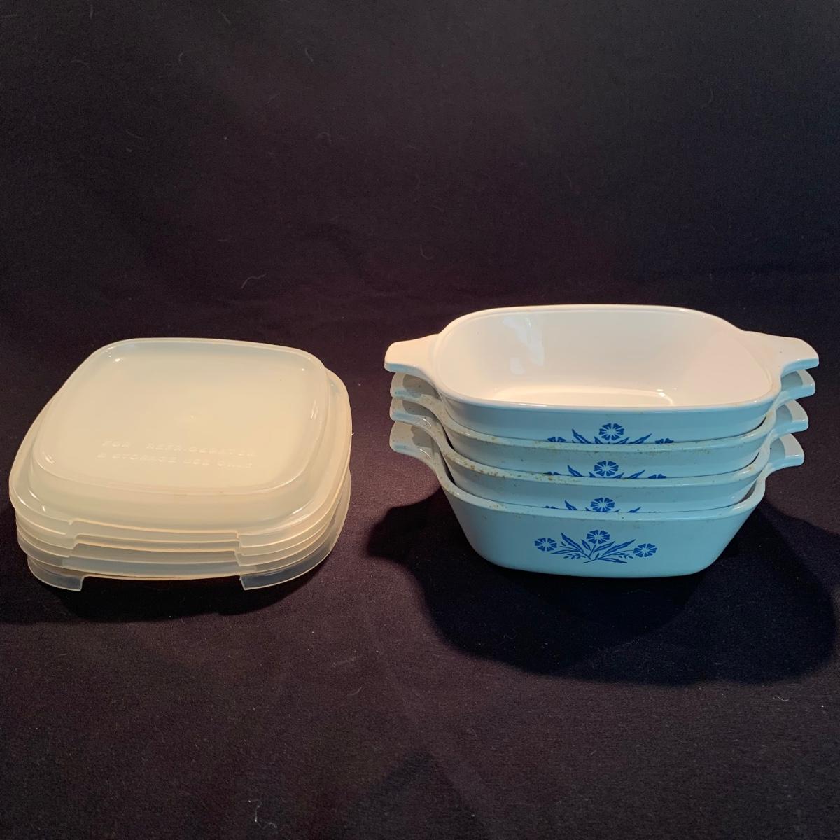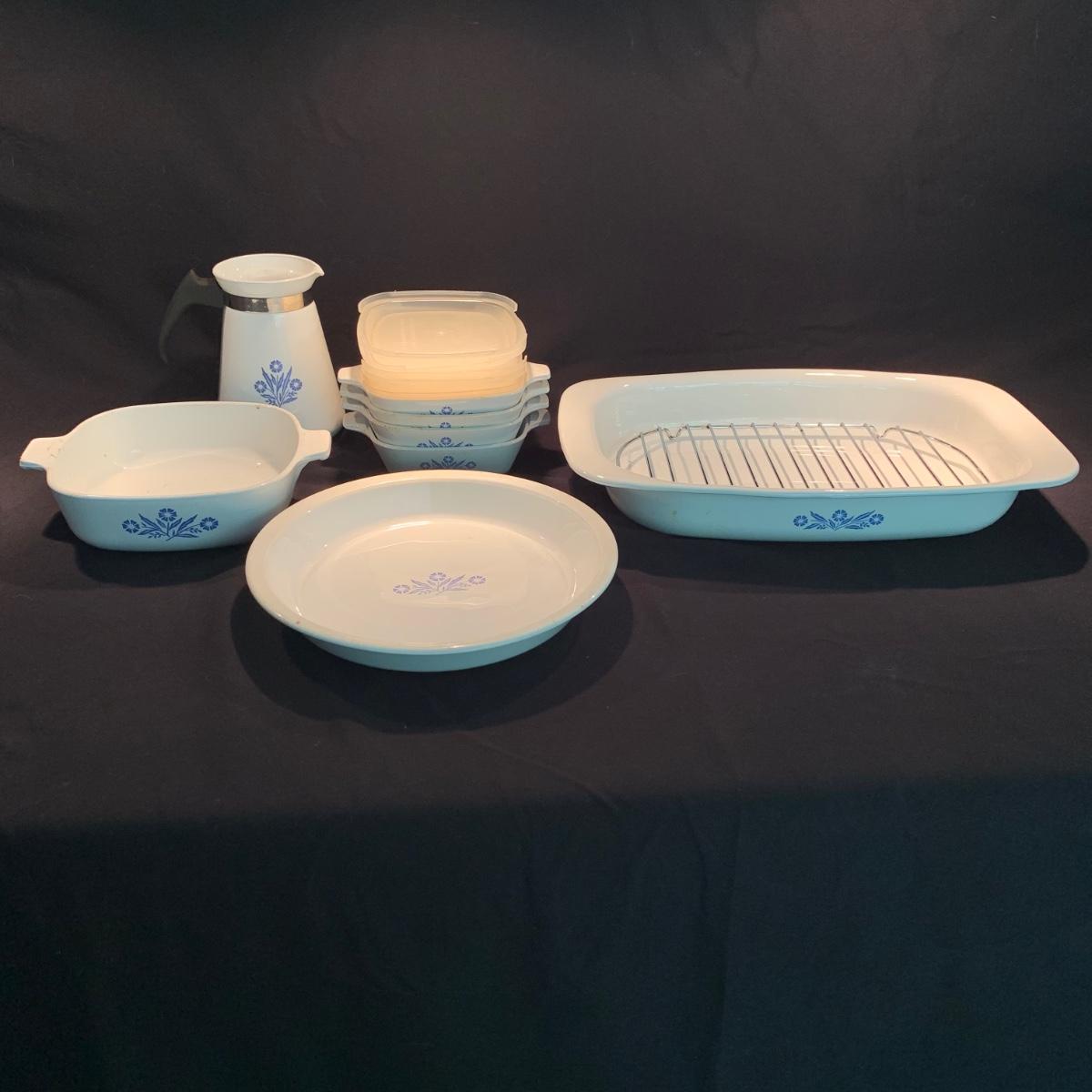 Eight Corning Ware kitchen items. One 9” pie dish, one square 1-quart dish, one roasted, one 4-cup carafe, and four 1 3/4 cup dishes with plastic lids. Items are in good to fair condition with some scratches and staining from use. A lot of the stains can probably be cleaned. No cracks seen, but one small chip was found on the underneath side of the handle of two of the small 1 3/4 cup dishes. Local pickup only.