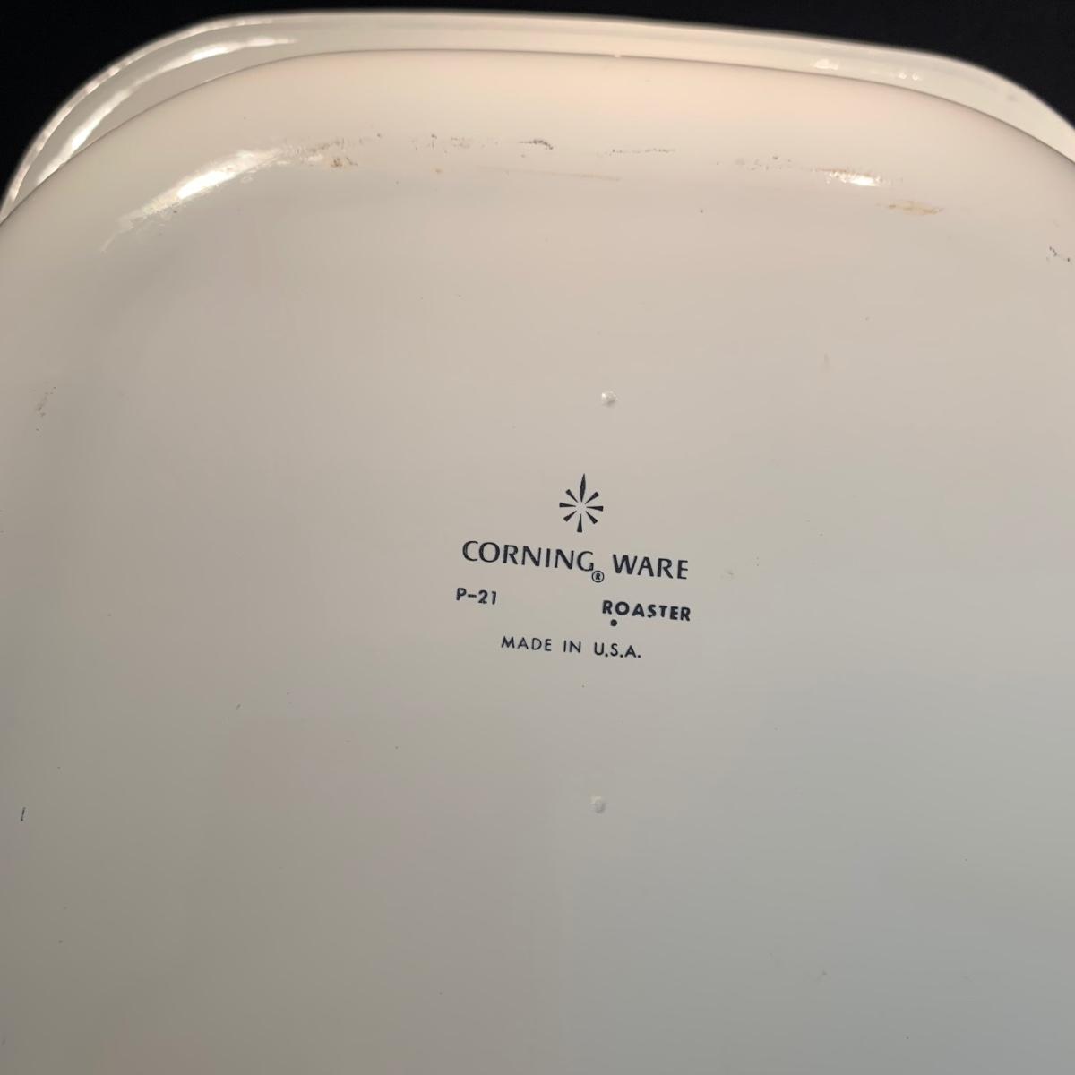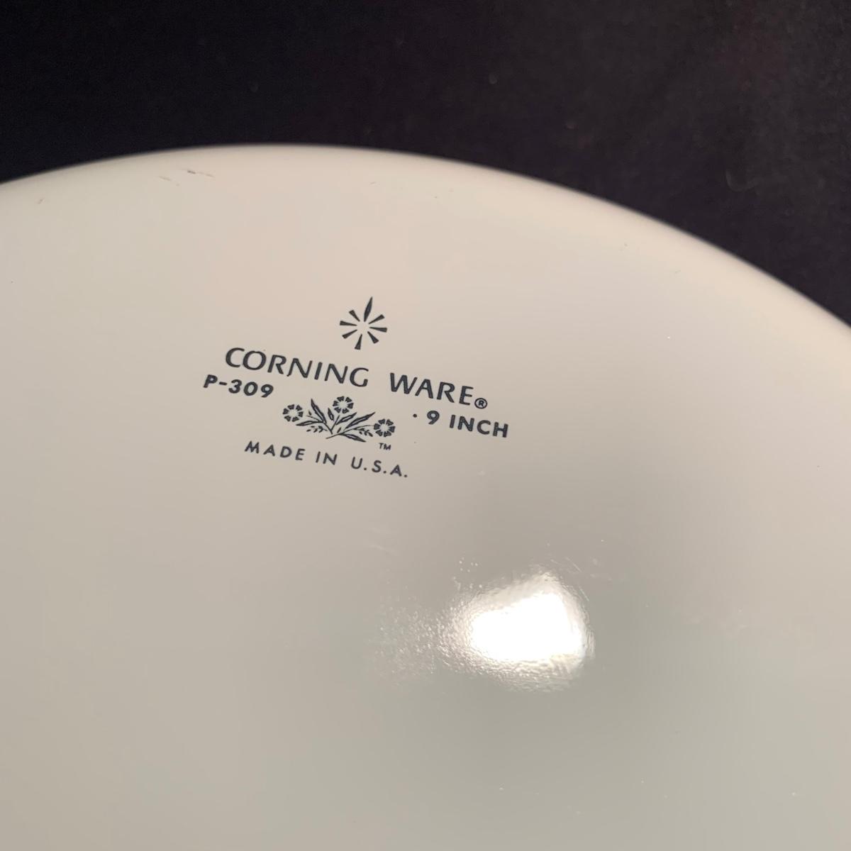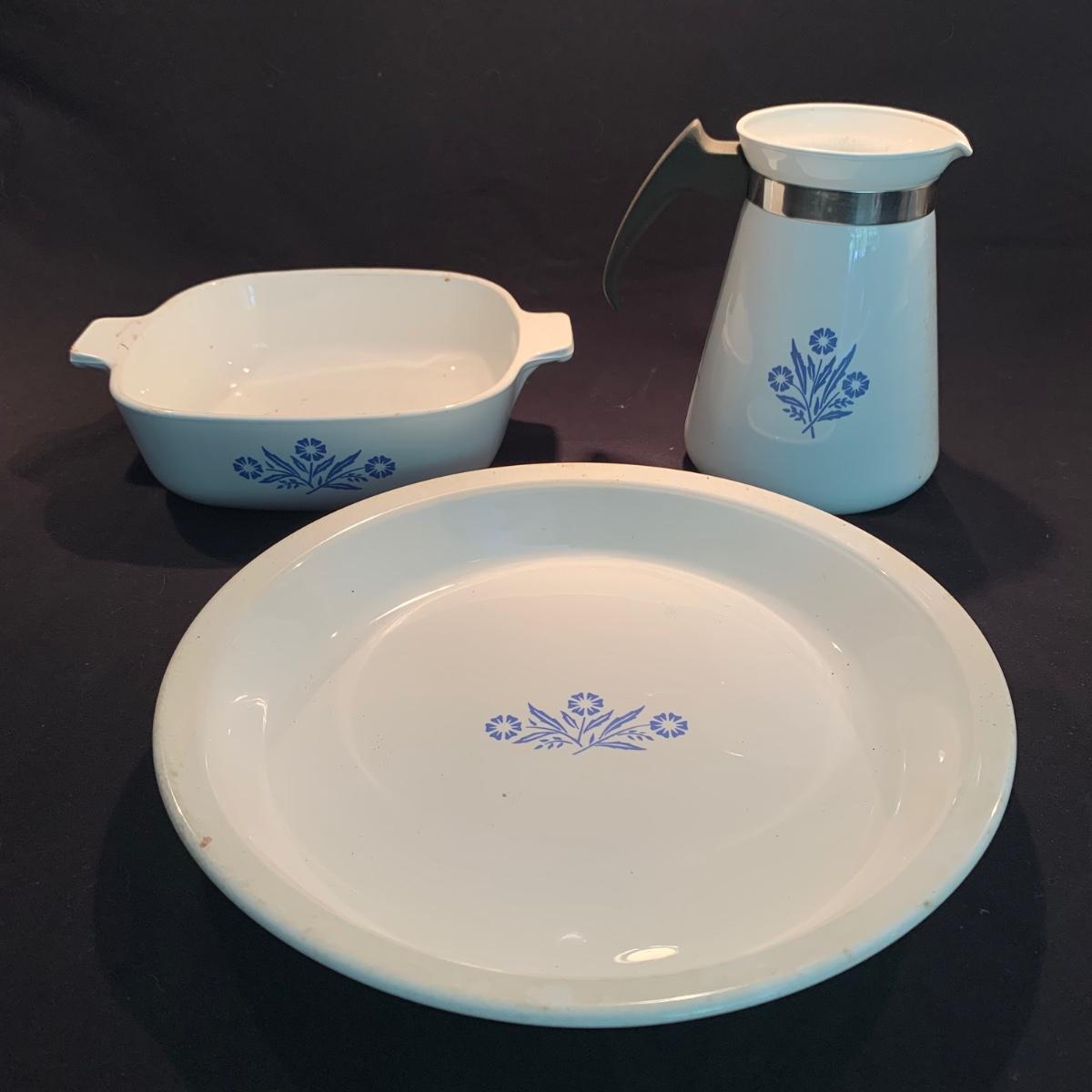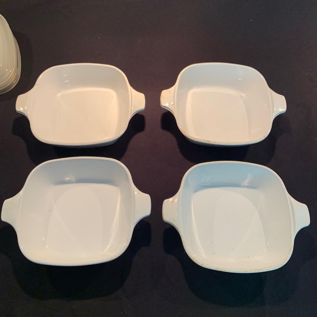 Eight Corning Ware kitchen items. One 9” pie dish, one square 1-quart dish, one roasted, one 4-cup carafe, and four 1 3/4 cup dishes with plastic lids. Items are in good to fair condition with some scratches and staining from use. A lot of the stains can probably be cleaned. No cracks seen, but one small chip was found on the underneath side of the handle of two of the small 1 3/4 cup dishes. Local pickup only.