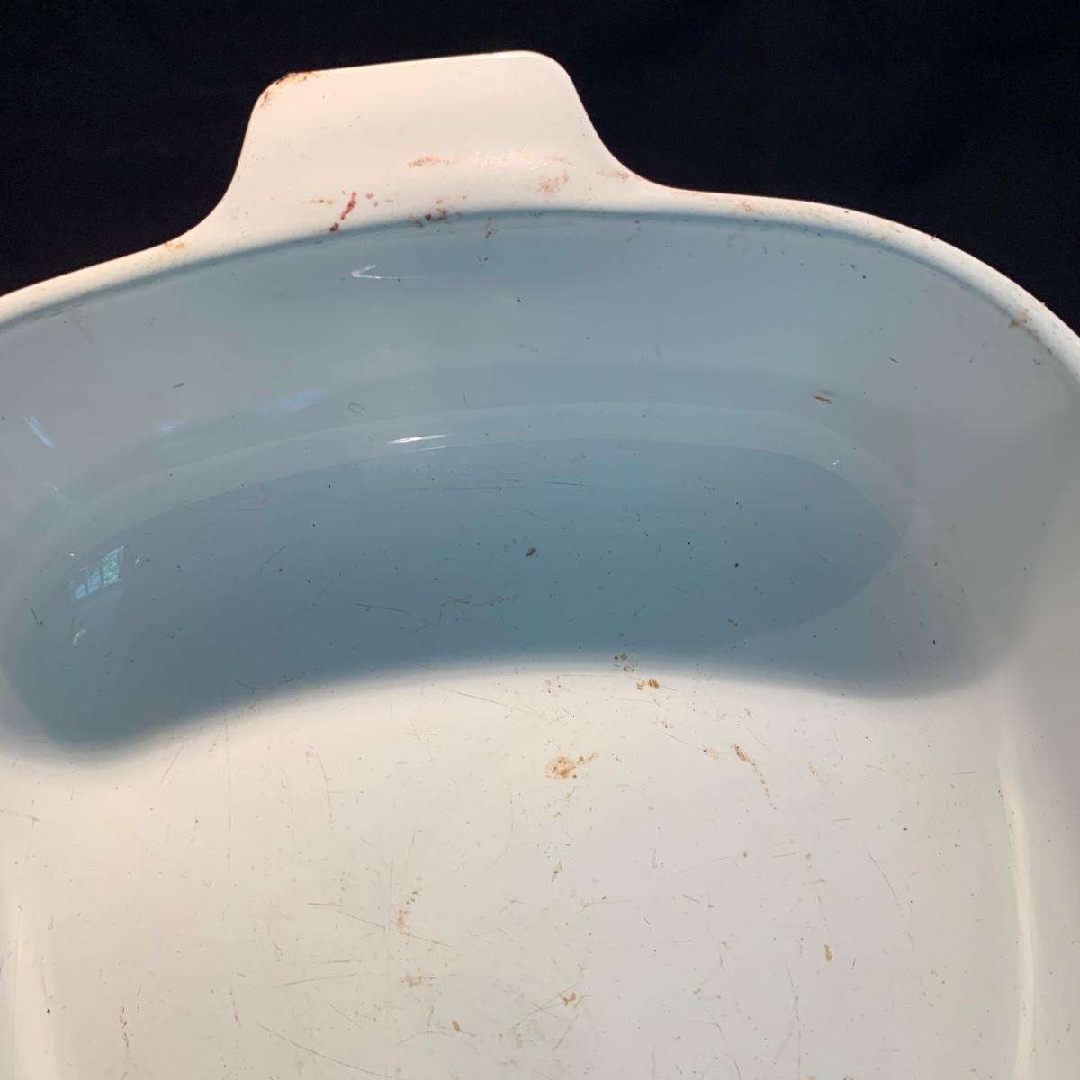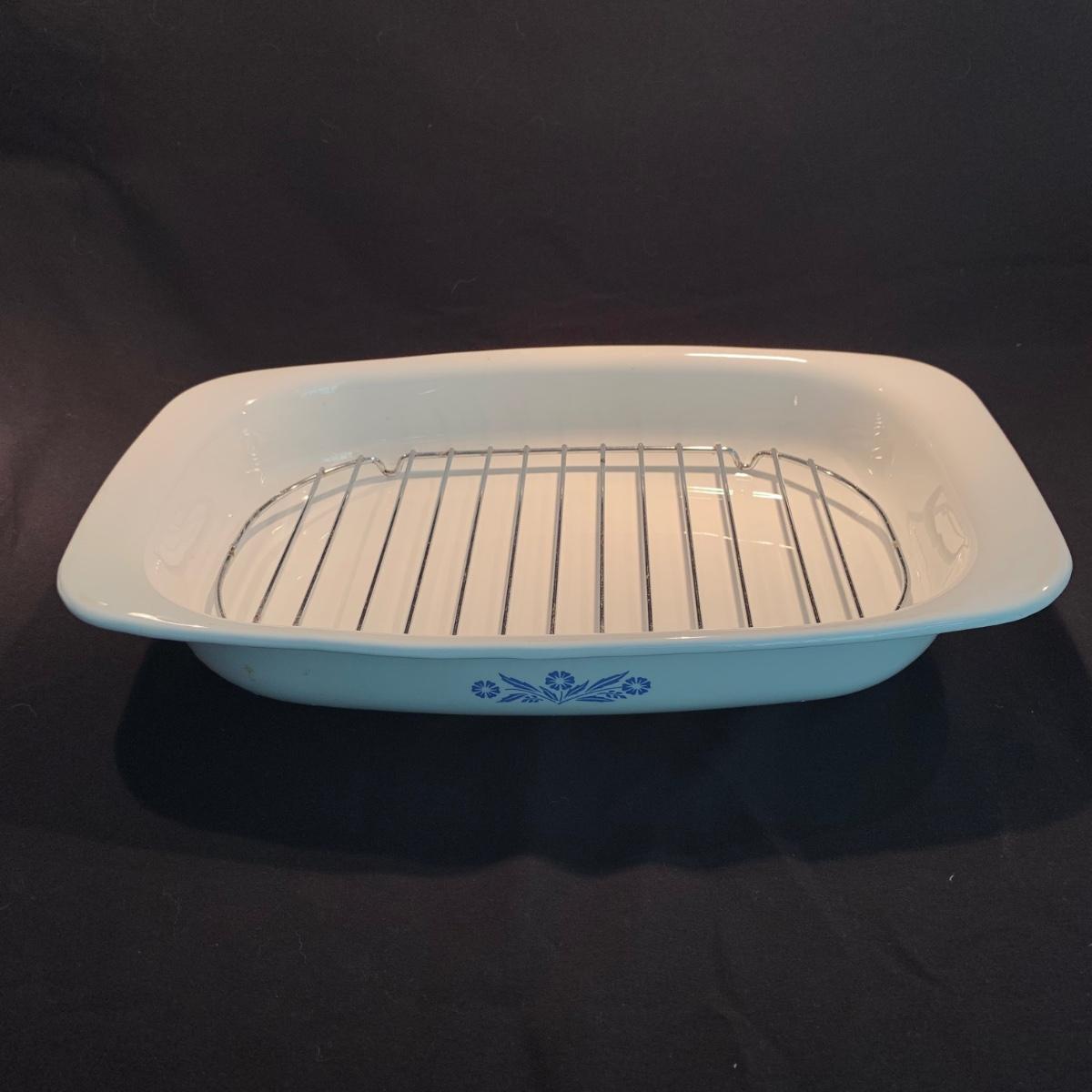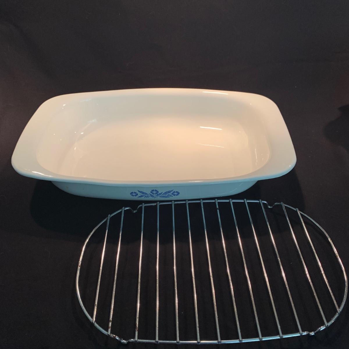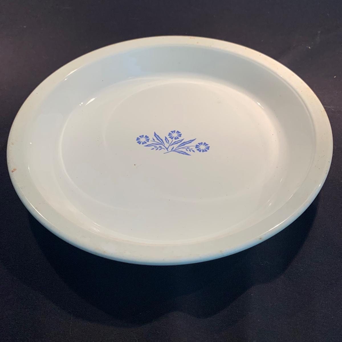 Eight Corning Ware kitchen items. One 9” pie dish, one square 1-quart dish, one roasted, one 4-cup carafe, and four 1 3/4 cup dishes with plastic lids. Items are in good to fair condition with some scratches and staining from use. A lot of the stains can probably be cleaned. No cracks seen, but one small chip was found on the underneath side of the handle of two of the small 1 3/4 cup dishes. Local pickup only.
