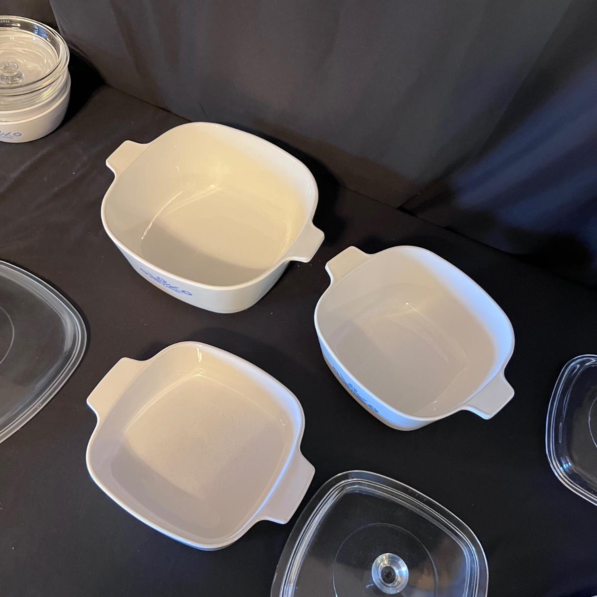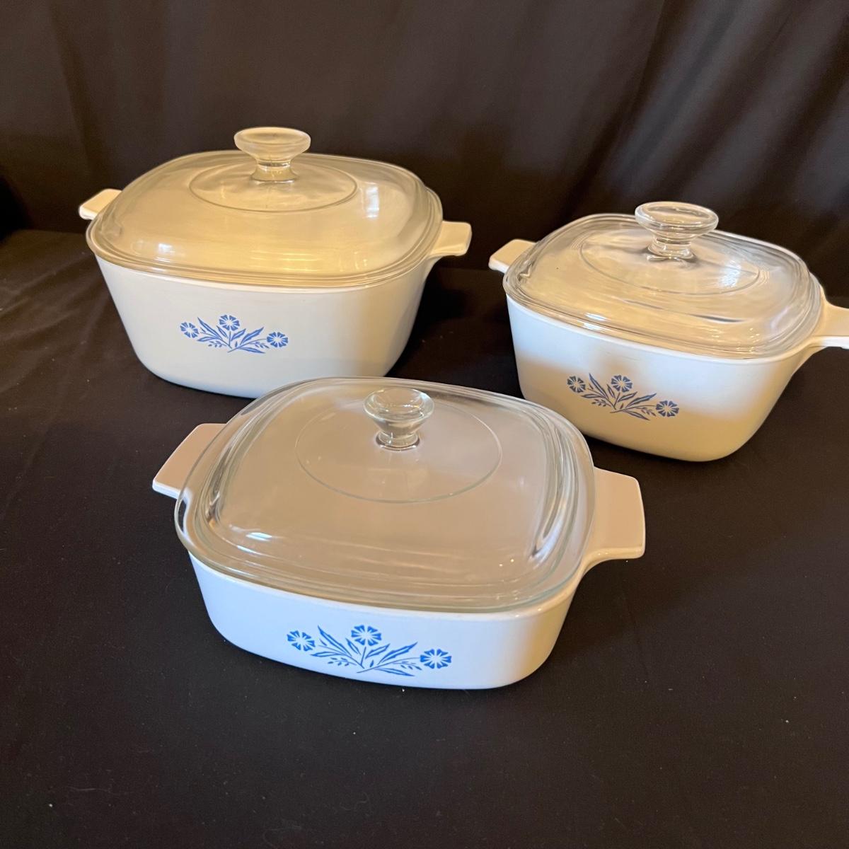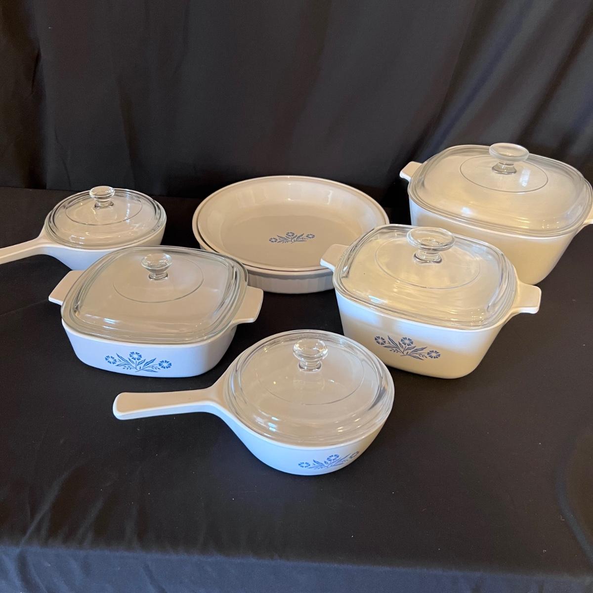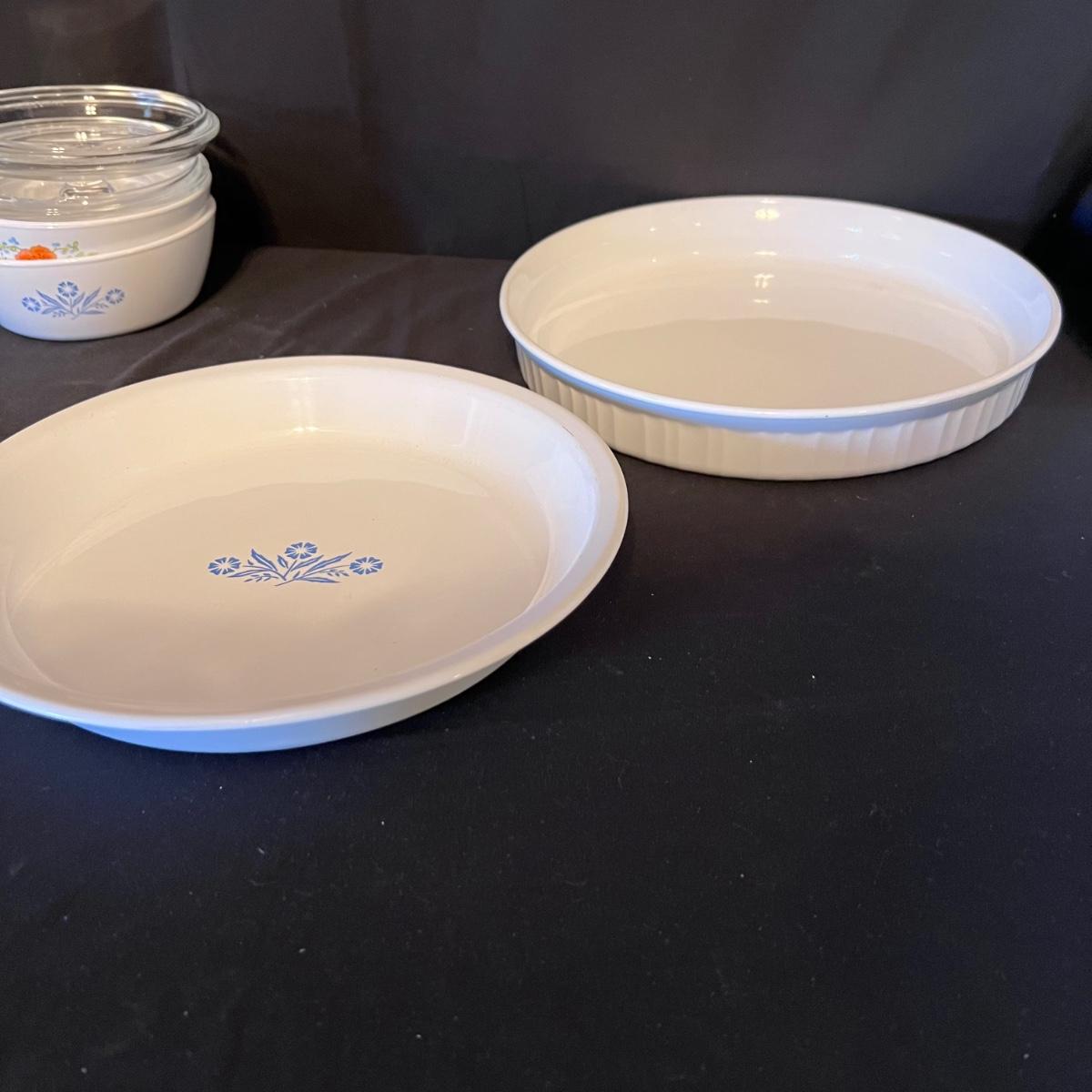 Most of these Corning Ware Dishes and plates have the Cornflower Blue pattern with one plain white pie plate and one dish with the Wildflower pattern. The larger of the three casserole dishes is 2 1/2 quart.