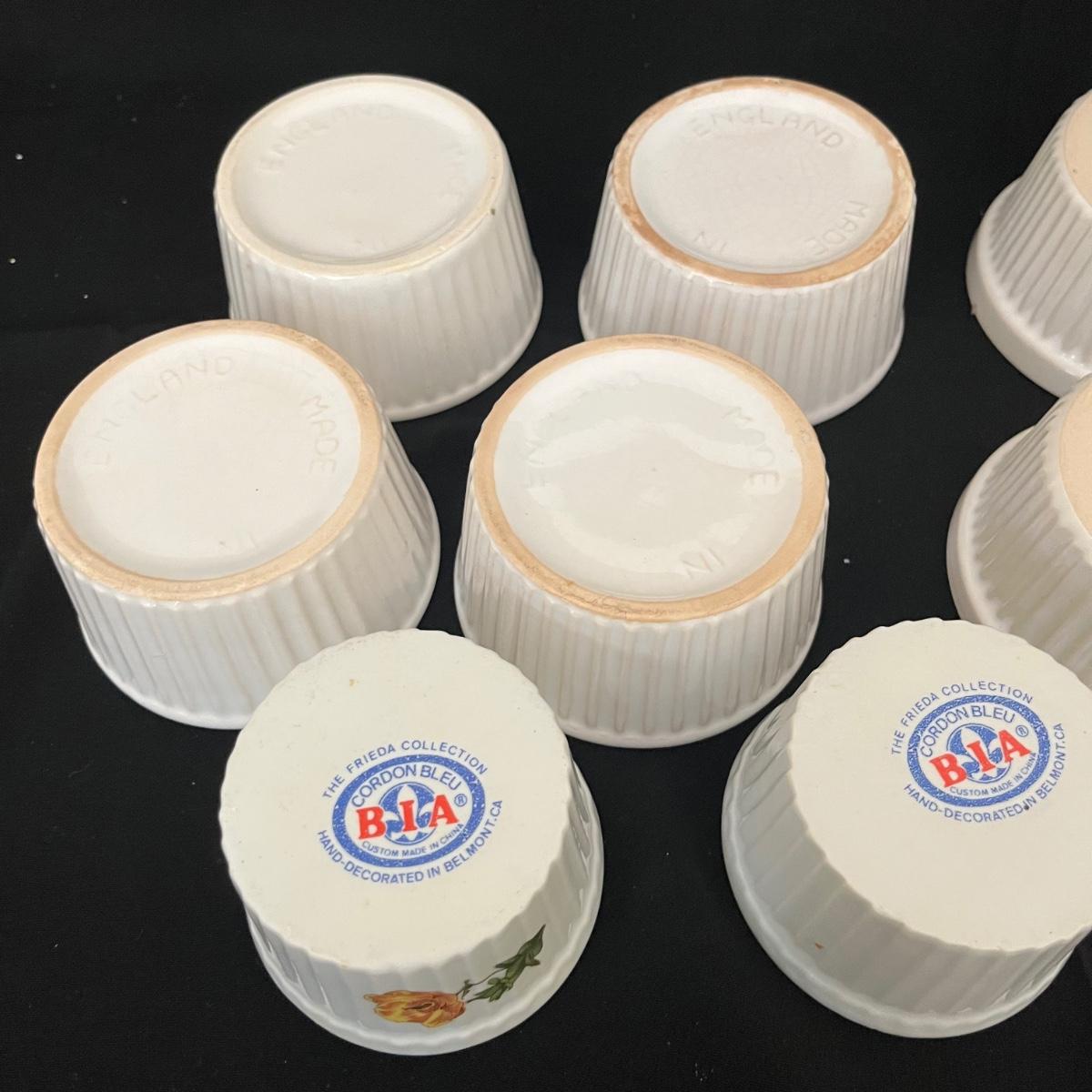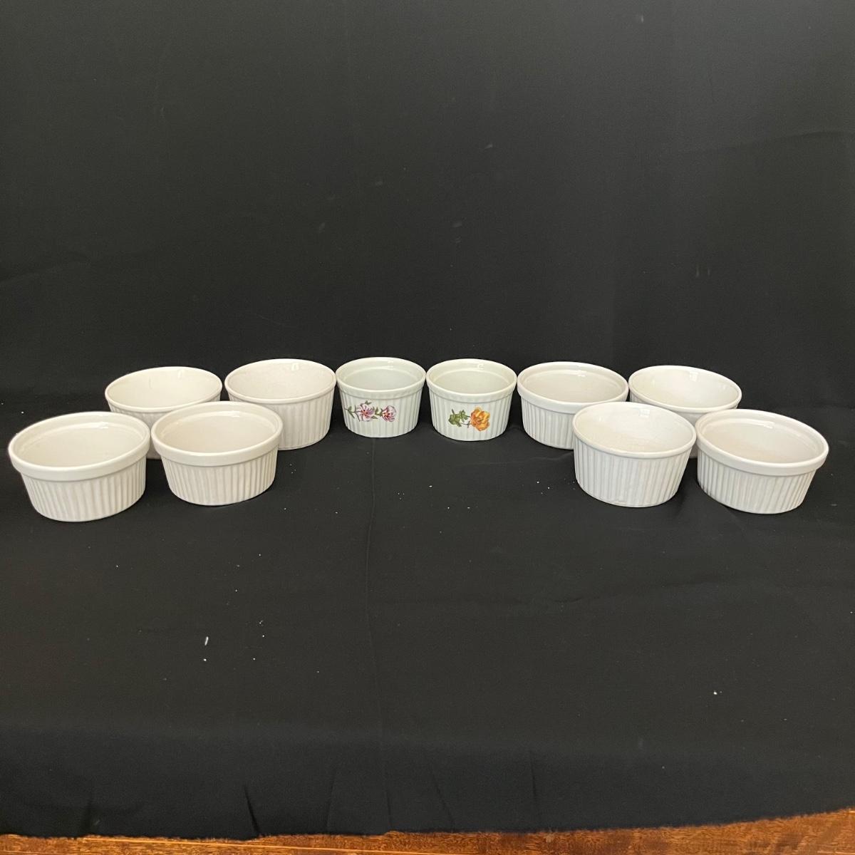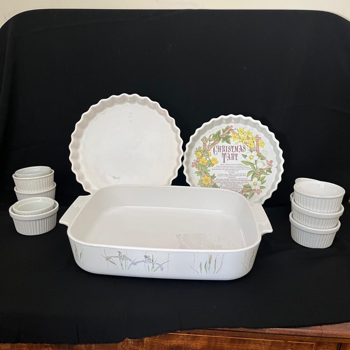 Lot includes a Corning casserole dish, two tart dishes and ten ramekins. Casserole dish measures 11” x 15” x 2.75”.