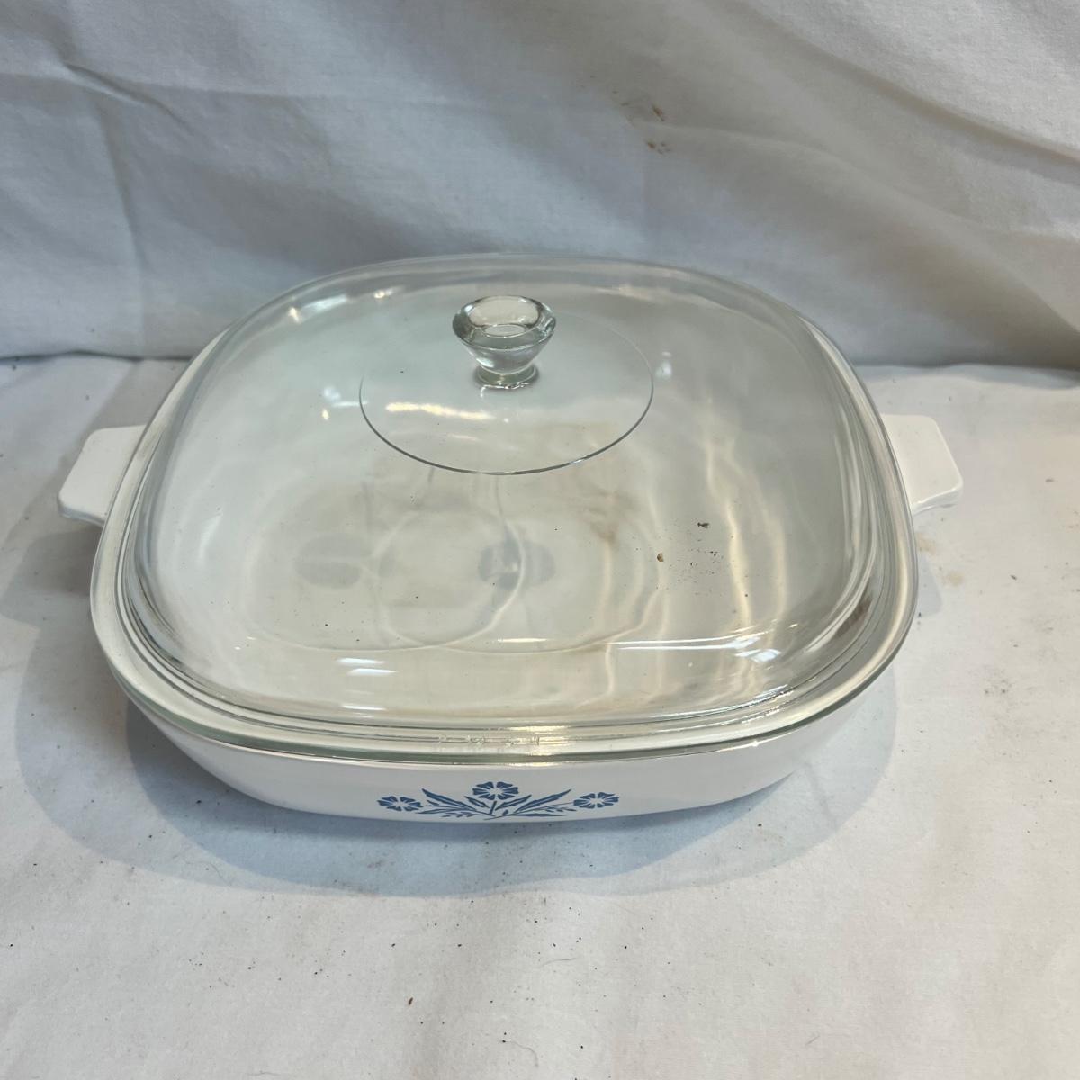 A collection of corning ware and Pyrex covered baking dishes. Two round covered baking dishes - one green and one with a mushroom design - measure 6.25”D x 3.25”H. Two dishes share one cover. The smaller blue cornflower design 1 quart dish measures 7” square and is 2”H. The larger one is 1.5 quarts and measures 3”H. The larger Corning aware 3 quart dish does not have a cover and it measures 8.5” square and is 4”H. The shallow covered white cornflower design dish is 10” square and measures 2”H. Four Corning Ware Grab & Go bowls each measures 5.5”D x 2”H.