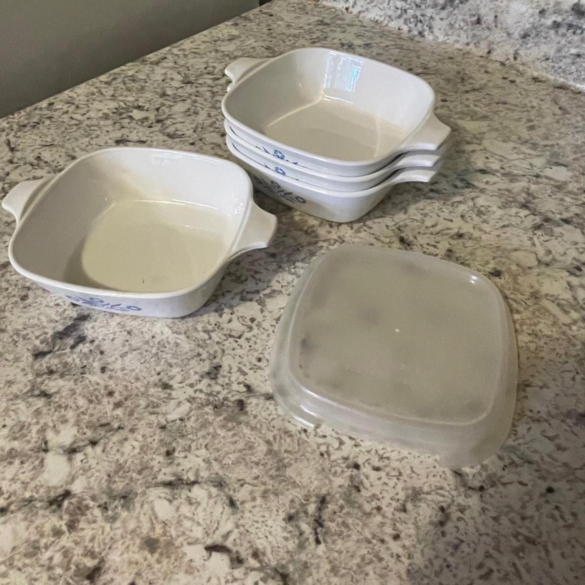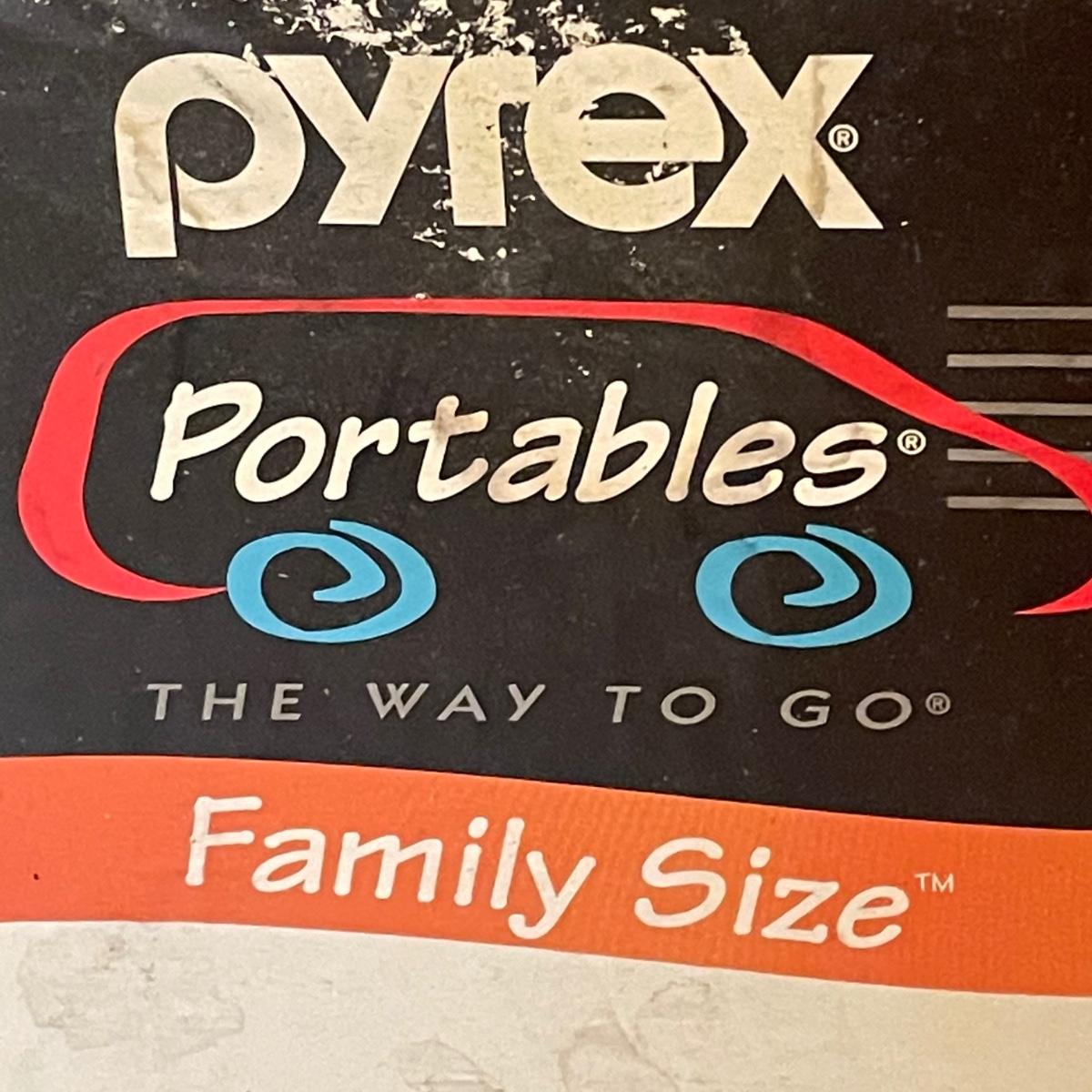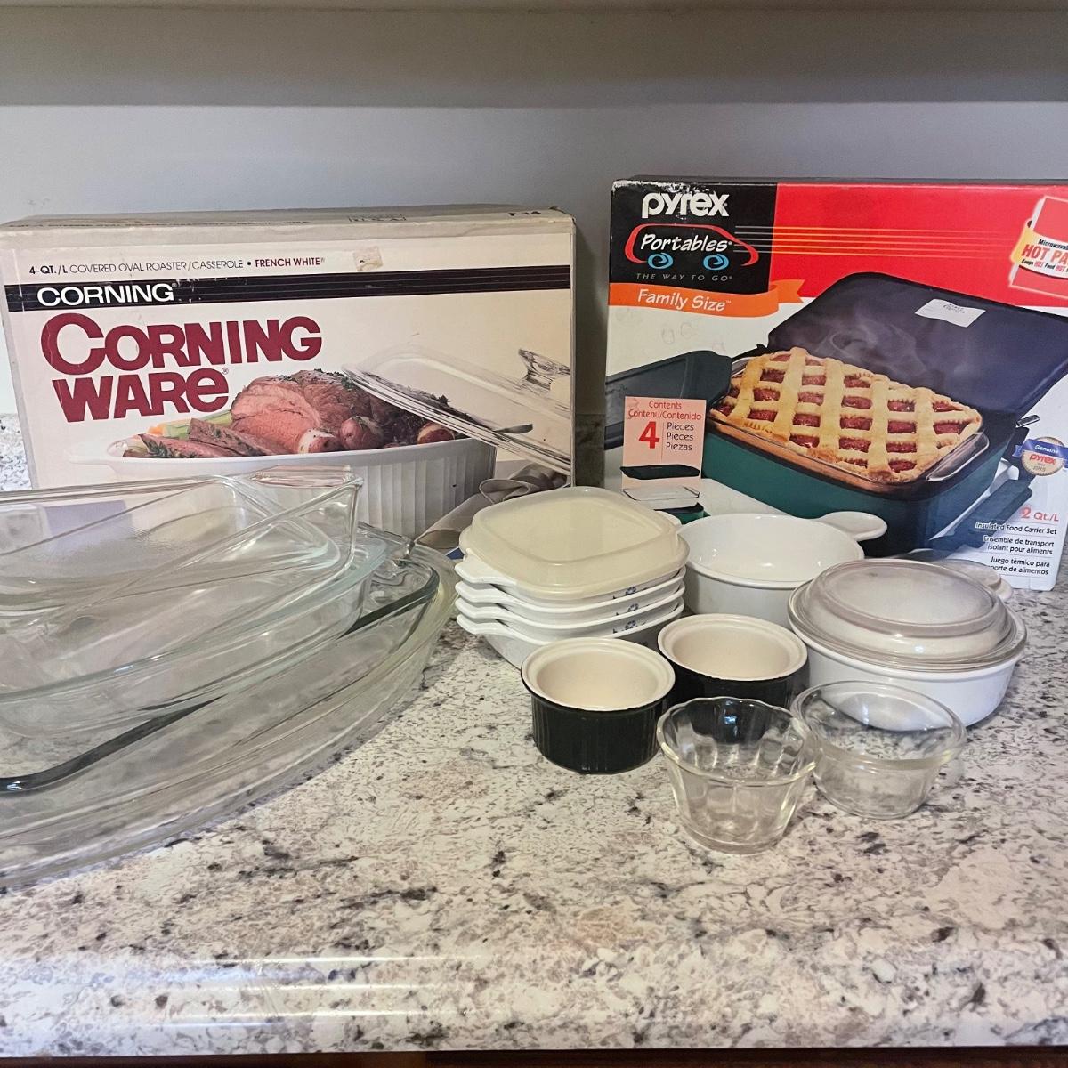 The 4 piece Pyrex portables is in its sealed box so see images of box to show contents. The 4 quart Corning Ware pot is also new. Other items include ceramic ramekins, small glass bowls, Pyrex/Anchor Hocking casserole dishes/bowls and more.