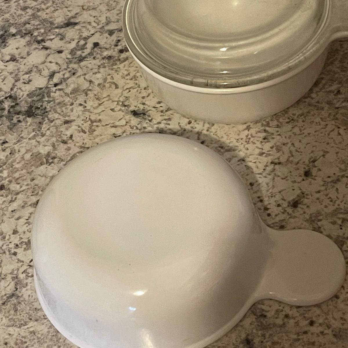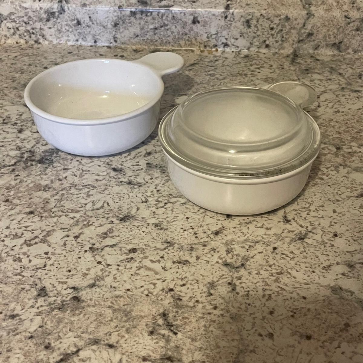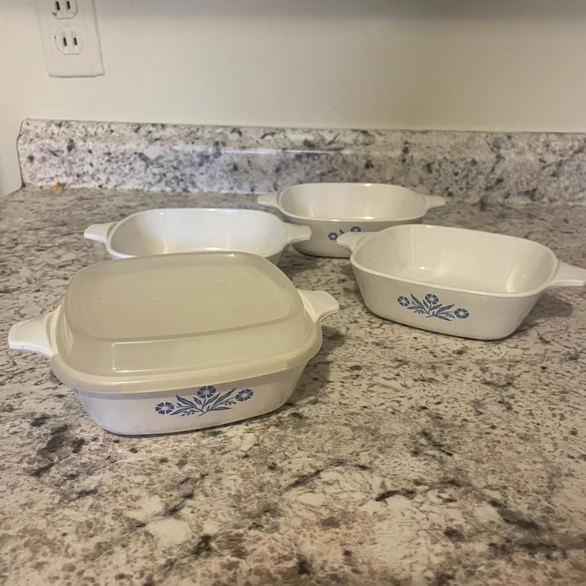 The 4 piece Pyrex portables is in its sealed box so see images of box to show contents. The 4 quart Corning Ware pot is also new. Other items include ceramic ramekins, small glass bowls, Pyrex/Anchor Hocking casserole dishes/bowls and more.