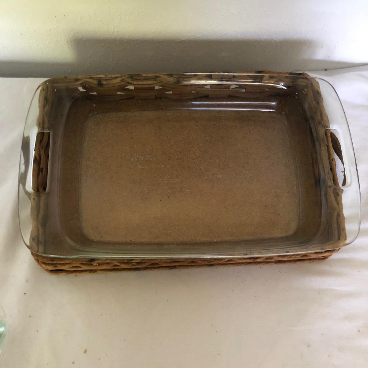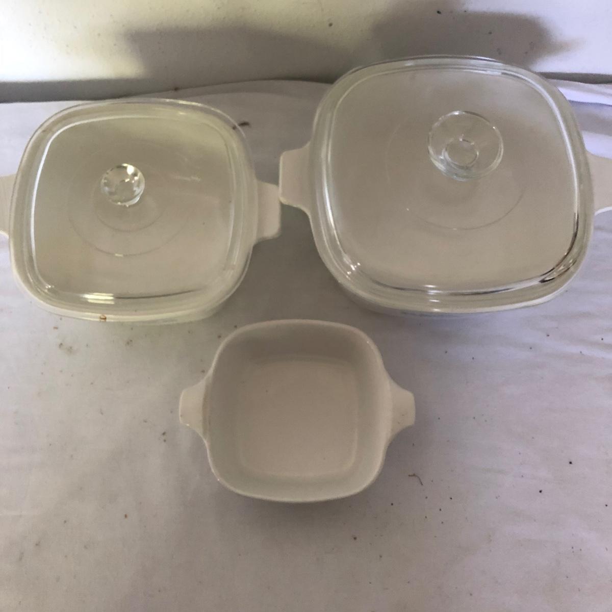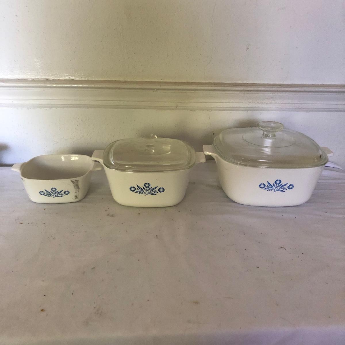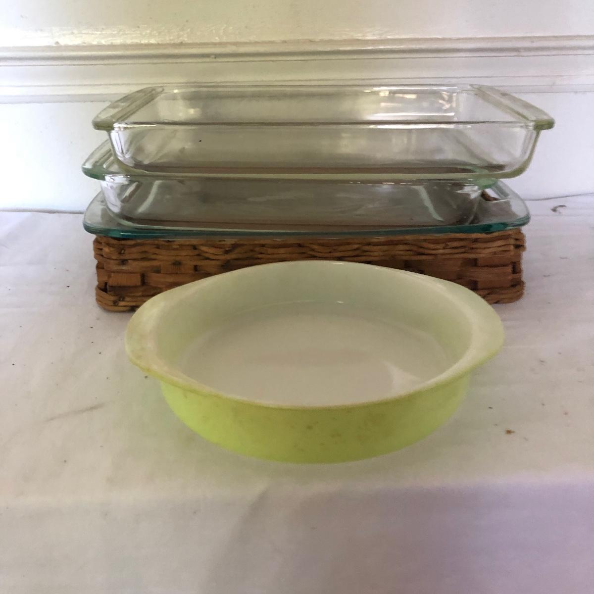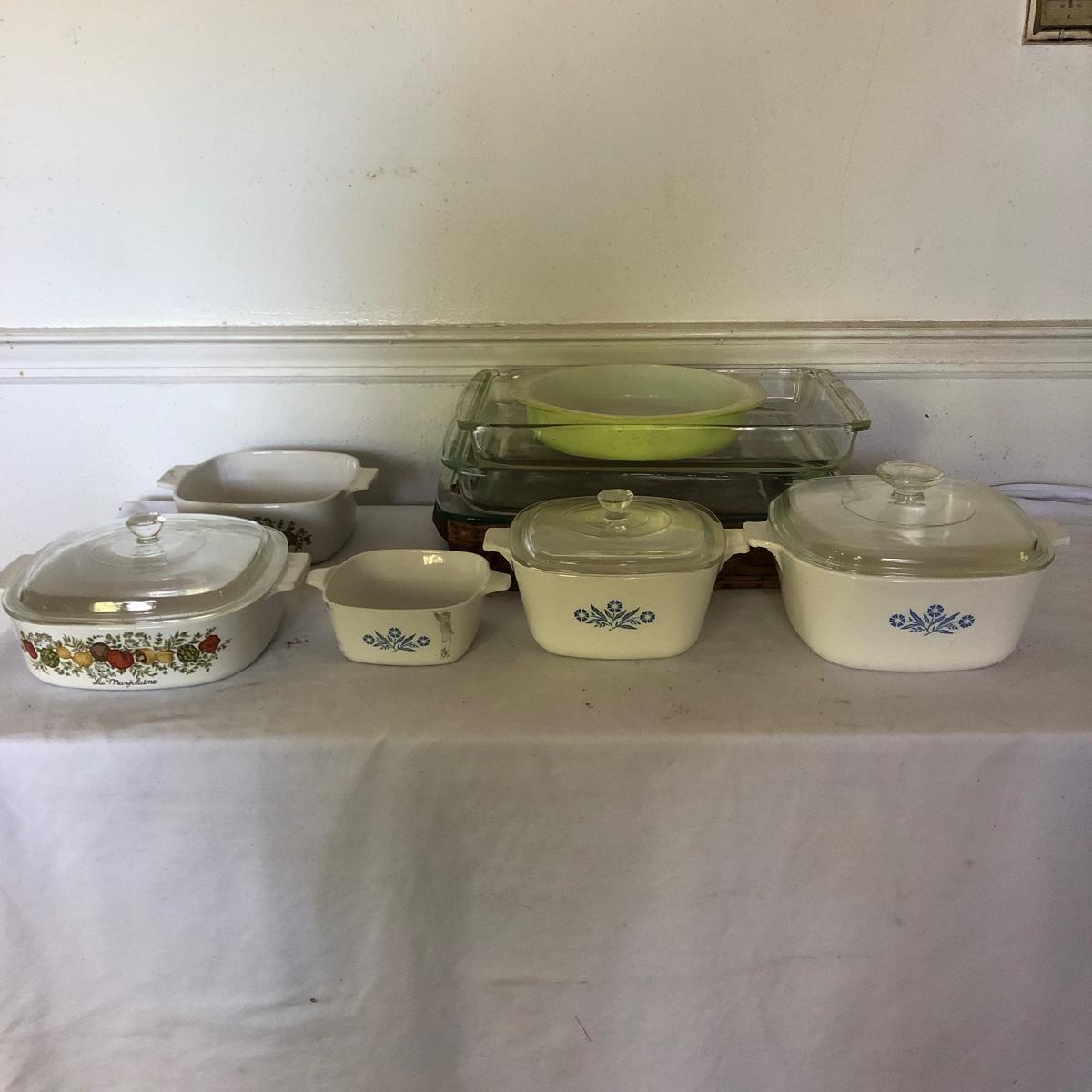 Lot includes five Corning Ware dishes with three lids, vintage green Corning Ware dish and three Pyrex casserole dishes with one in a woven holder.
