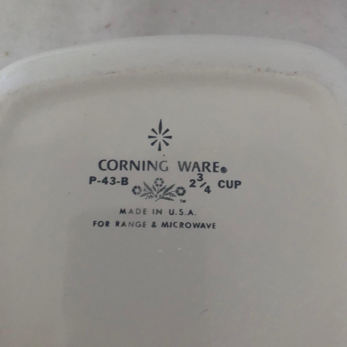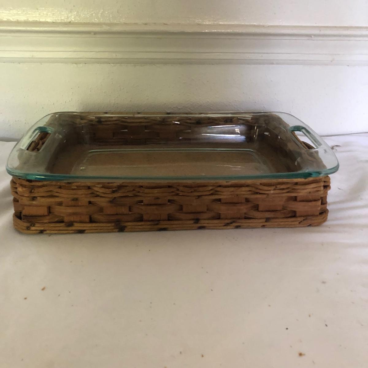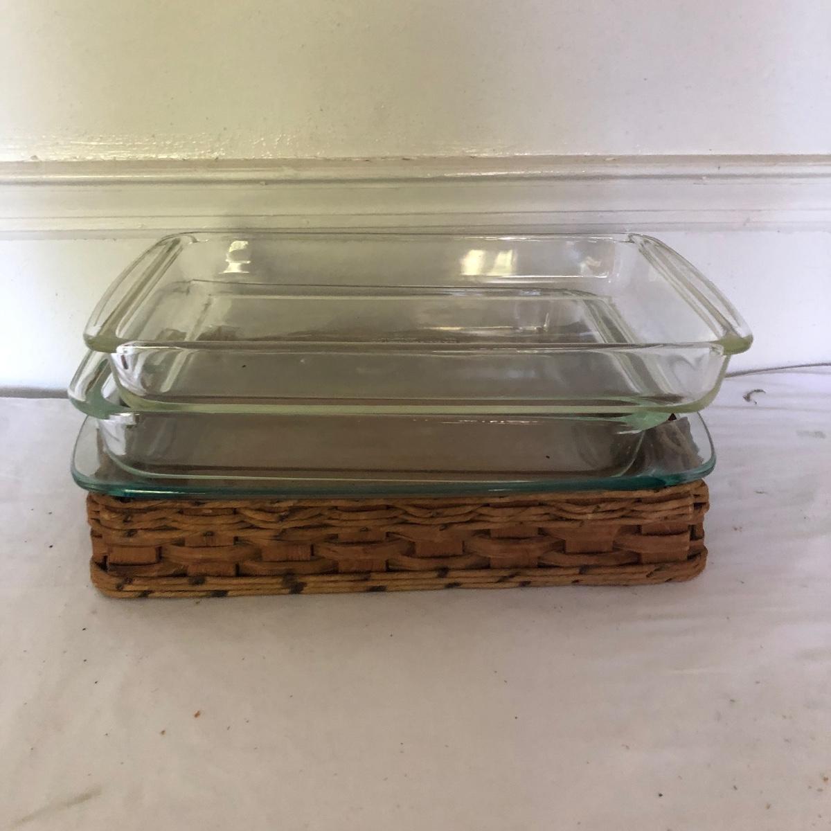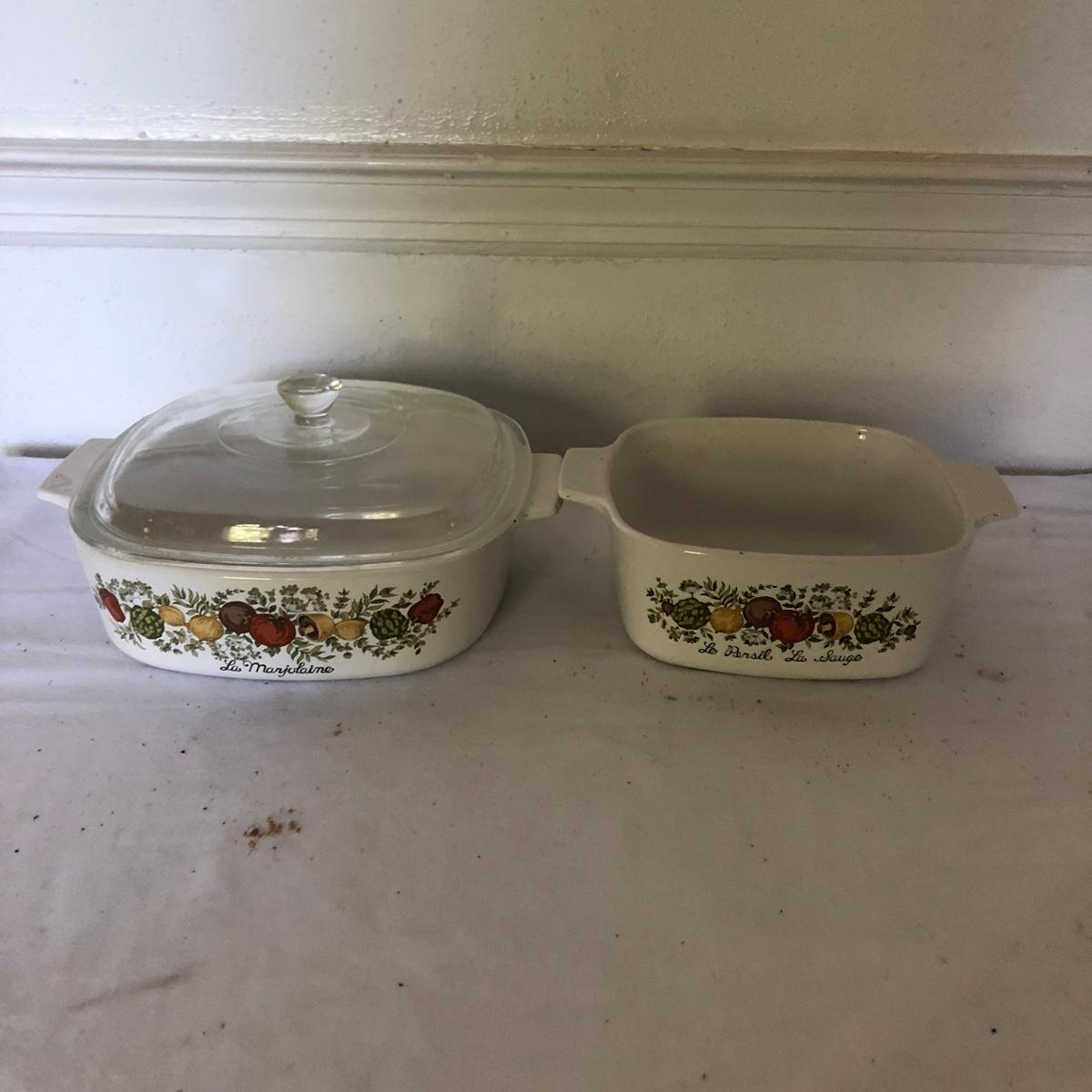 Lot includes five Corning Ware dishes with three lids, vintage green Corning Ware dish and three Pyrex casserole dishes with one in a woven holder.