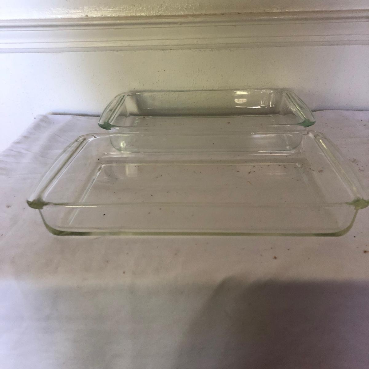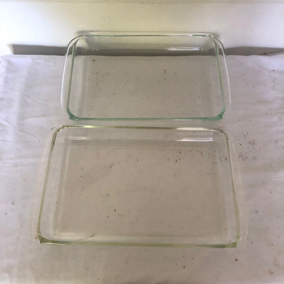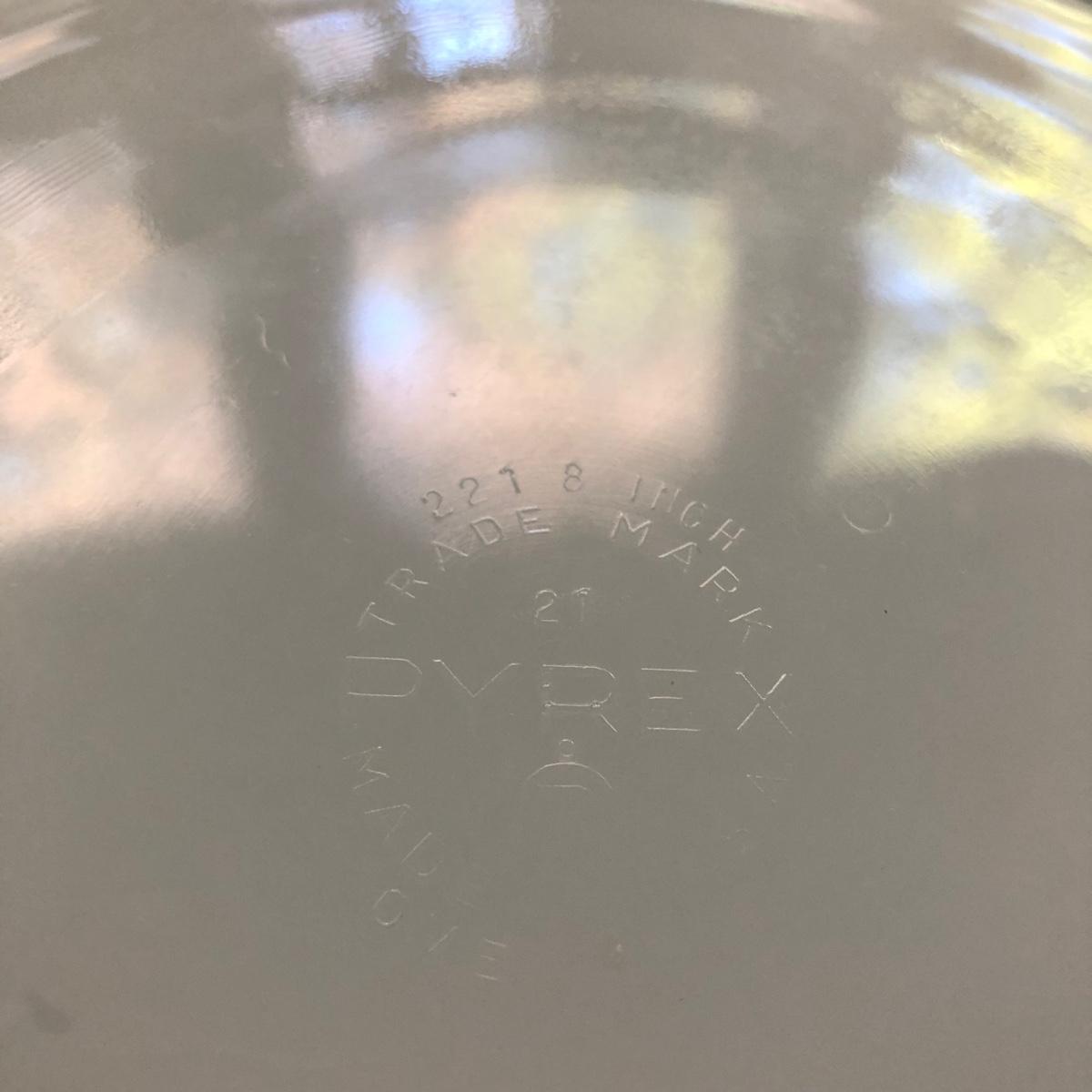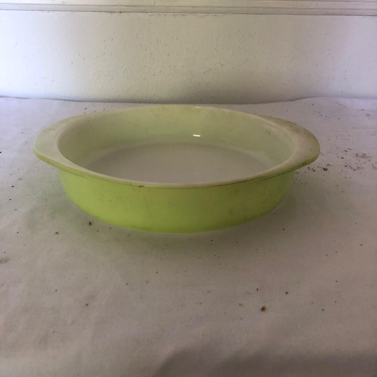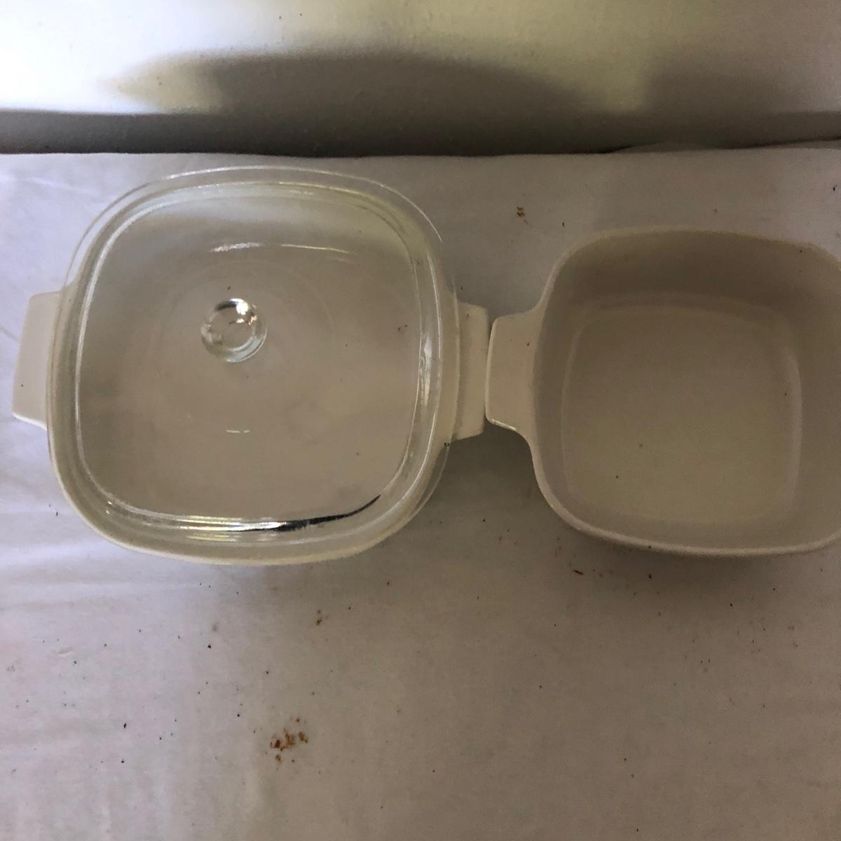 Lot includes five Corning Ware dishes with three lids, vintage green Corning Ware dish and three Pyrex casserole dishes with one in a woven holder.