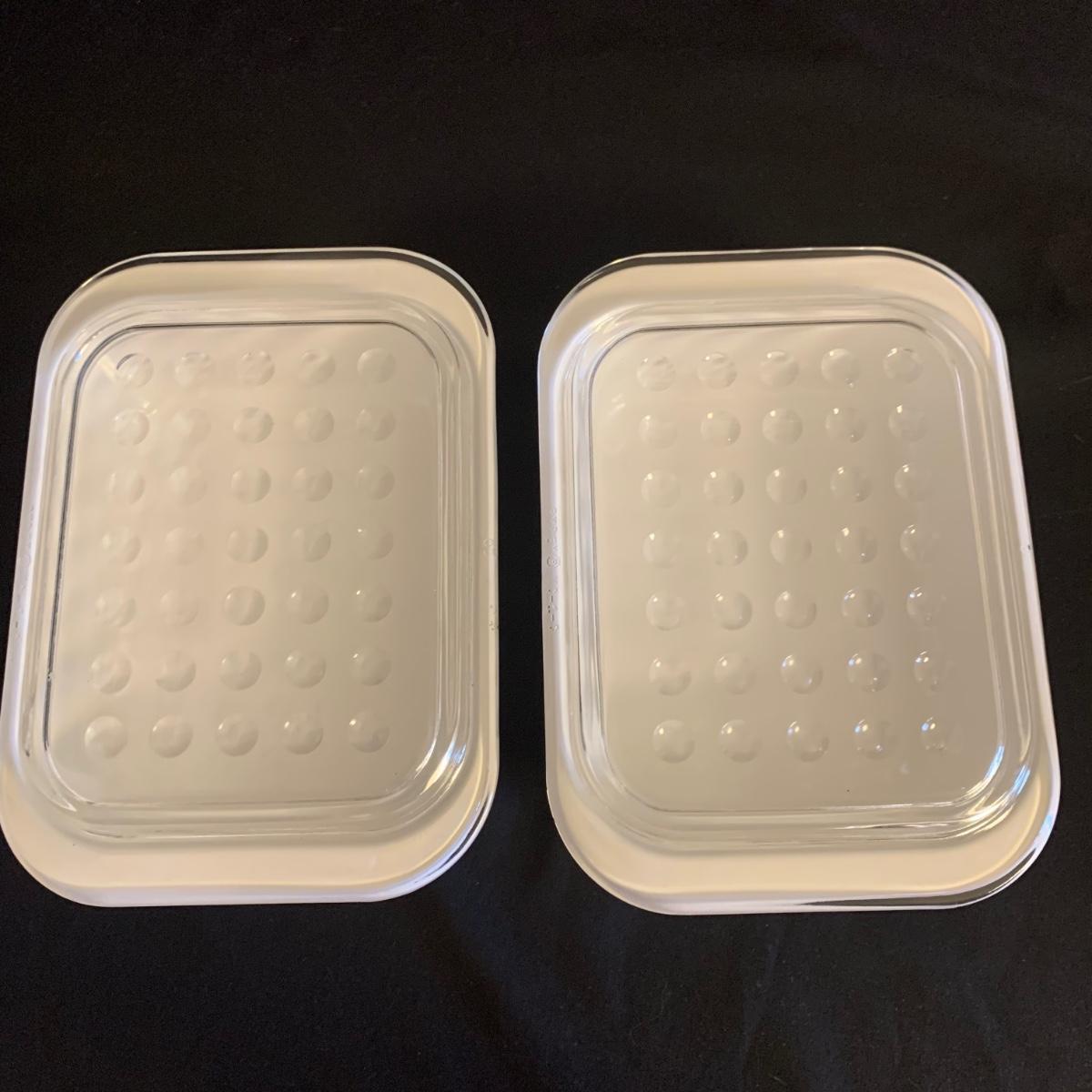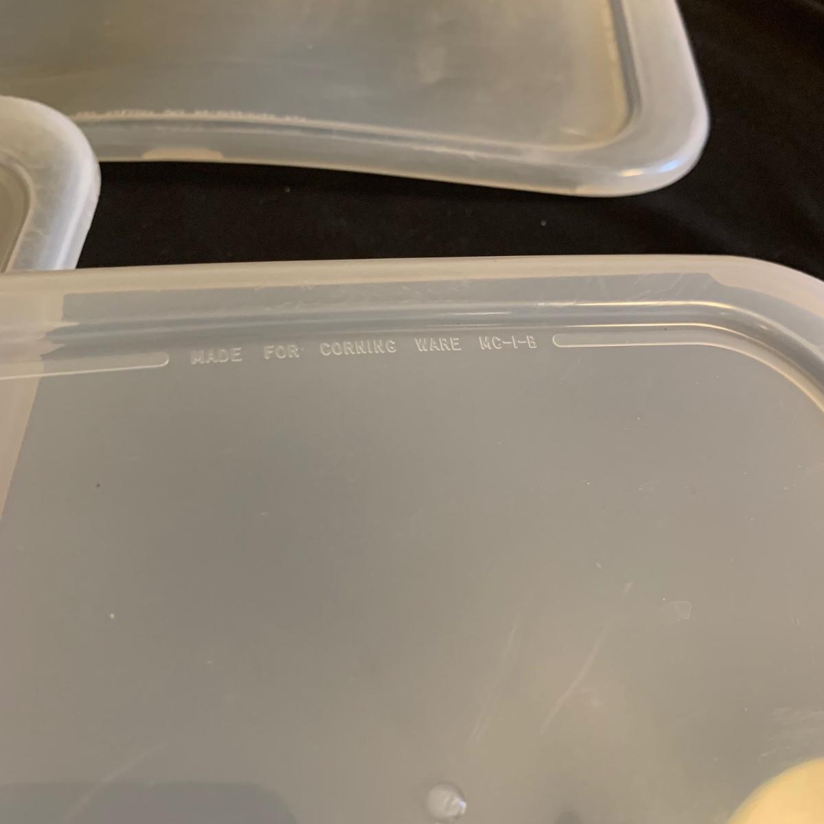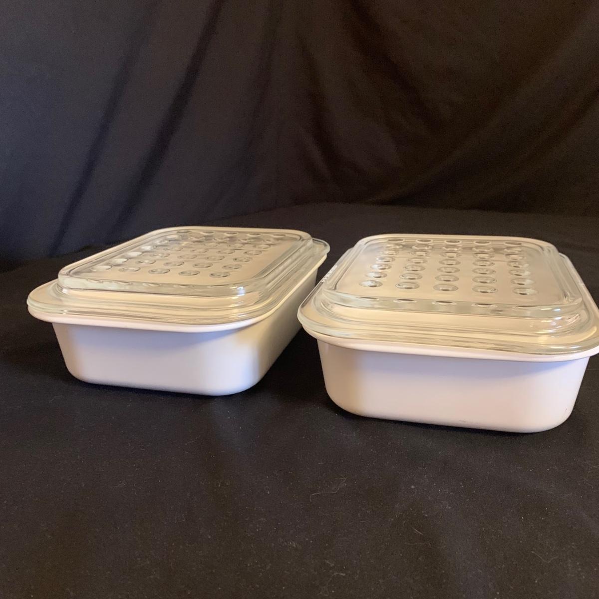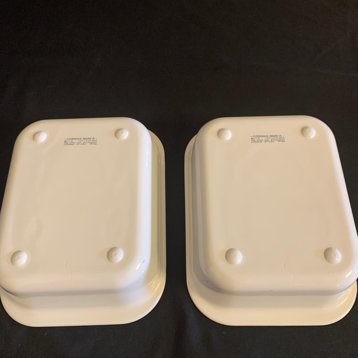 Set of three Corning Ware casserole dishes with Pyrex bubble glass lids. Each dish also comes with a plastic lid for easy transport. Two of the dishes are 7” x 5.5” x 2”. The larger dish is 10.5” x 6.75” x 2”. The dishes and glass lids appear to be in good condition. There is a small scratch in the largest Pyrex lid; see photos. The plastic lids show some wear.
