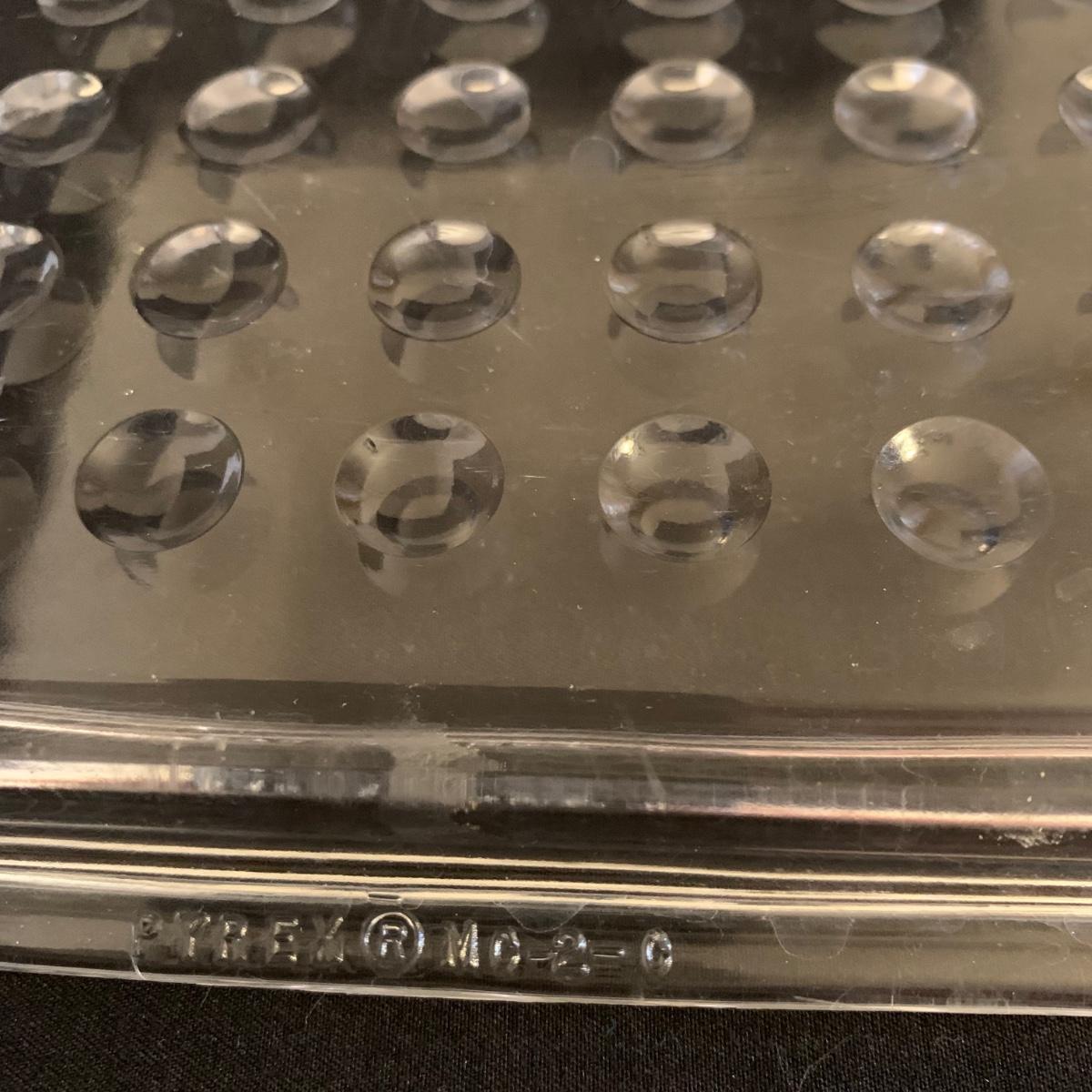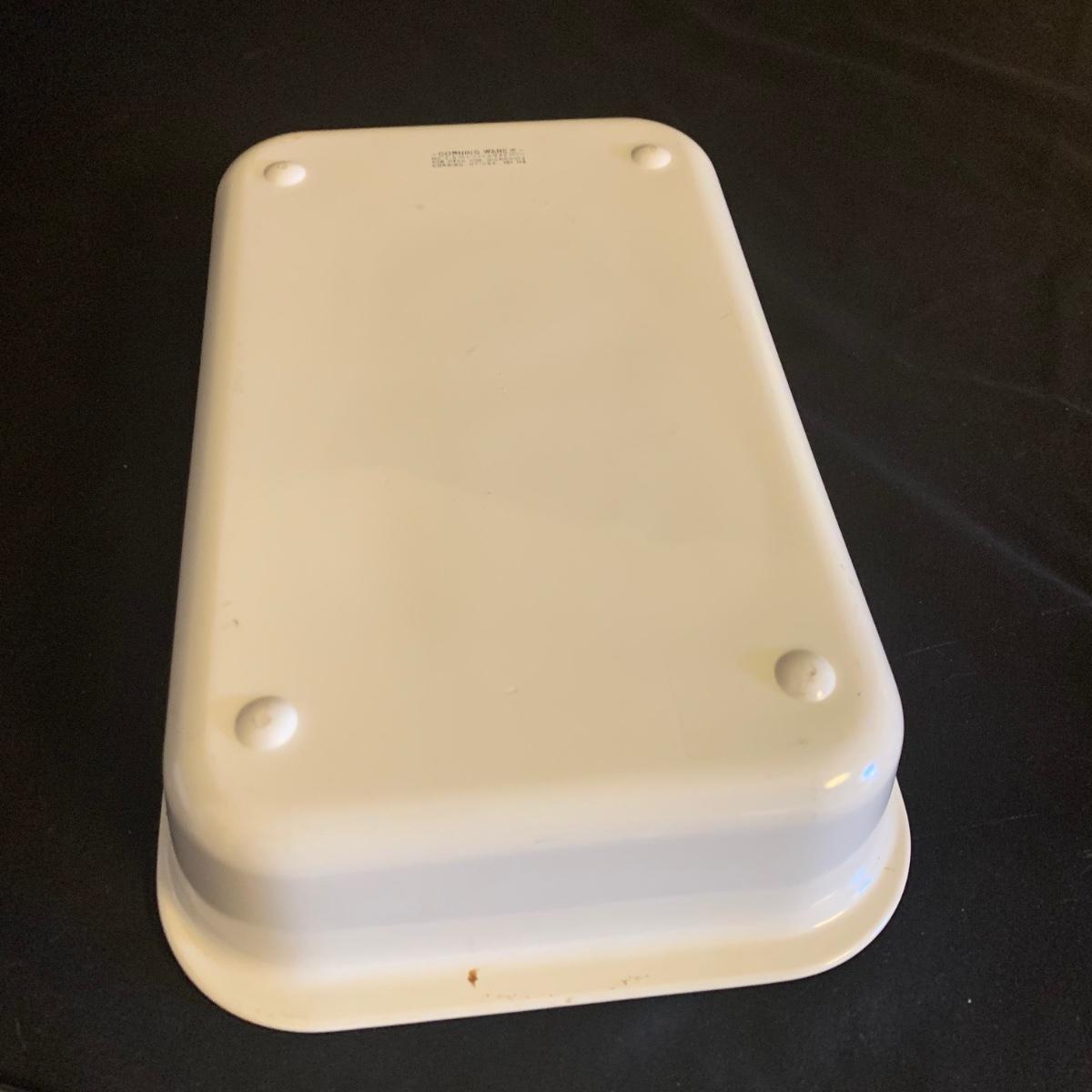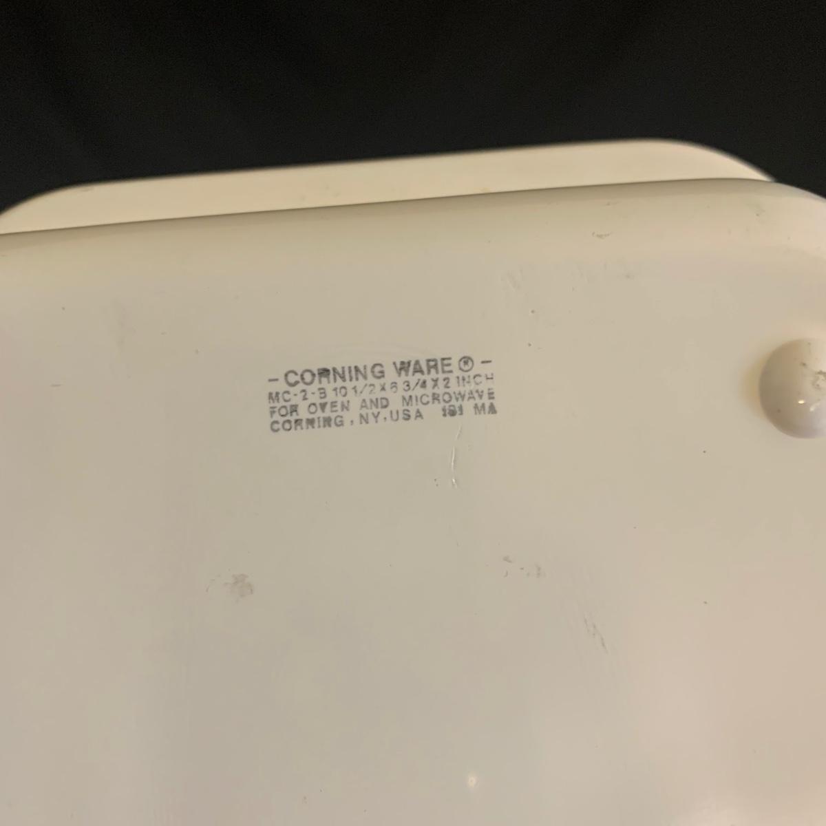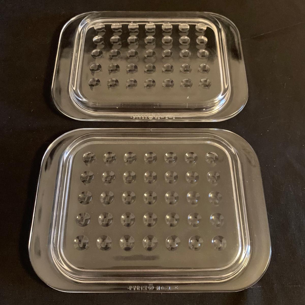 Set of three Corning Ware casserole dishes with Pyrex bubble glass lids. Each dish also comes with a plastic lid for easy transport. Two of the dishes are 7” x 5.5” x 2”. The larger dish is 10.5” x 6.75” x 2”. The dishes and glass lids appear to be in good condition. There is a small scratch in the largest Pyrex lid; see photos. The plastic lids show some wear.