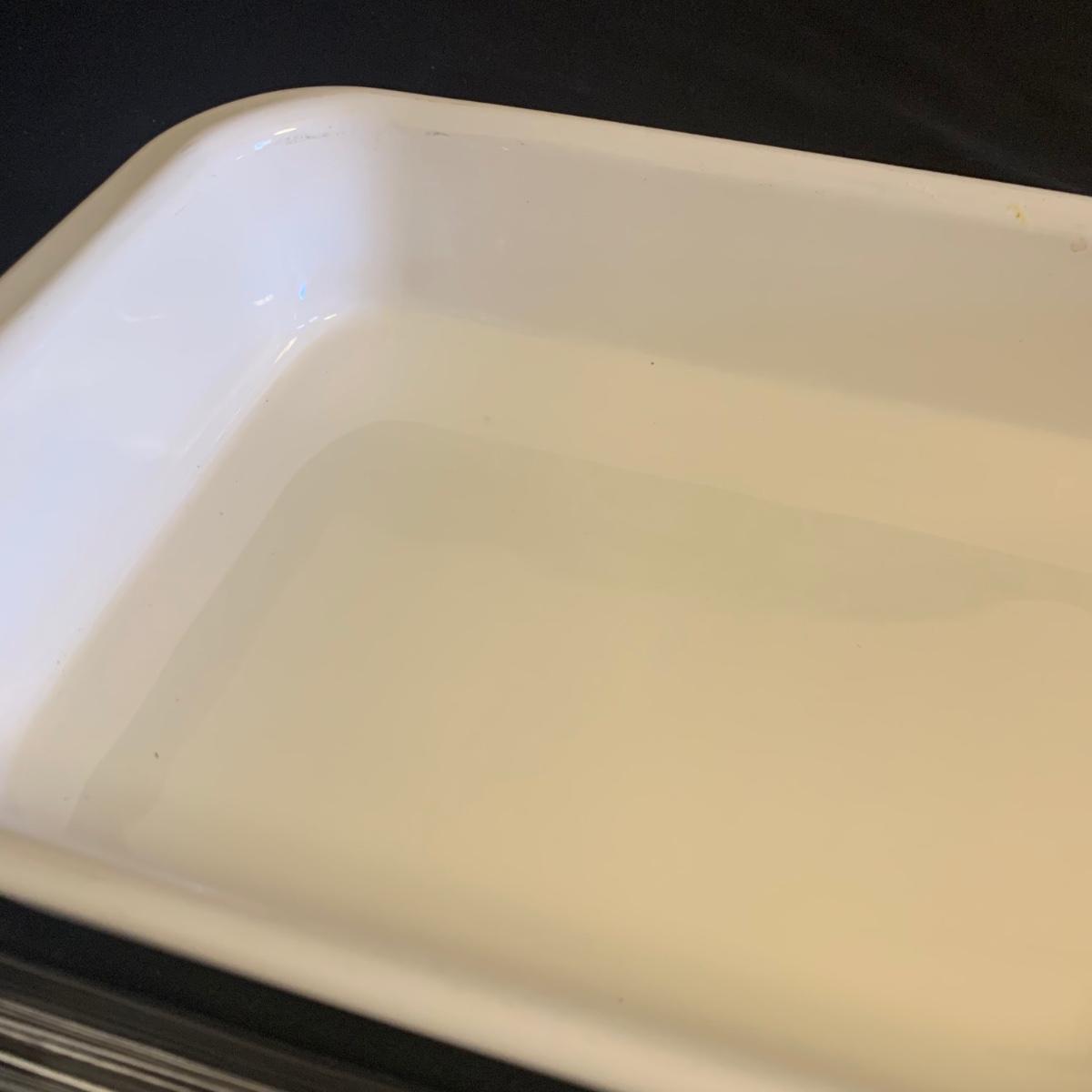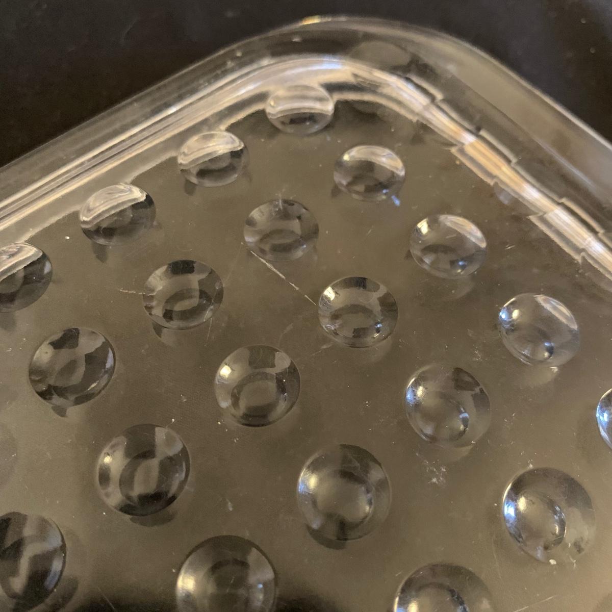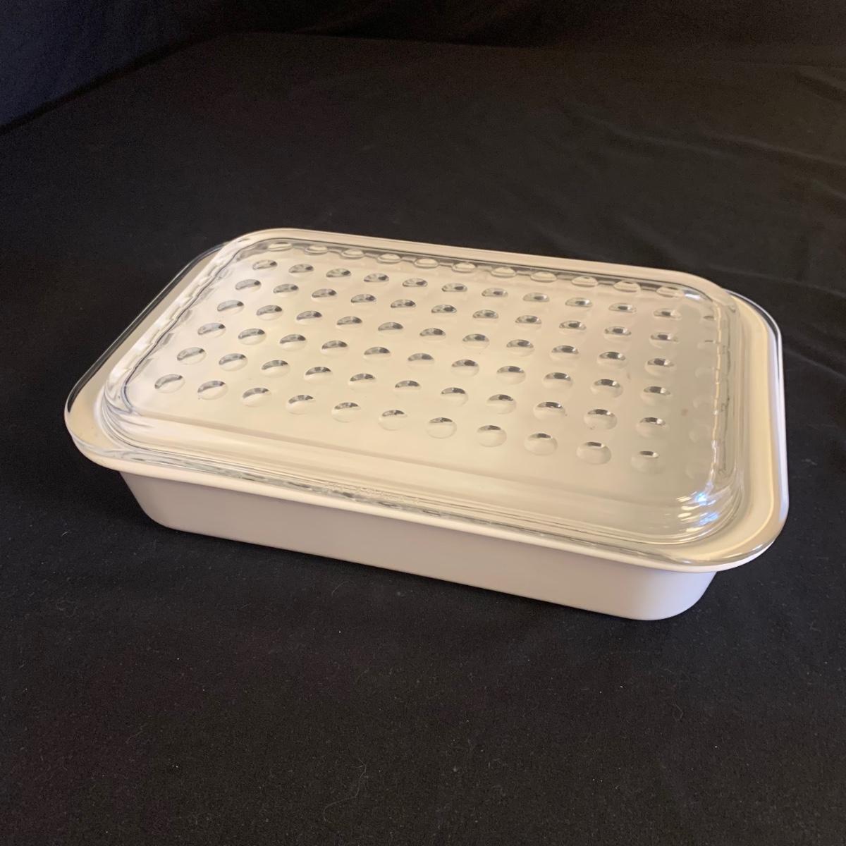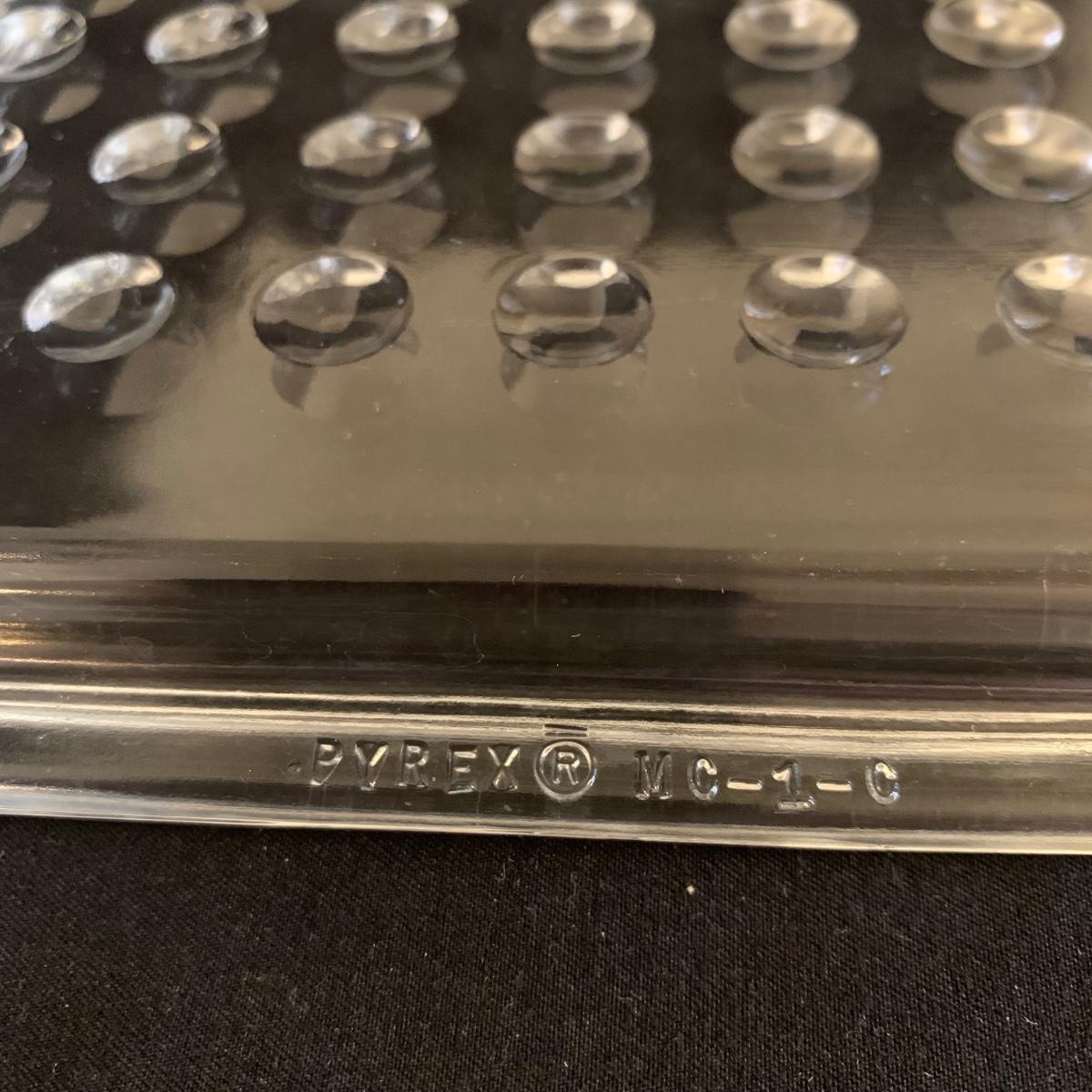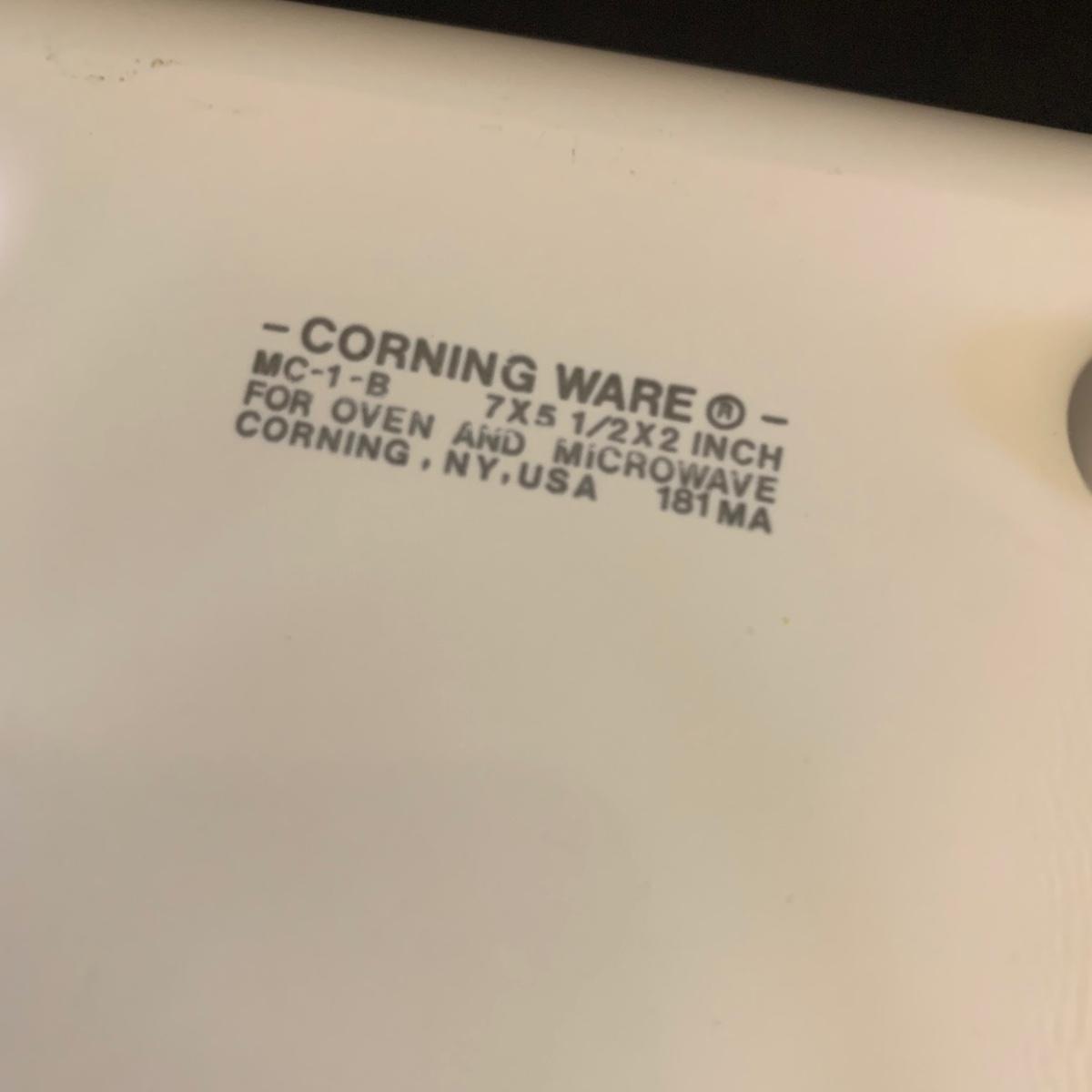 Set of three Corning Ware casserole dishes with Pyrex bubble glass lids. Each dish also comes with a plastic lid for easy transport. Two of the dishes are 7” x 5.5” x 2”. The larger dish is 10.5” x 6.75” x 2”. The dishes and glass lids appear to be in good condition. There is a small scratch in the largest Pyrex lid; see photos. The plastic lids show some wear.