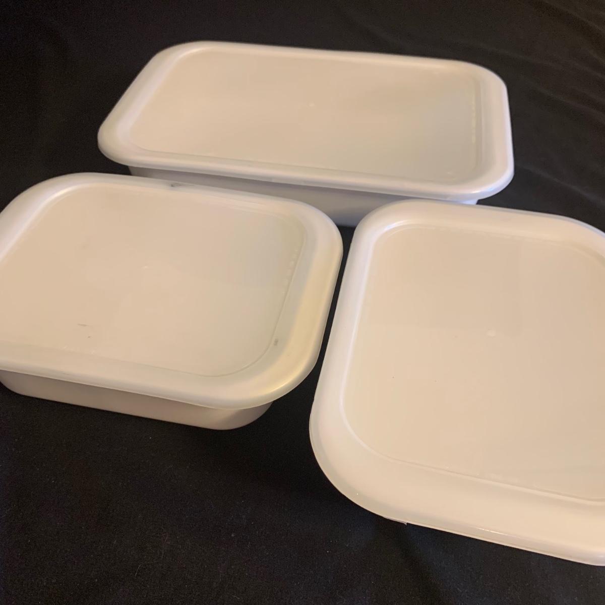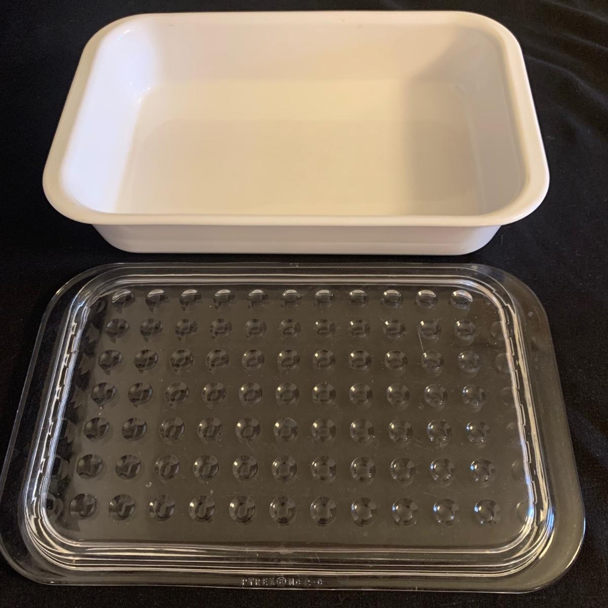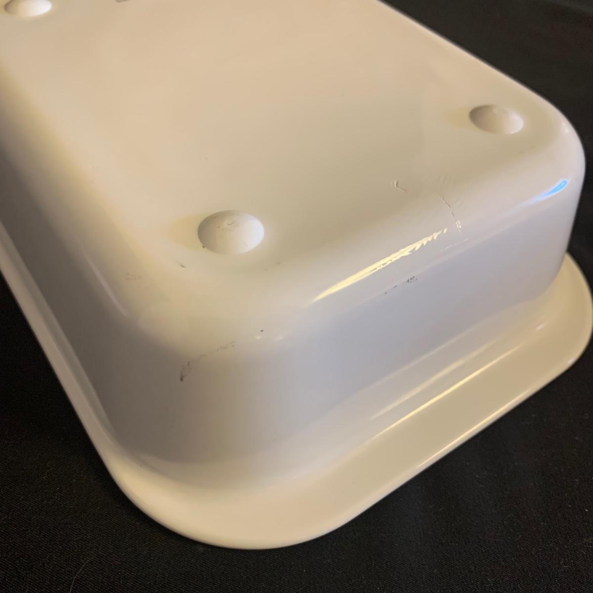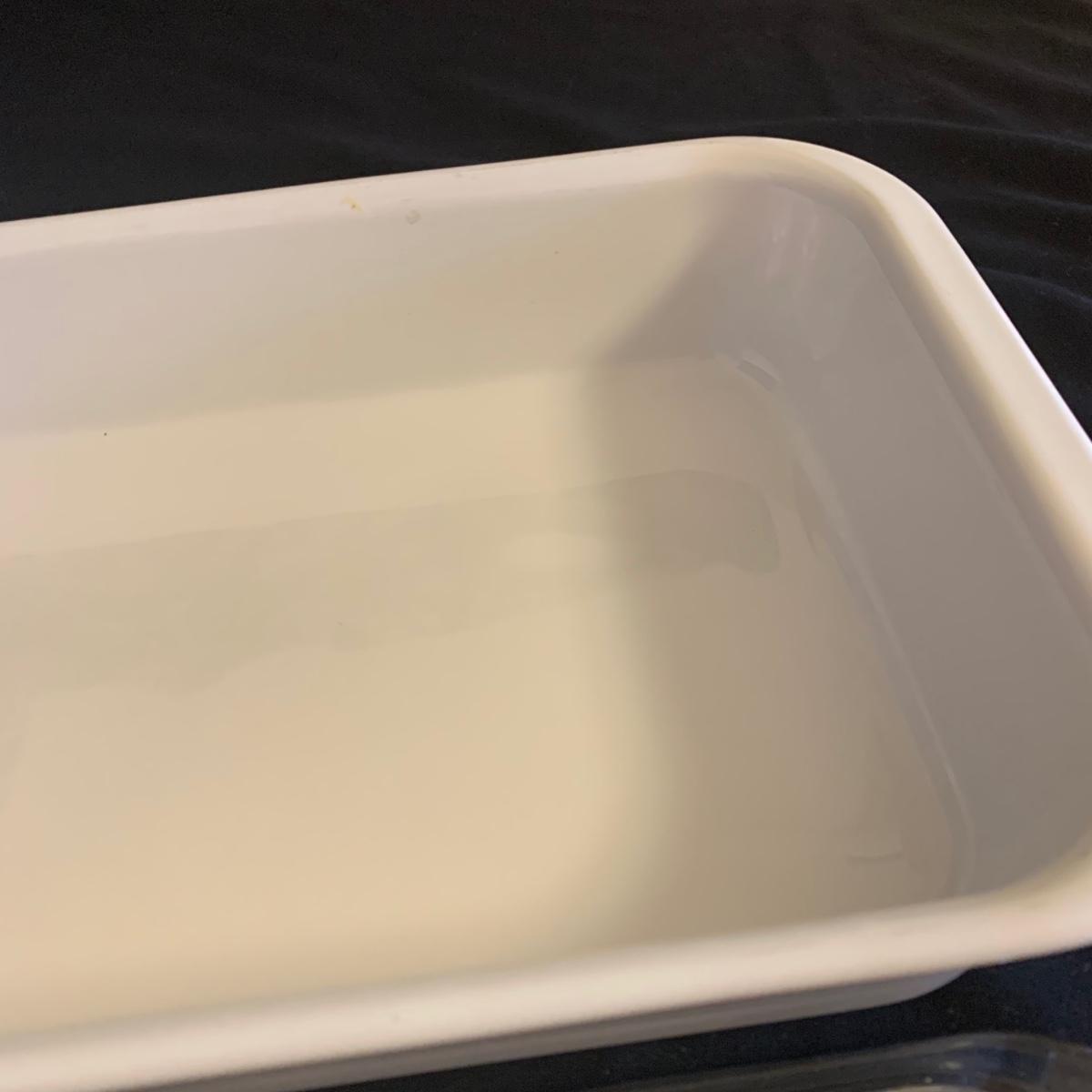 Set of three Corning Ware casserole dishes with Pyrex bubble glass lids. Each dish also comes with a plastic lid for easy transport. Two of the dishes are 7” x 5.5” x 2”. The larger dish is 10.5” x 6.75” x 2”. The dishes and glass lids appear to be in good condition. There is a small scratch in the largest Pyrex lid; see photos. The plastic lids show some wear.