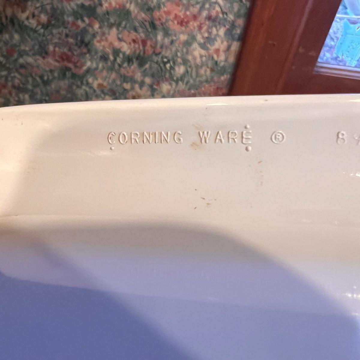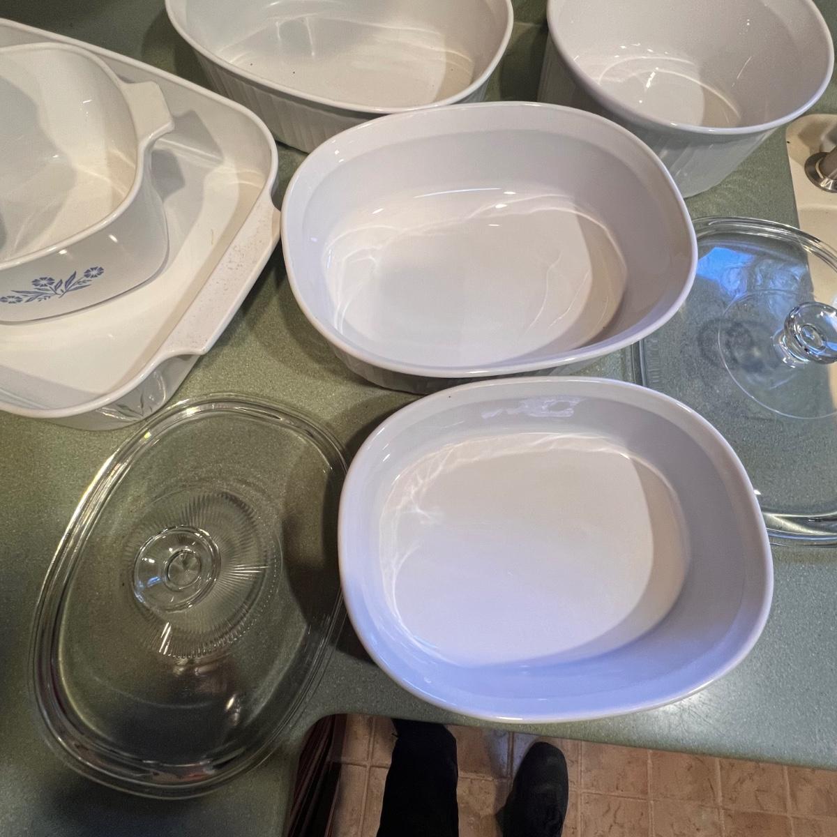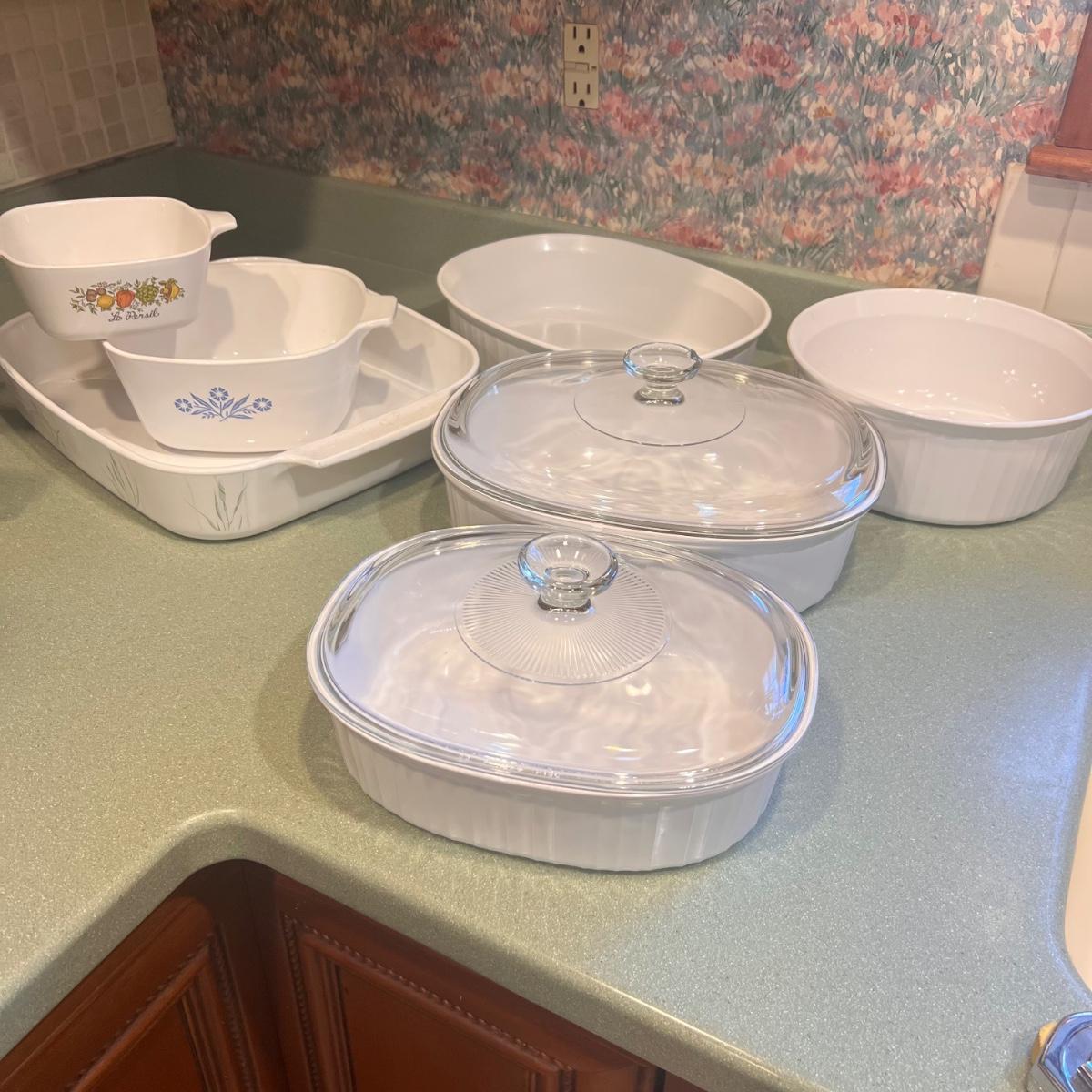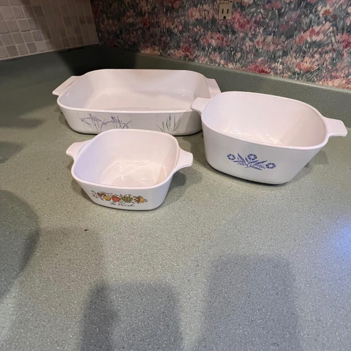 Seven pieces of Corning Ware plus lids; see images as only two have lids (replacements available on many websites). The largest dish is the casserole dish with Shadow Iris design which measures 10” x 14” x 2.5”H.