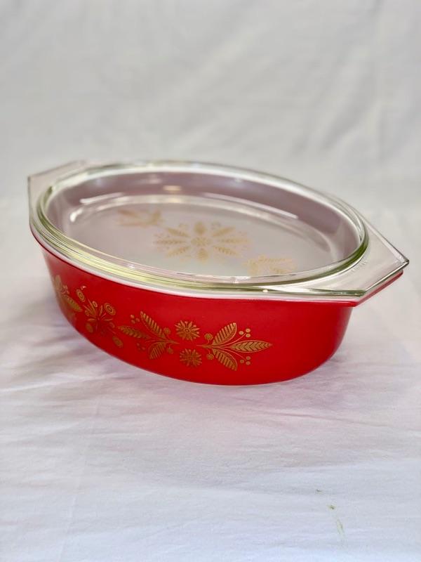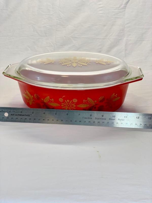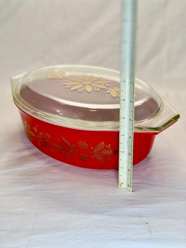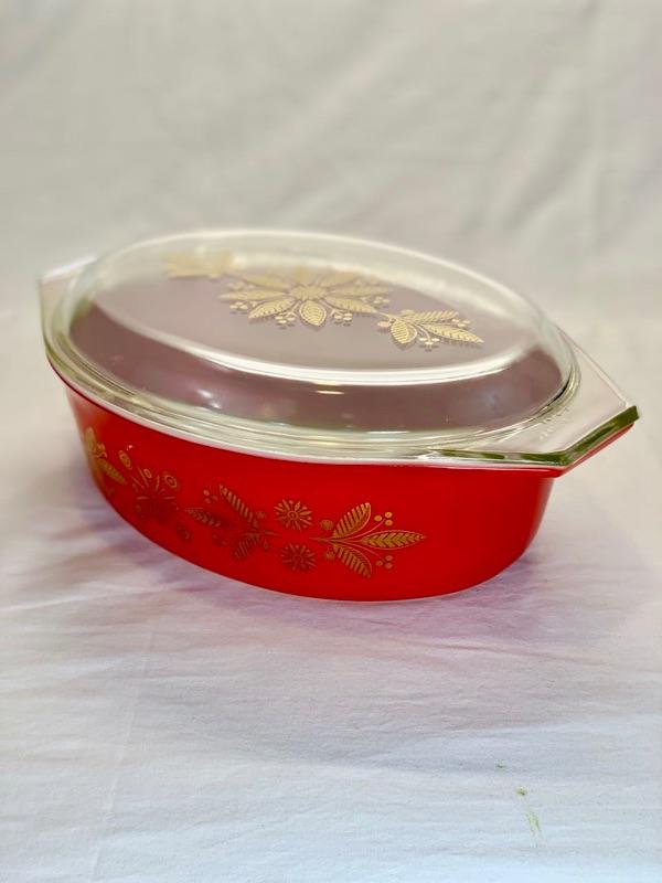 Vintage Pyrex oval 2 1/2 quart red with golden leaf poinsettia covered dish with clear lid. Shipping available for extra cost.