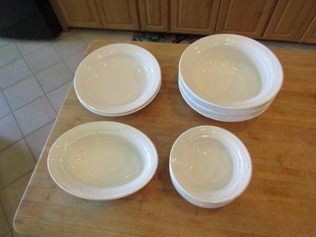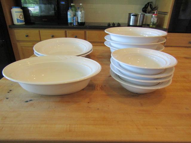 Corning White Flora Pattern- 10 Pieces. 1- 12" x 9". 4- 8" Bowls, 3- 11 3/4" Bowls, 2- 12" Bowls