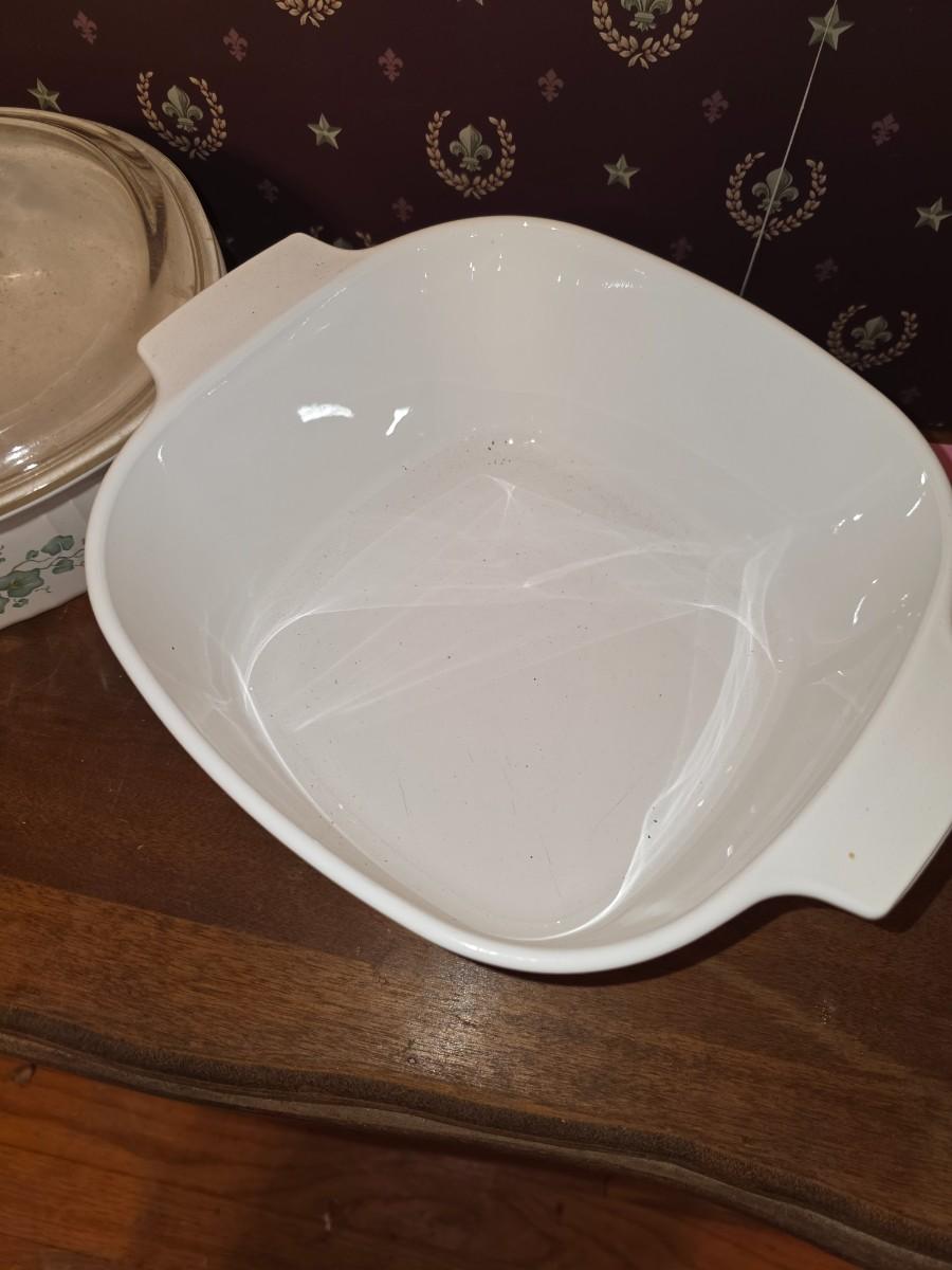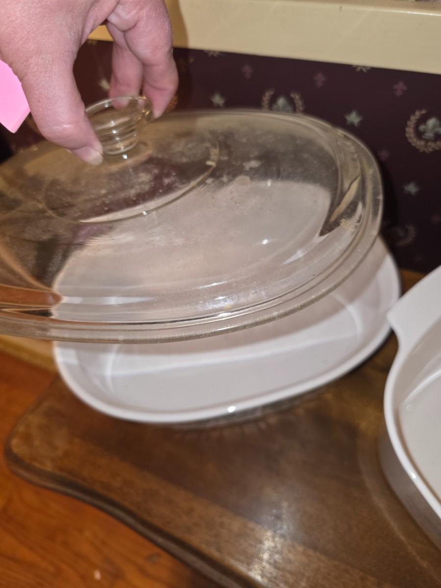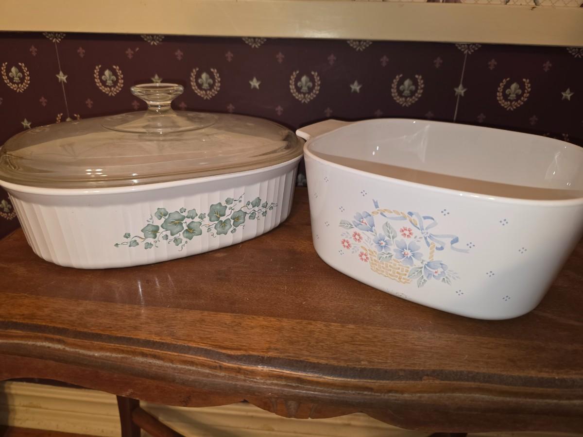 Different patterns same great cooking. Oval dish has a lid and there doesn't appear to be in cracks