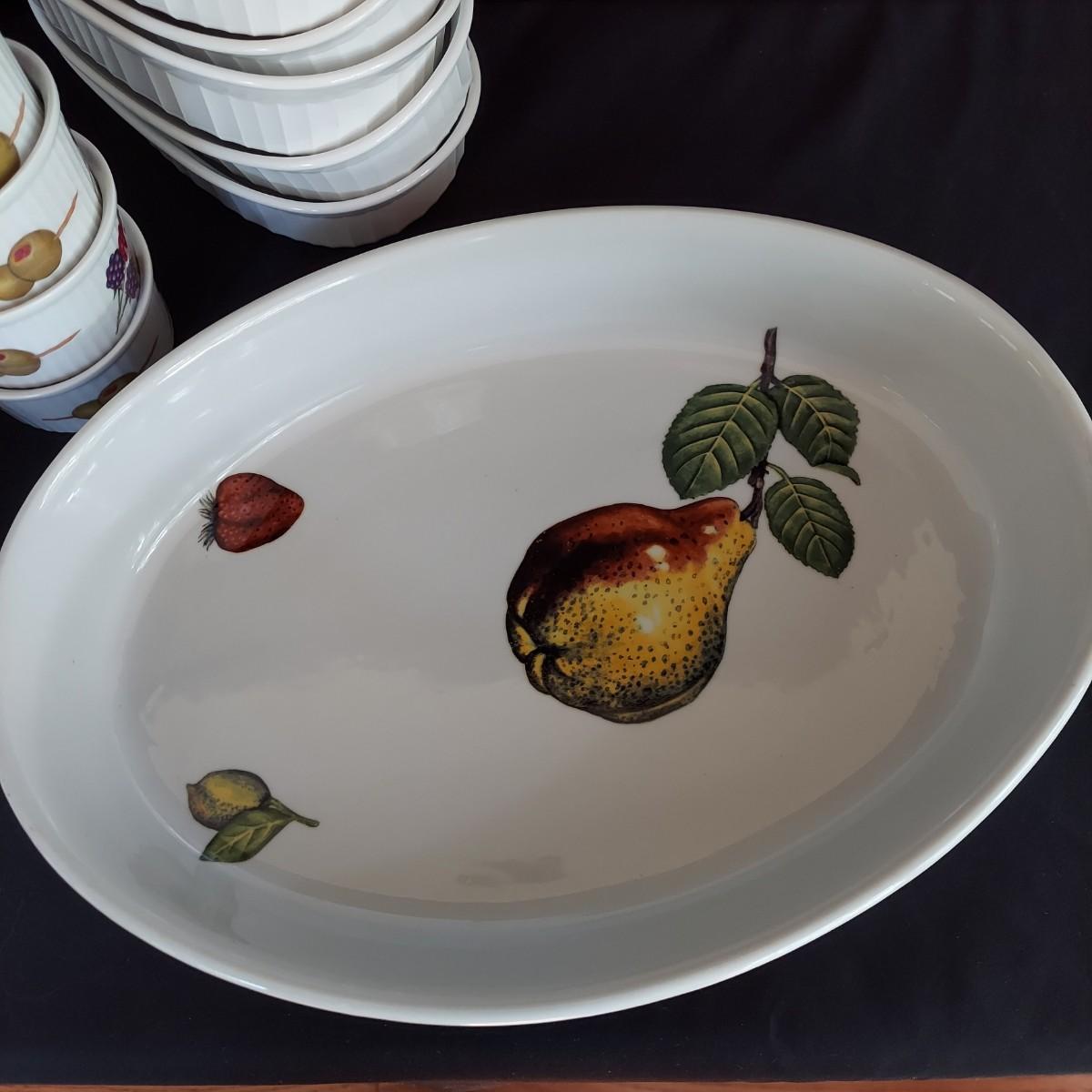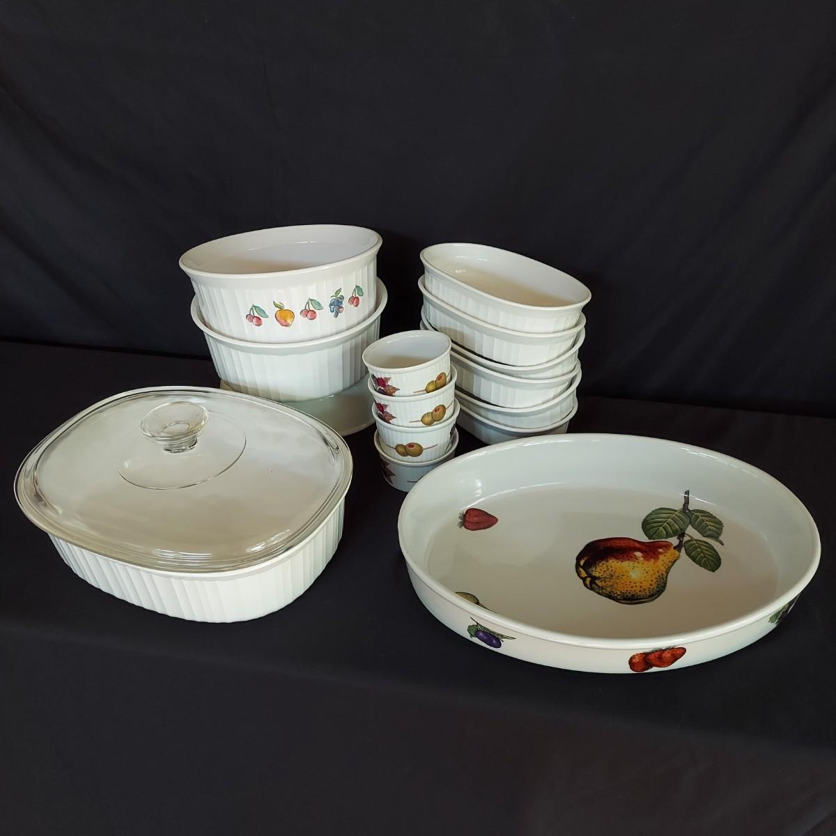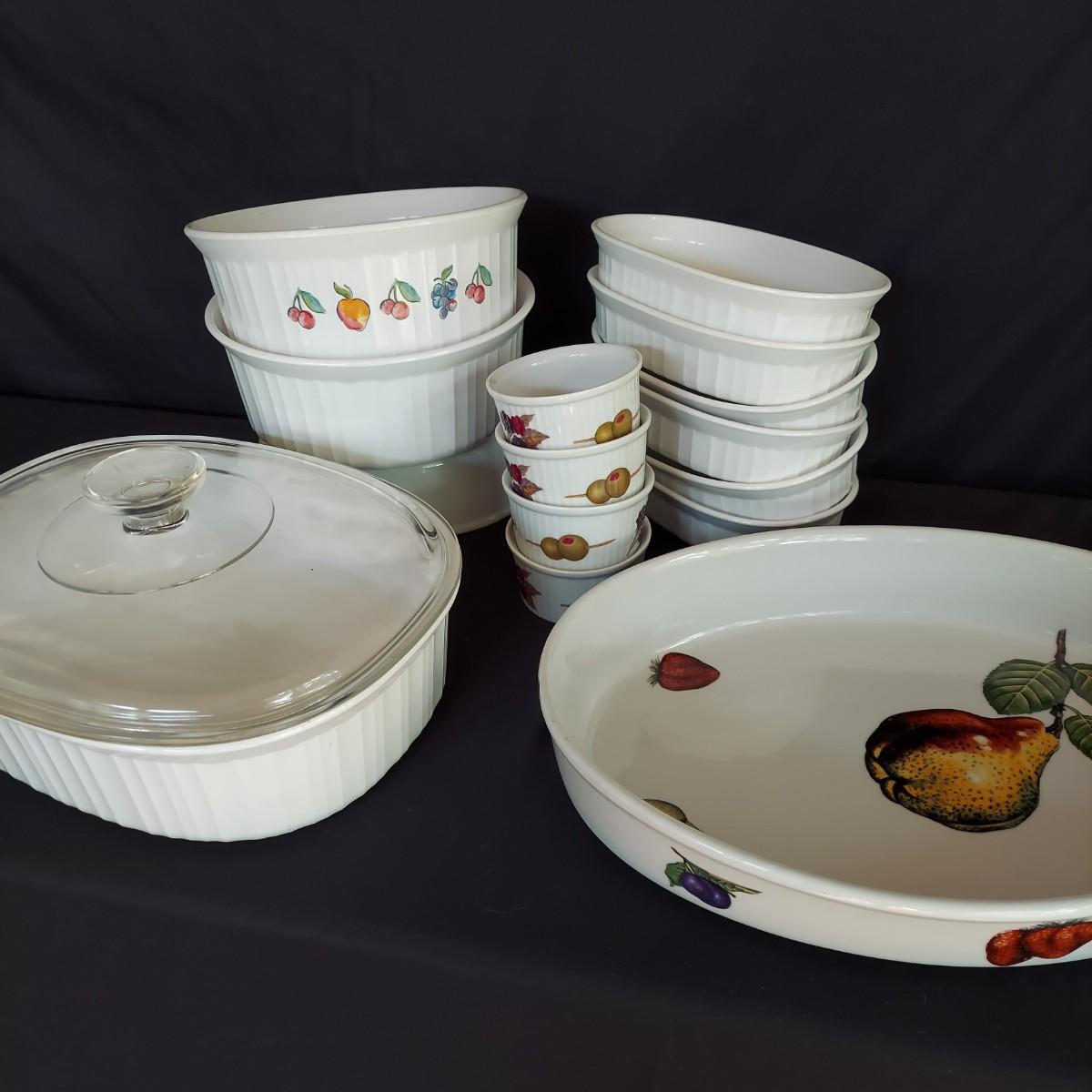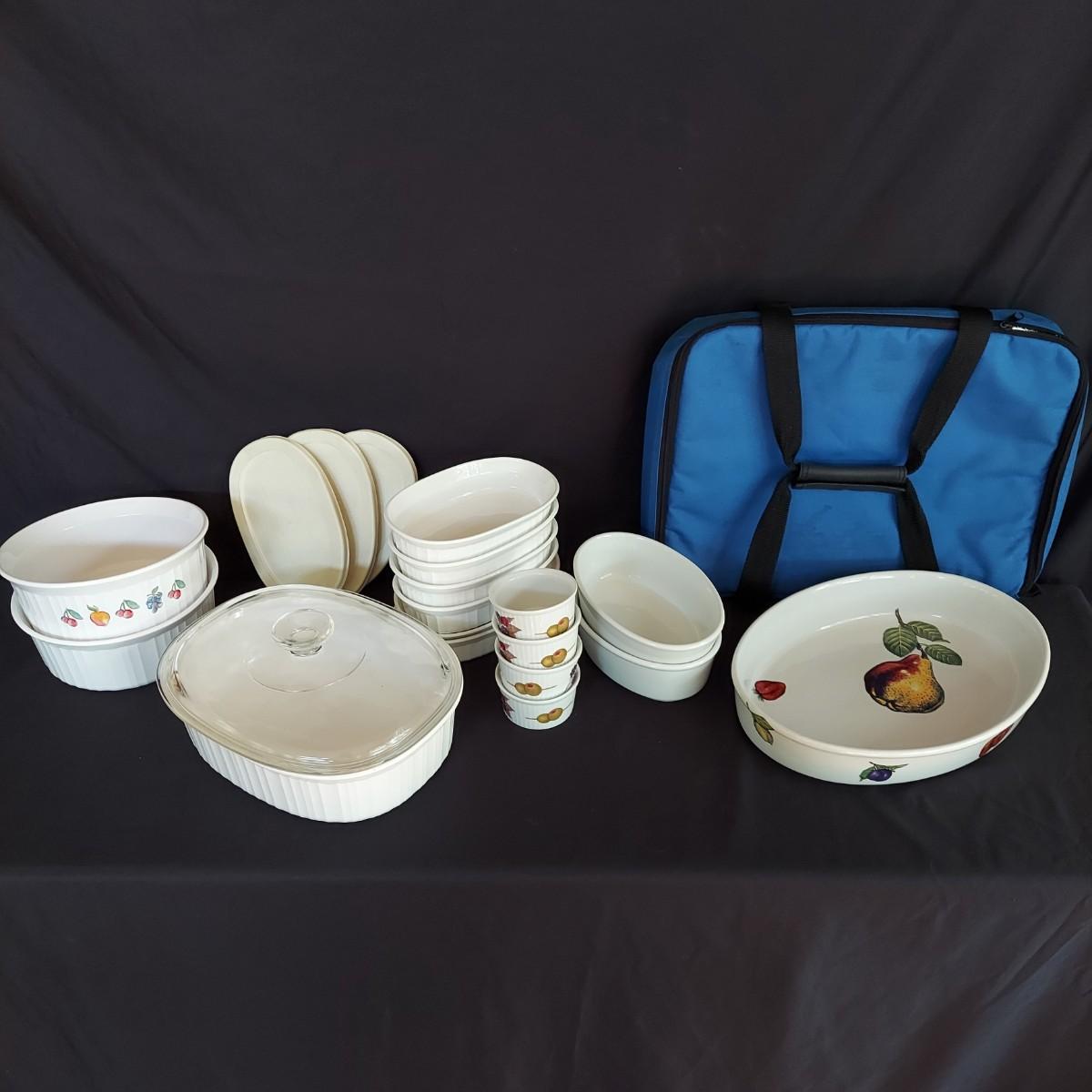 Several white baking dishes and ramekins by Corningware with an insulated carrying case that measures 16" x 12" x 2"H. Lot features four Royal Worcester Evesham 'M' dishes. The large fruit printed dish is 13" long. Local Pickup Only.
