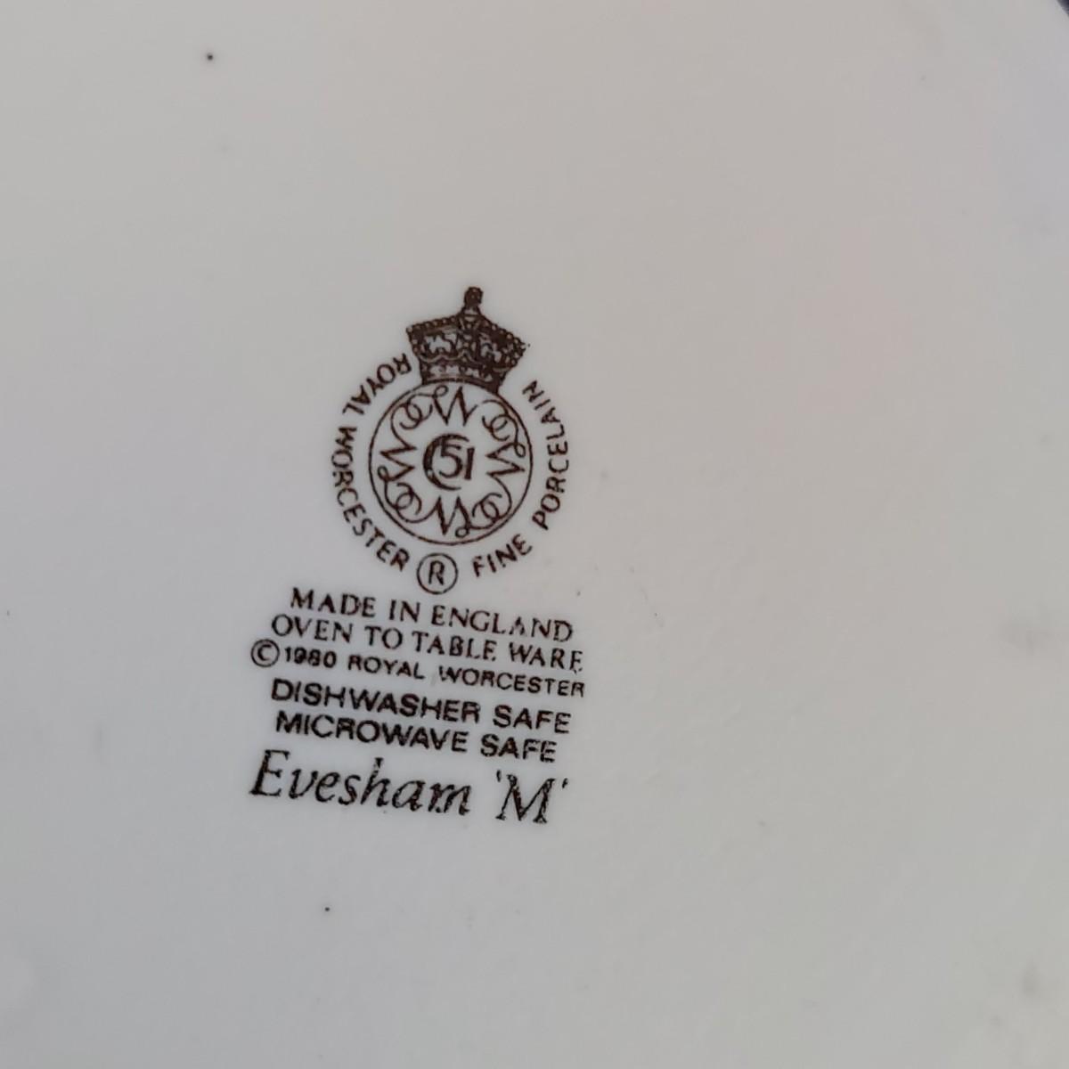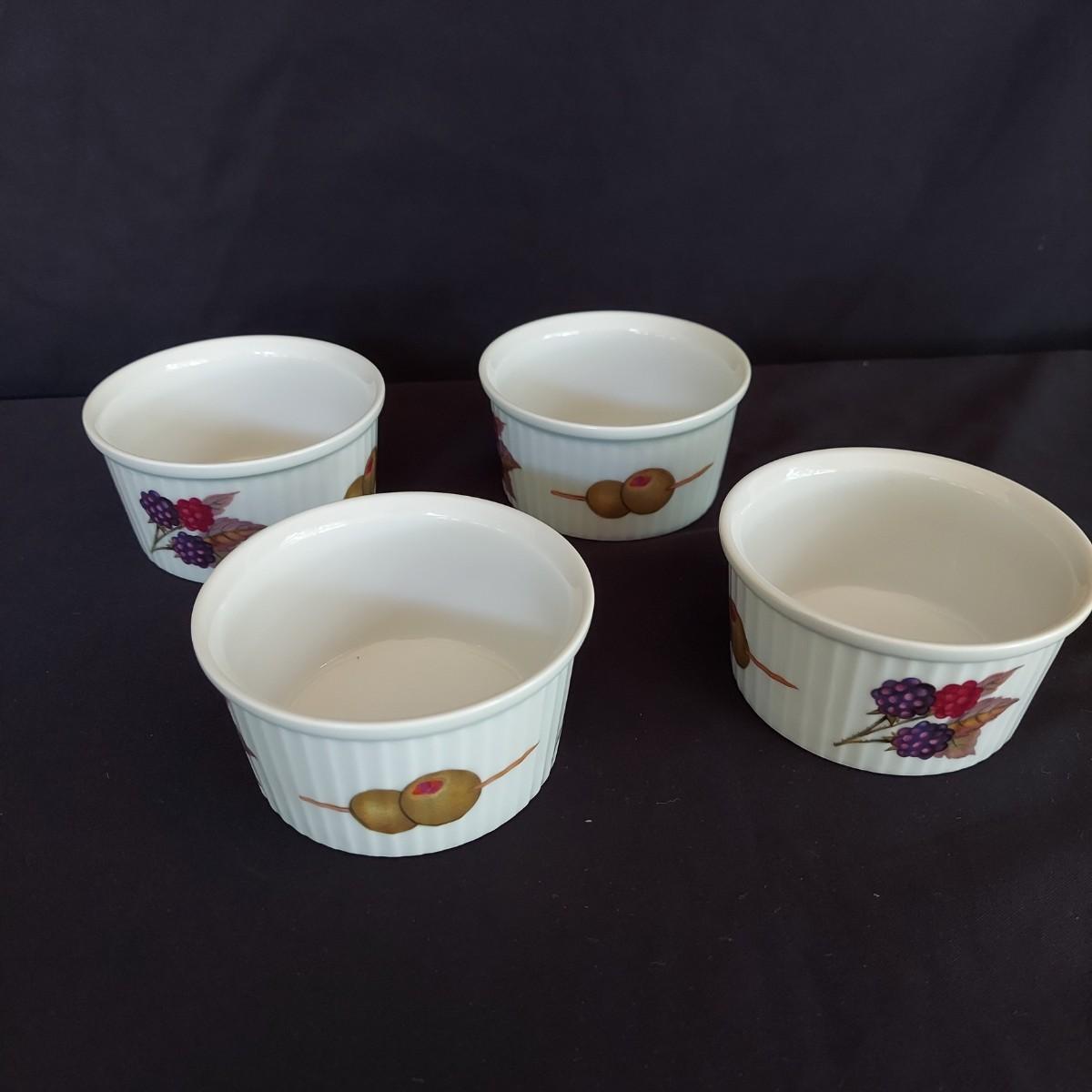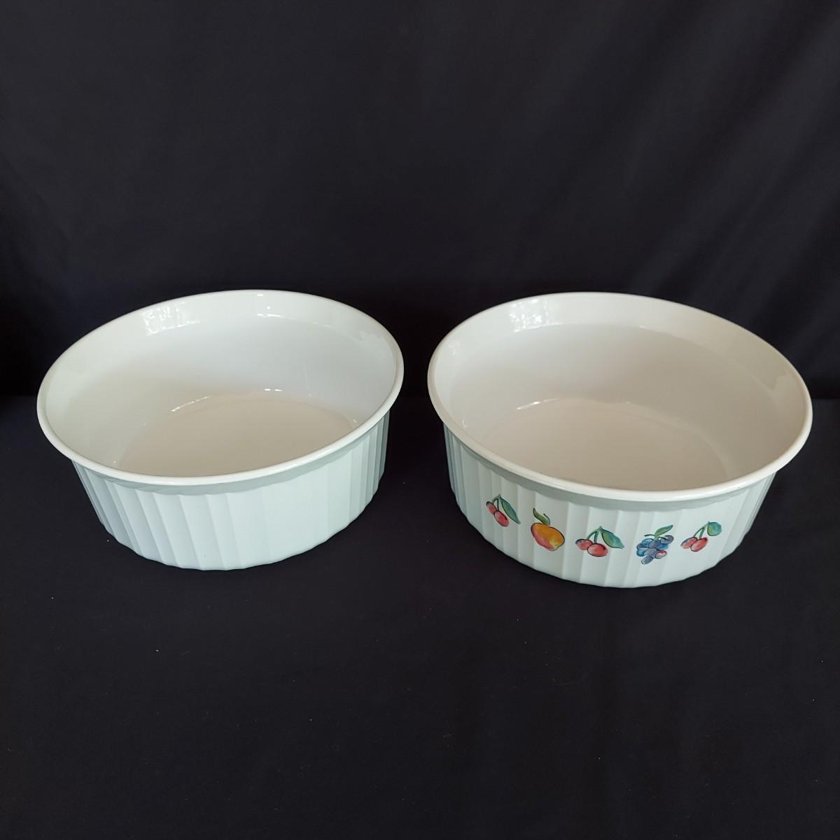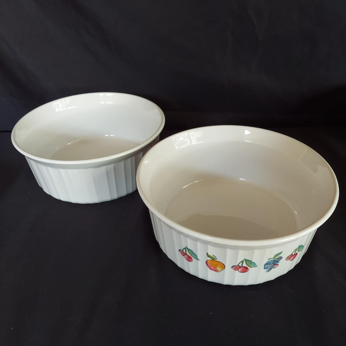 Several white baking dishes and ramekins by Corningware with an insulated carrying case that measures 16" x 12" x 2"H. Lot features four Royal Worcester Evesham 'M' dishes. The large fruit printed dish is 13" long. Local Pickup Only.