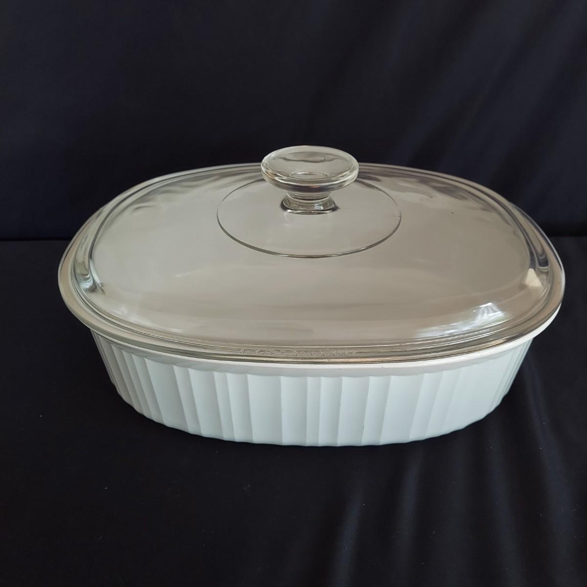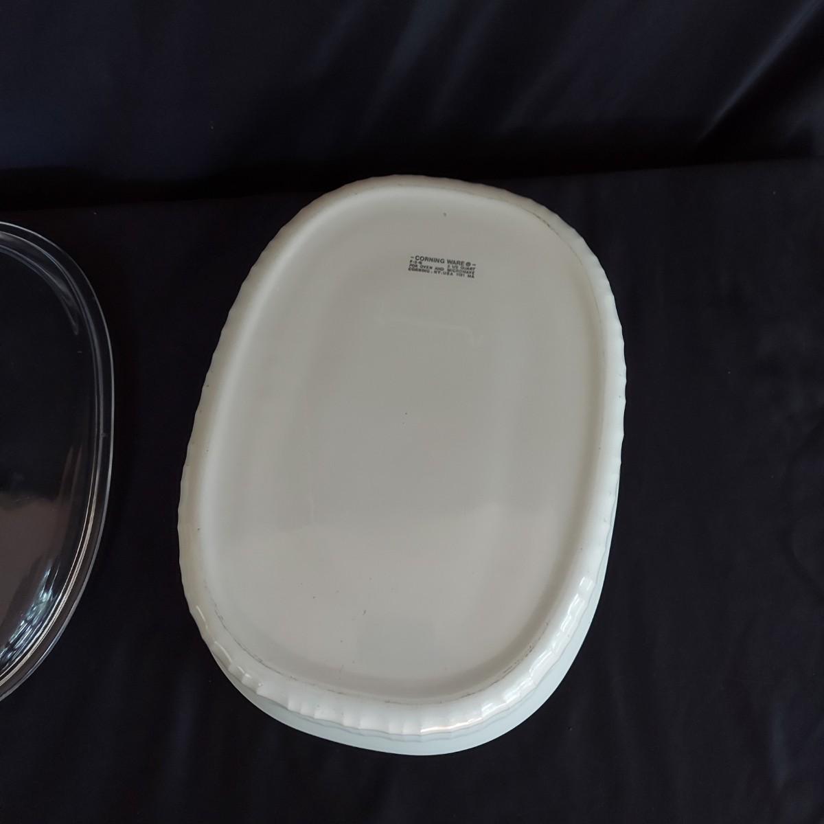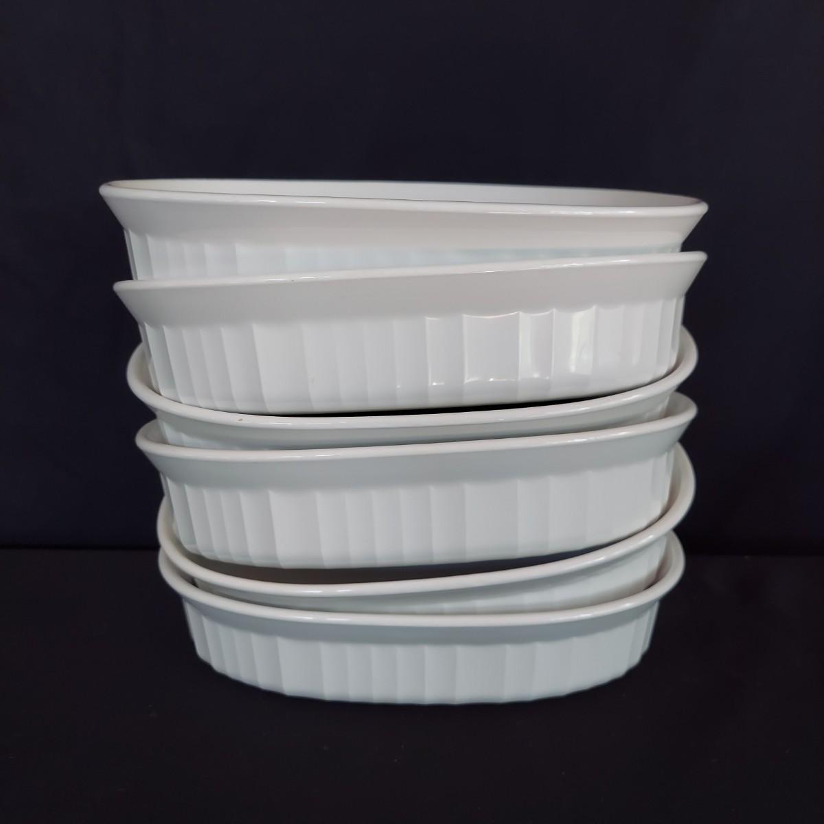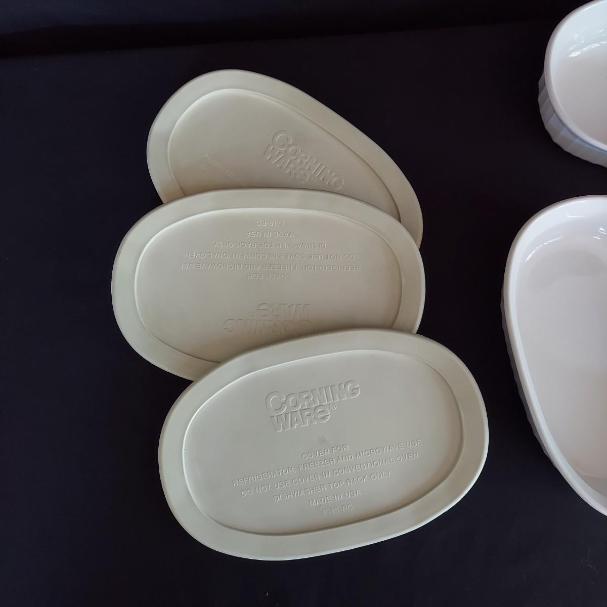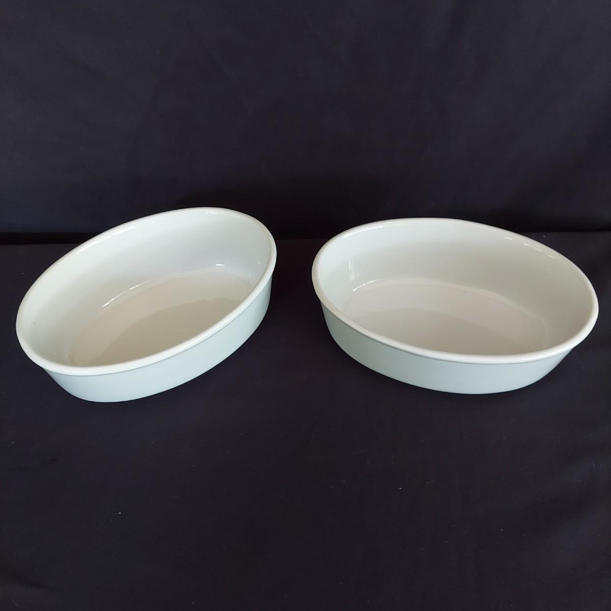 Several white baking dishes and ramekins by Corningware with an insulated carrying case that measures 16" x 12" x 2"H. Lot features four Royal Worcester Evesham 'M' dishes. The large fruit printed dish is 13" long. Local Pickup Only.
