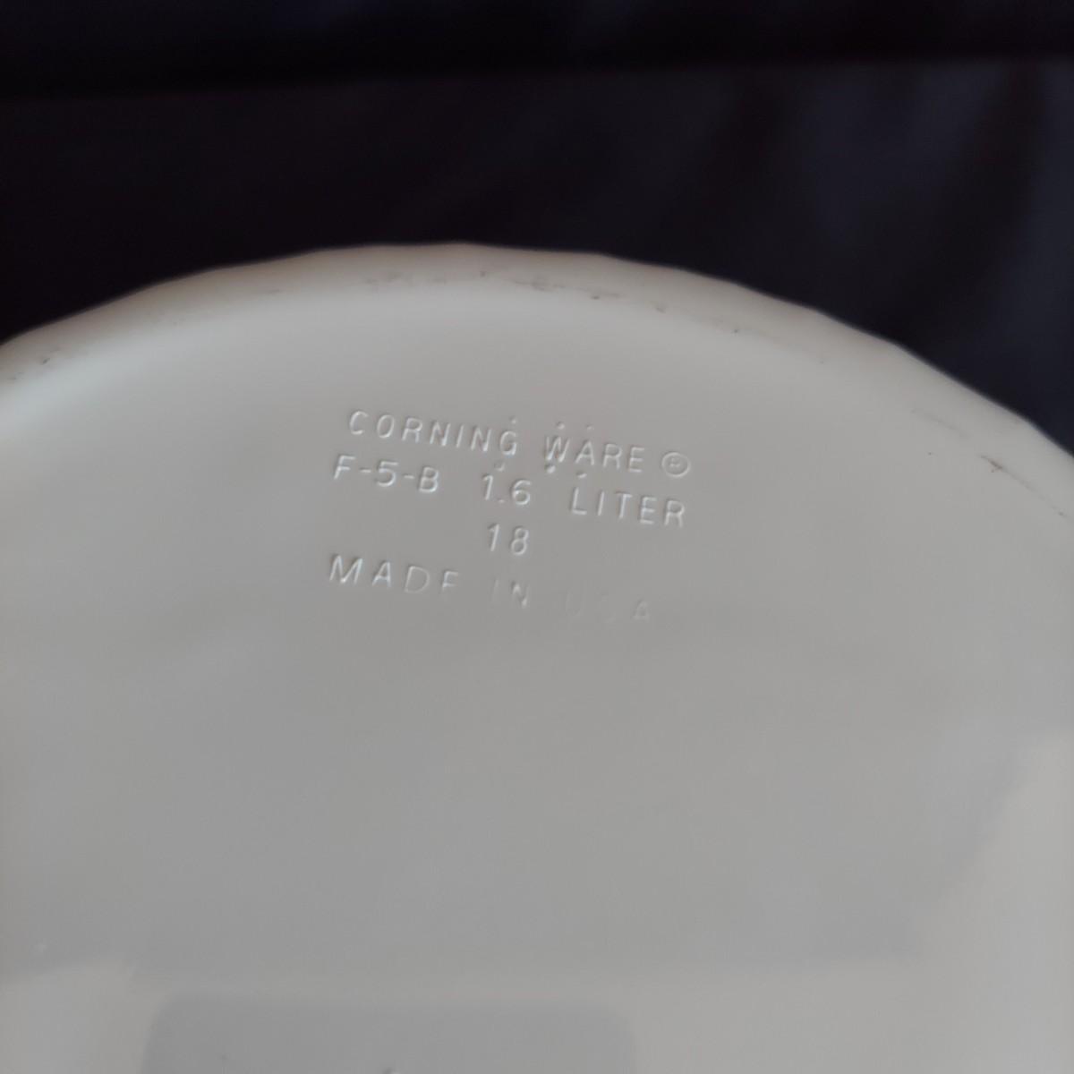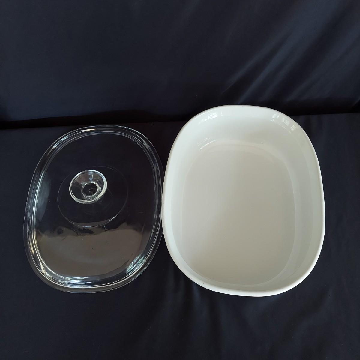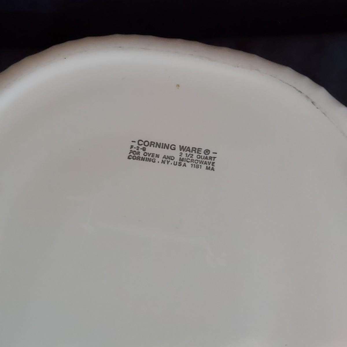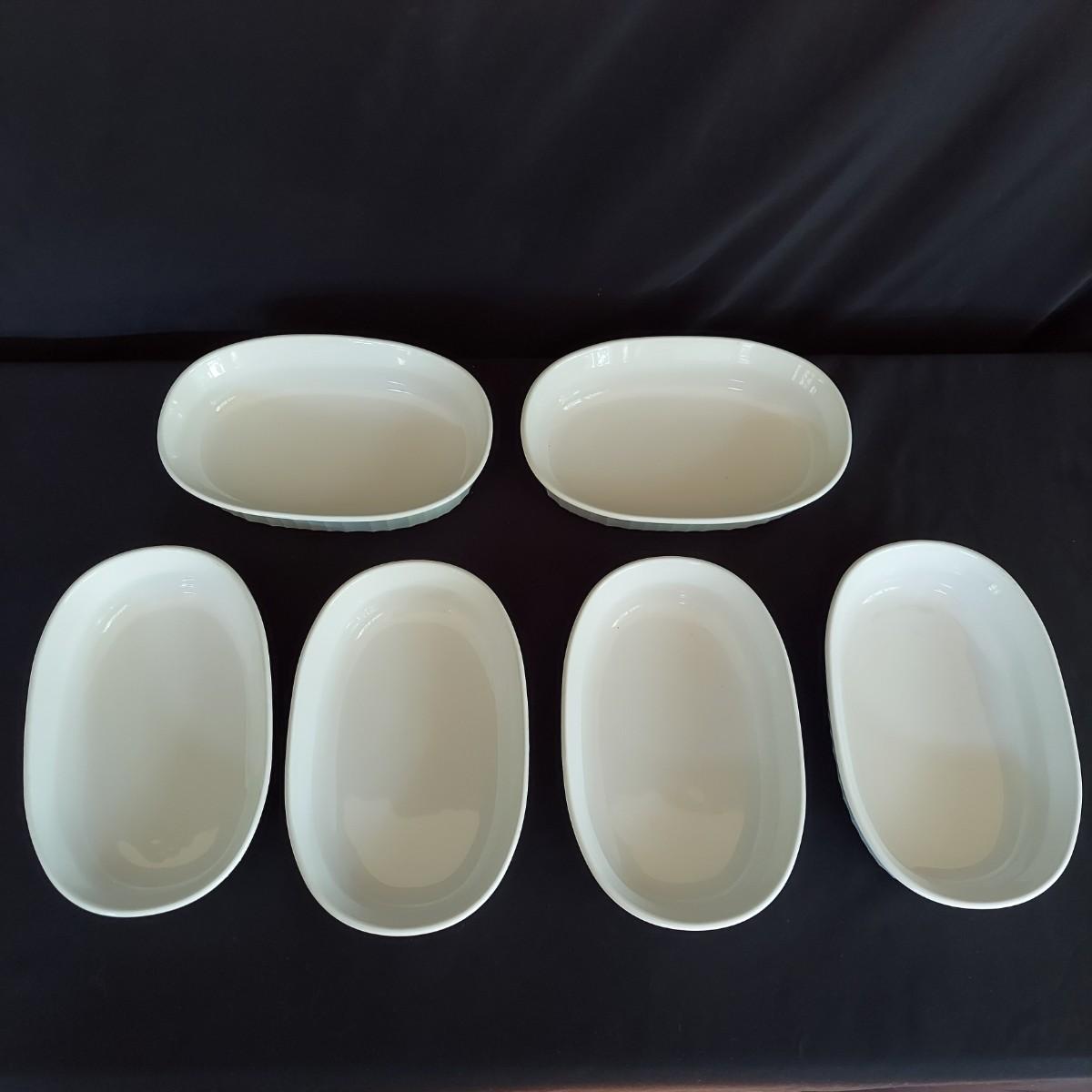 Several white baking dishes and ramekins by Corningware with an insulated carrying case that measures 16" x 12" x 2"H. Lot features four Royal Worcester Evesham 'M' dishes. The large fruit printed dish is 13" long. Local Pickup Only.