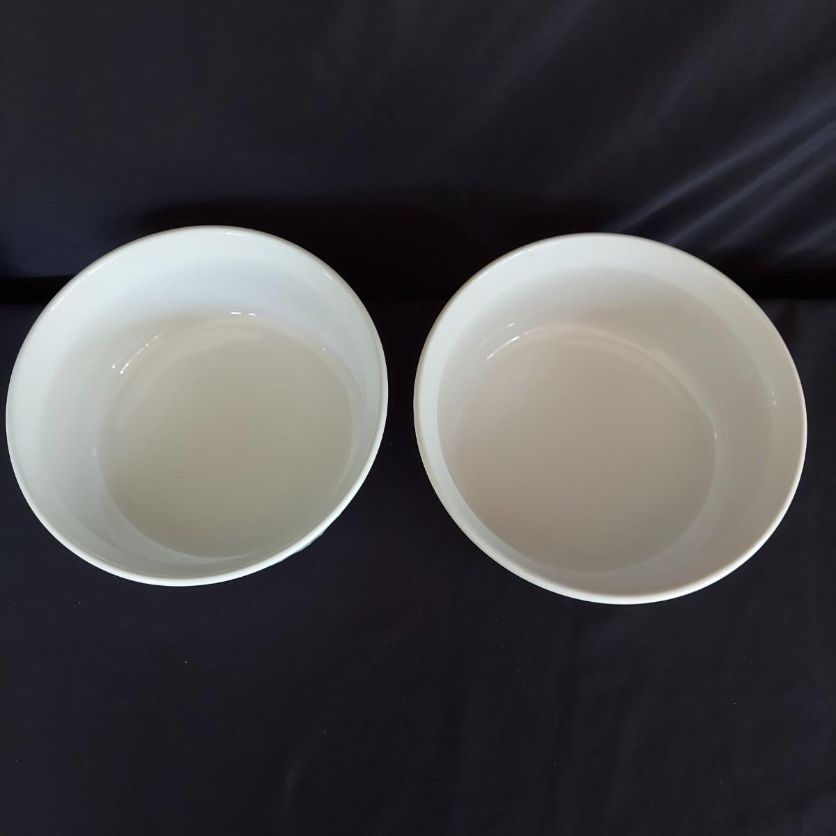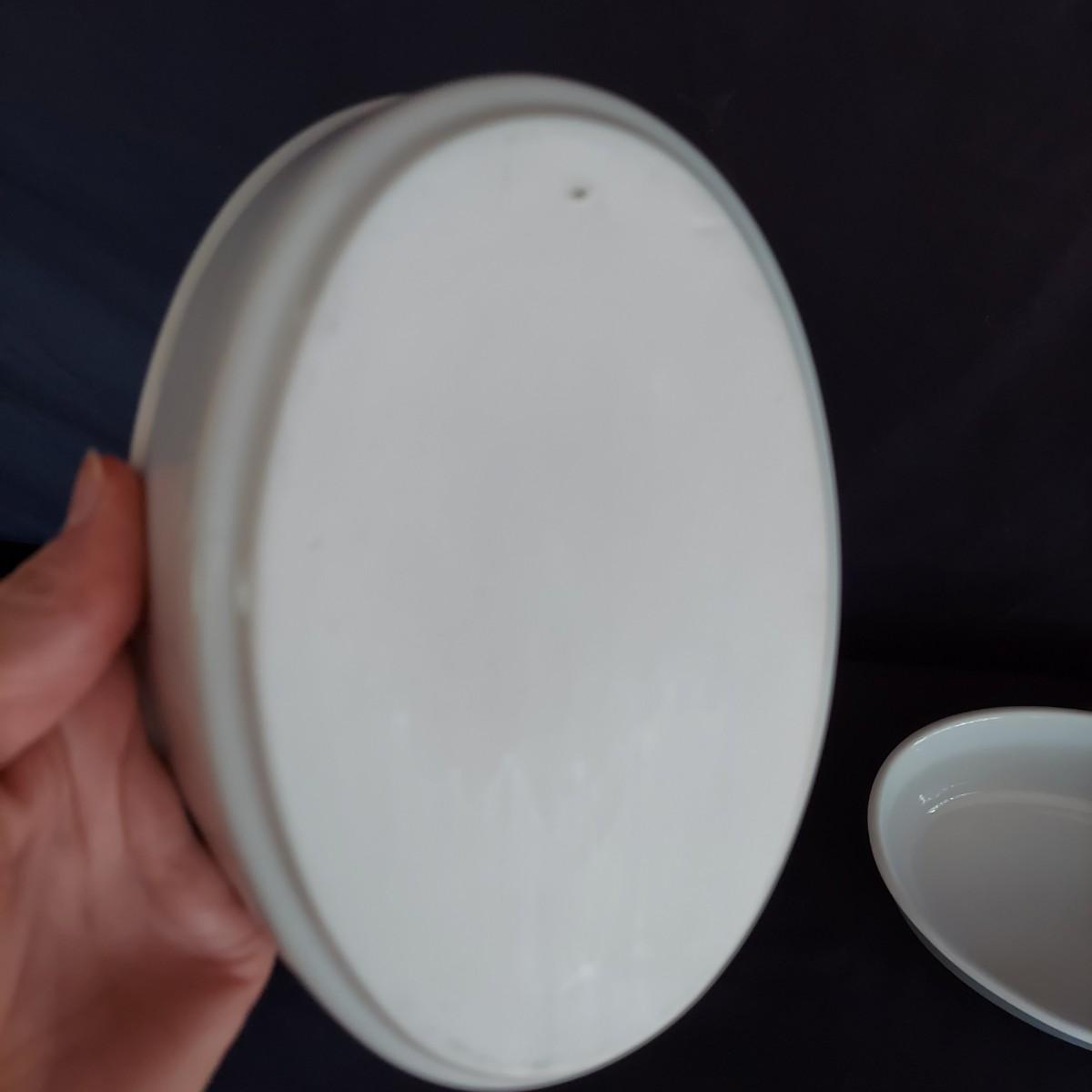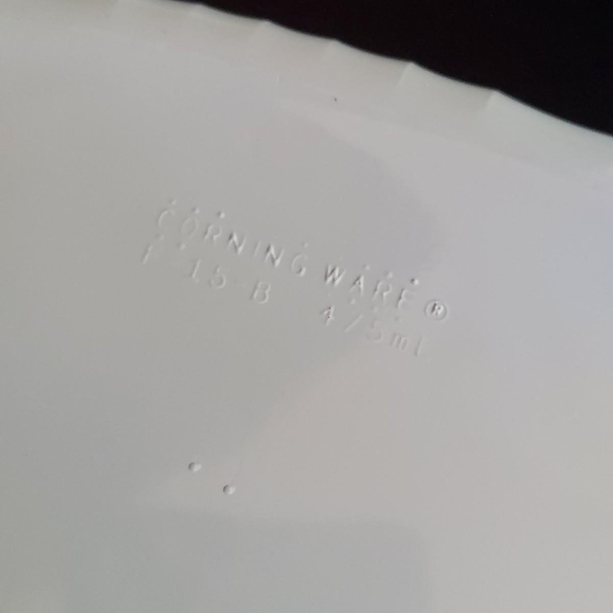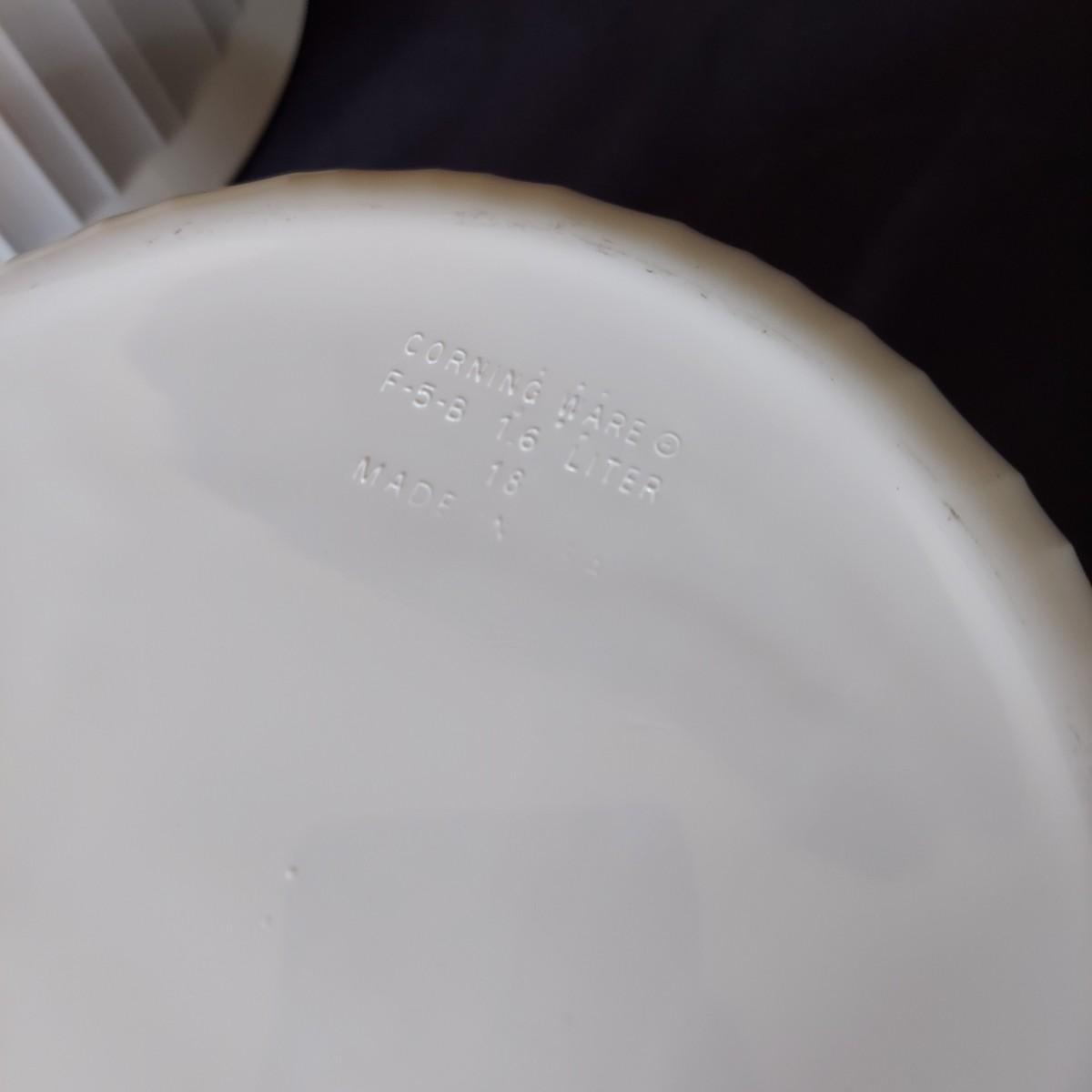 Several white baking dishes and ramekins by Corningware with an insulated carrying case that measures 16" x 12" x 2"H. Lot features four Royal Worcester Evesham 'M' dishes. The large fruit printed dish is 13" long. Local Pickup Only.