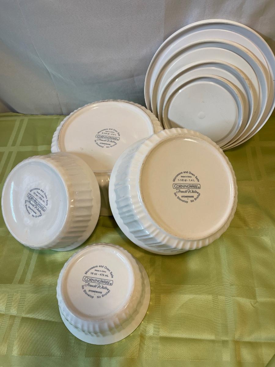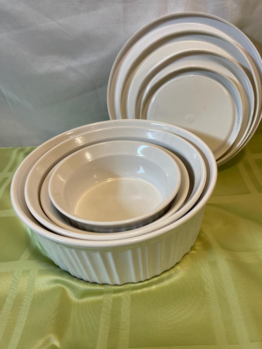 White CorningWare bowls and covers, set of 4 bowls and 4 covers.