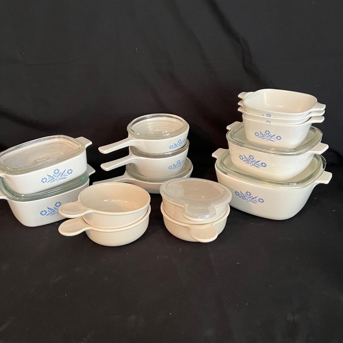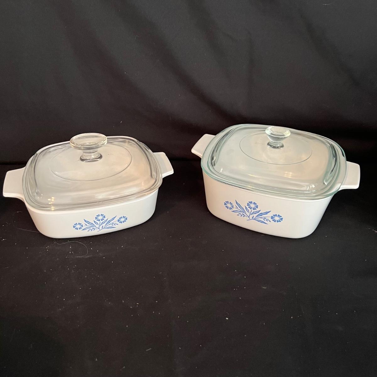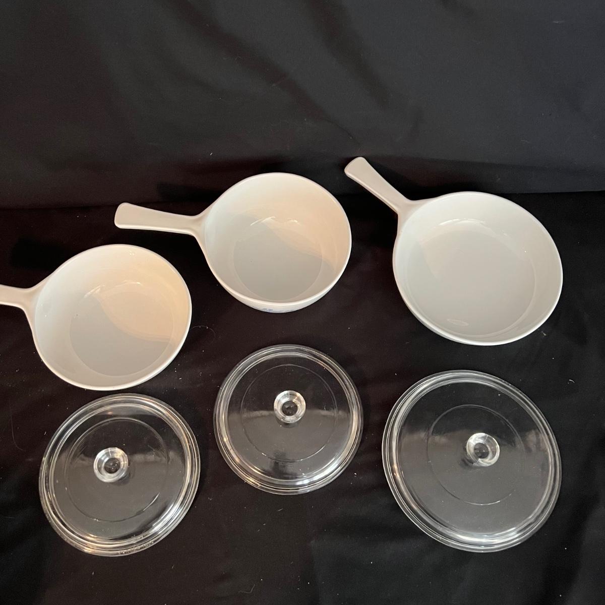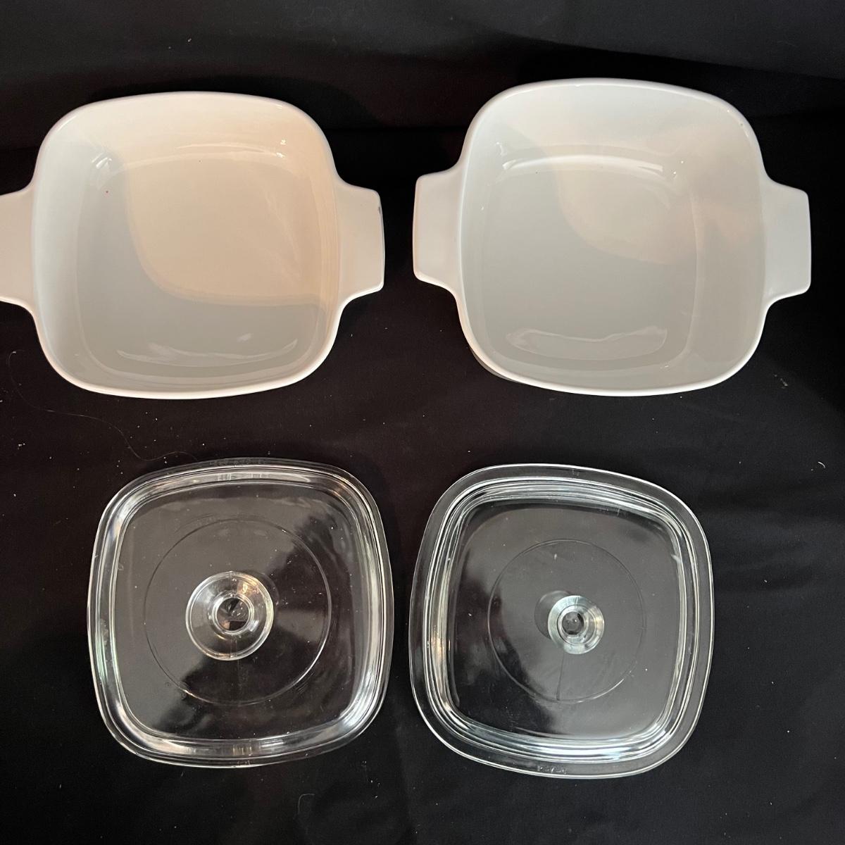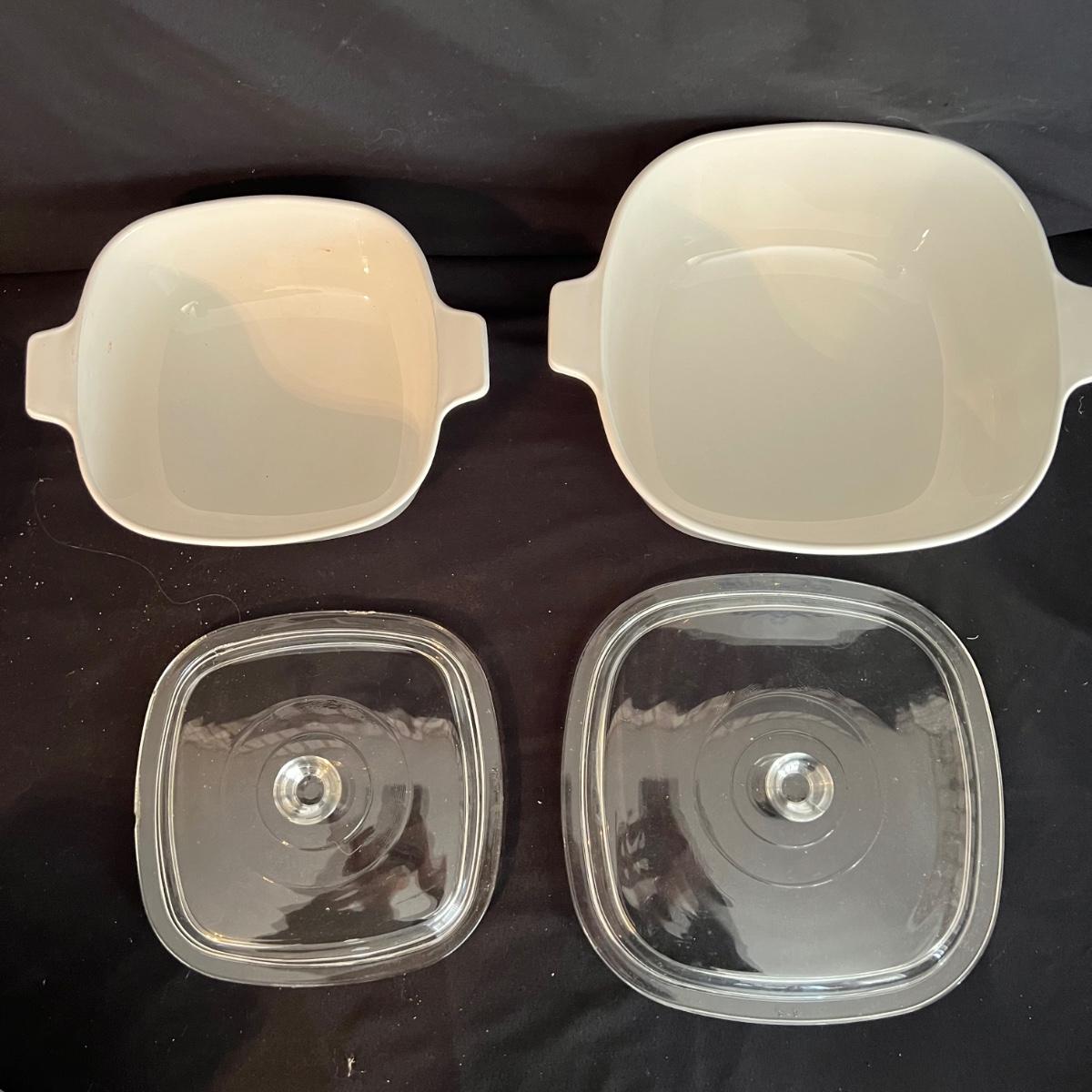 Two 1.5qt and one 2.5 Qt covered baking dishes. Note small chip in cover of 1.5qt dish. One covered 1 Qt. dish. Two uncovered baking dishes, one 1.75 C and one 2.75 C. Three covered frying pan-type dishes, one 6.5” and 1 pt. and one 1.25 pt. Lastly, four grab-it Corning ware 540 ml soup bowls with one lid.