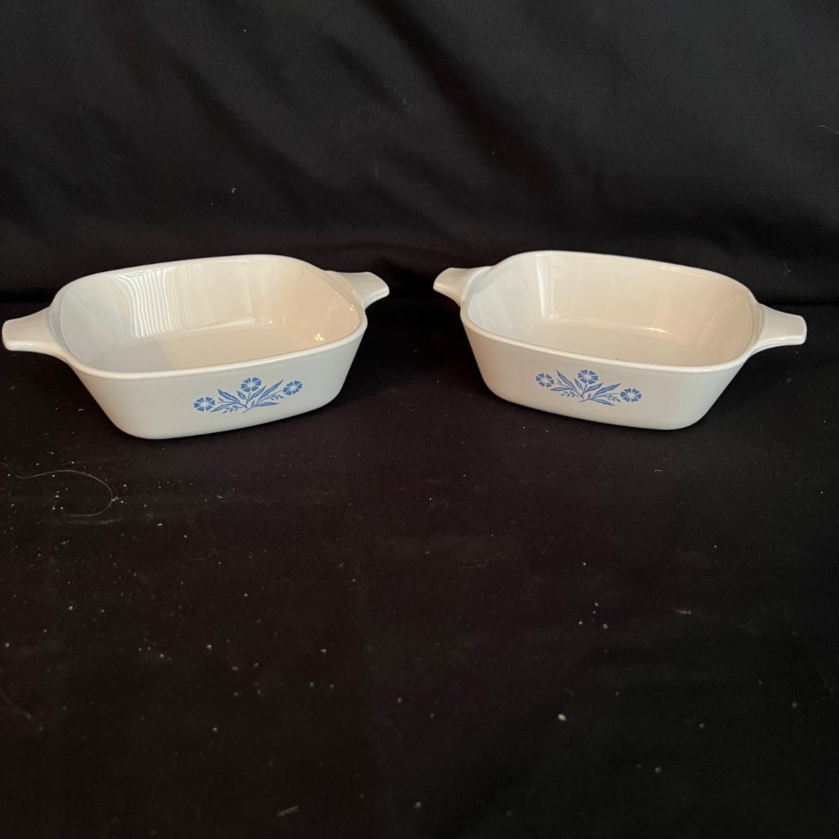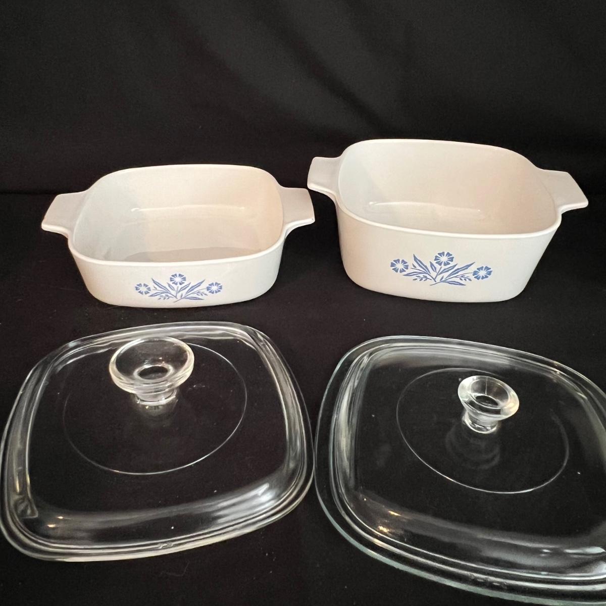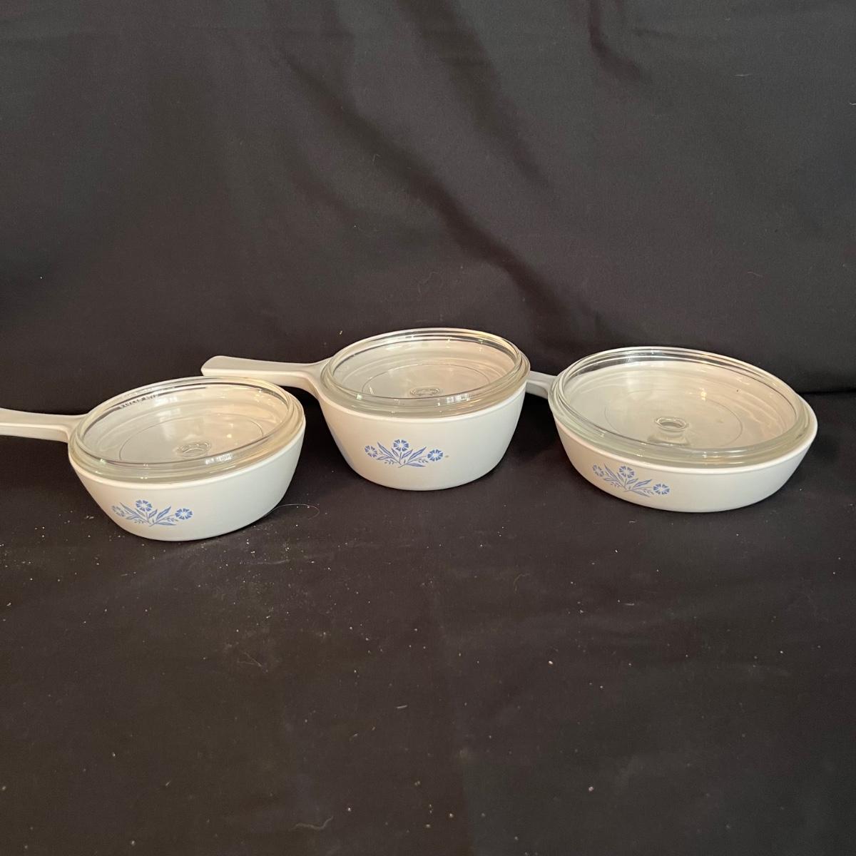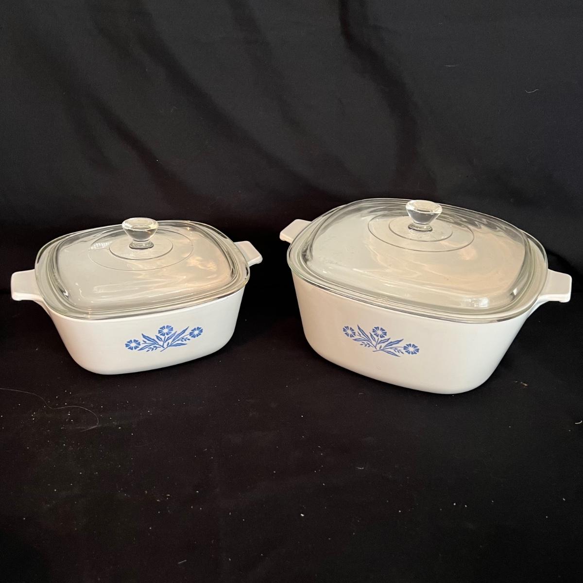 Two 1.5qt and one 2.5 Qt covered baking dishes. Note small chip in cover of 1.5qt dish. One covered 1 Qt. dish. Two uncovered baking dishes, one 1.75 C and one 2.75 C. Three covered frying pan-type dishes, one 6.5” and 1 pt. and one 1.25 pt. Lastly, four grab-it Corning ware 540 ml soup bowls with one lid.
