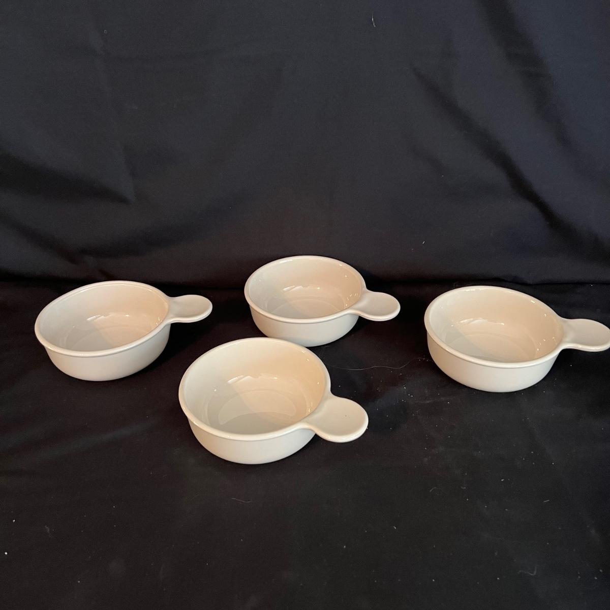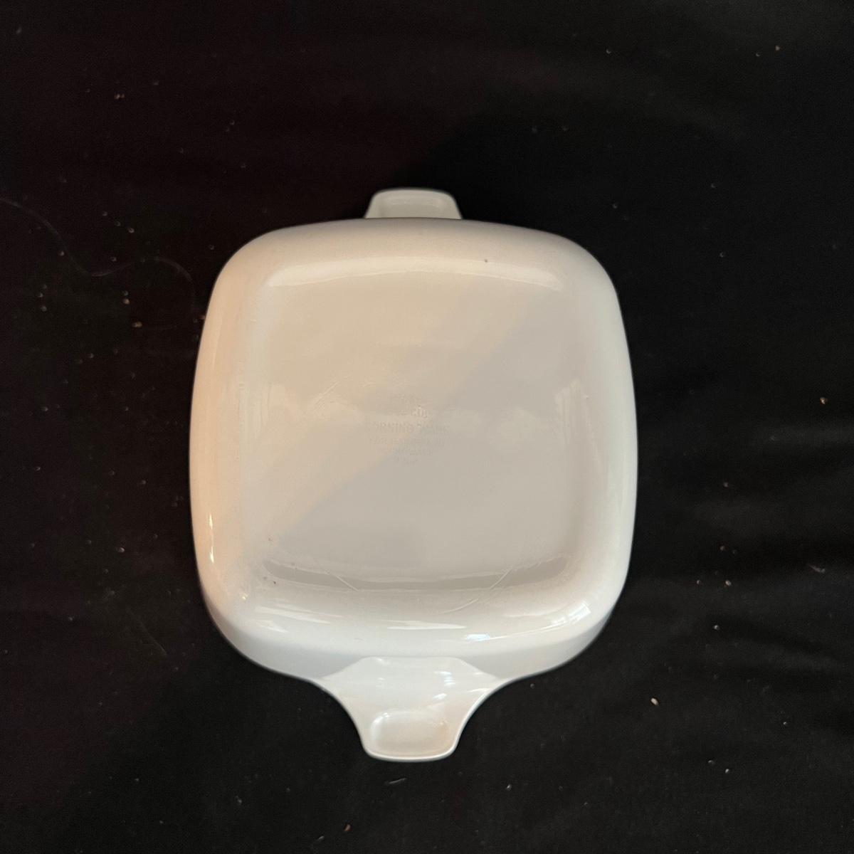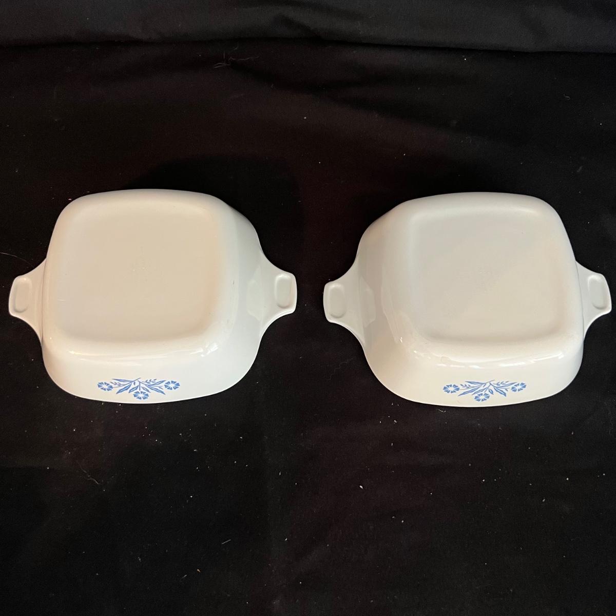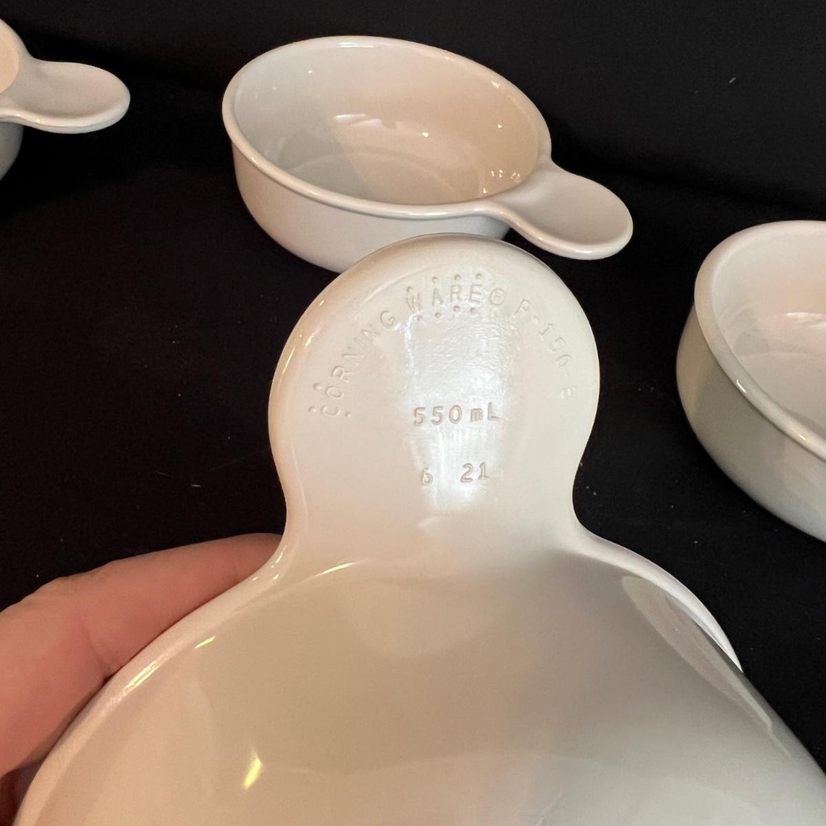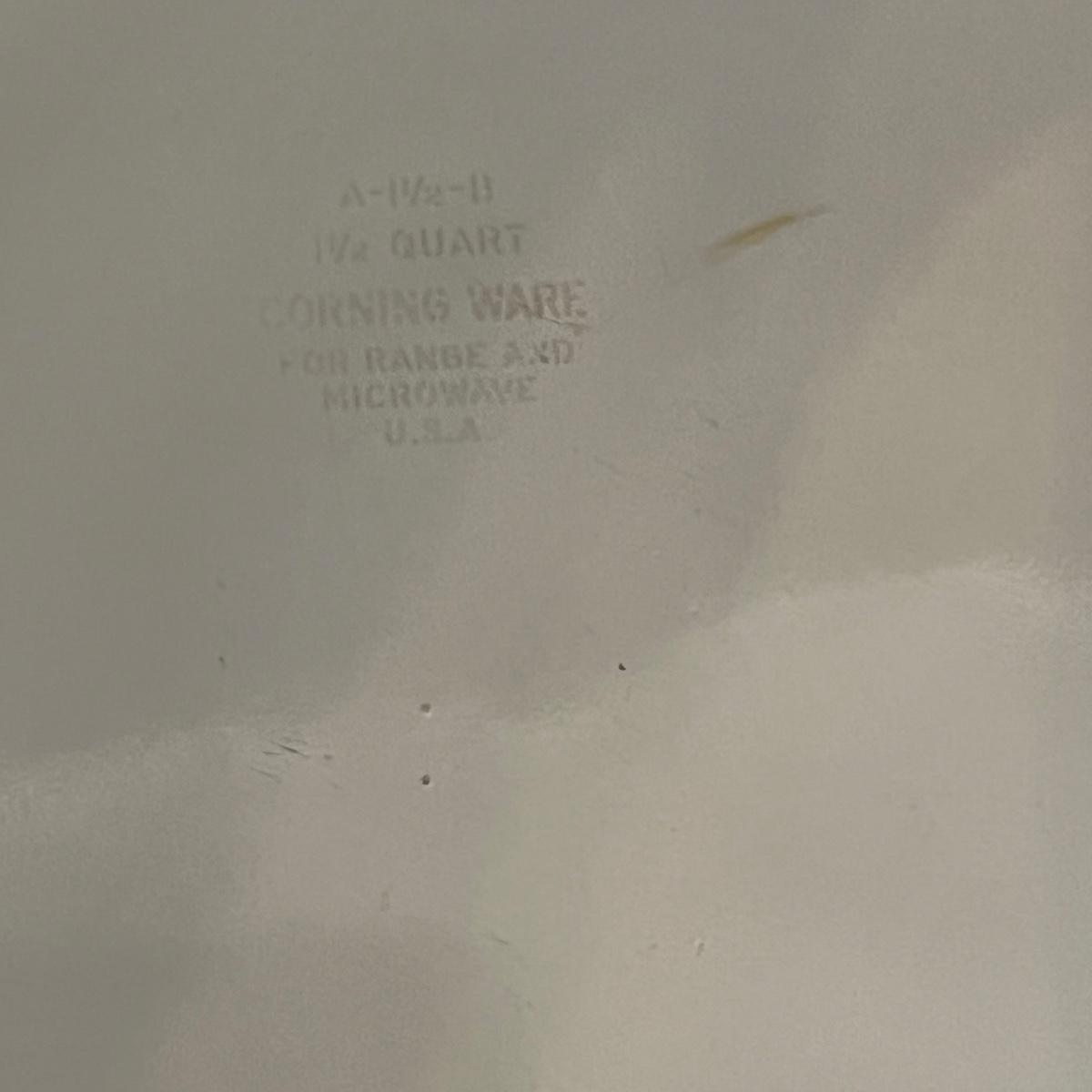 Two 1.5qt and one 2.5 Qt covered baking dishes. Note small chip in cover of 1.5qt dish. One covered 1 Qt. dish. Two uncovered baking dishes, one 1.75 C and one 2.75 C. Three covered frying pan-type dishes, one 6.5” and 1 pt. and one 1.25 pt. Lastly, four grab-it Corning ware 540 ml soup bowls with one lid.