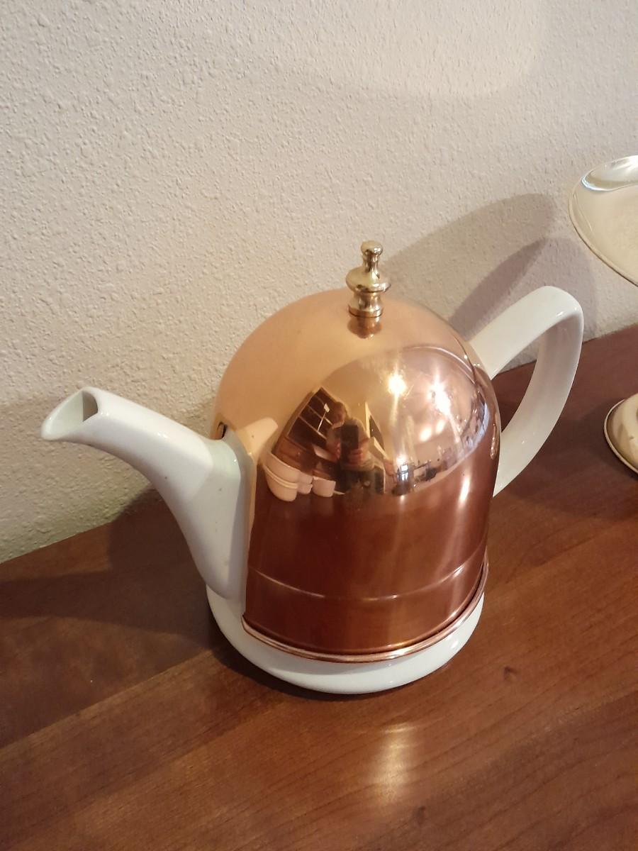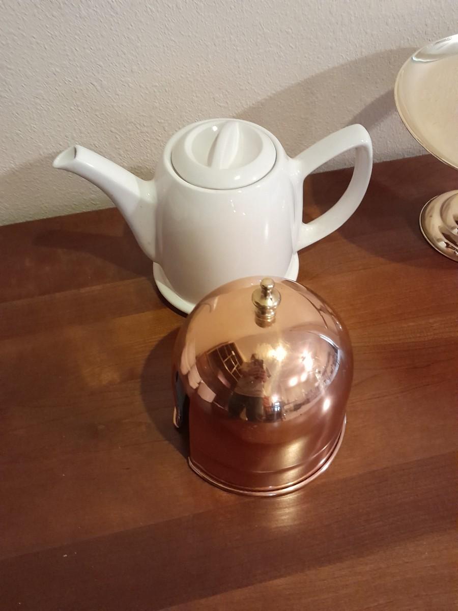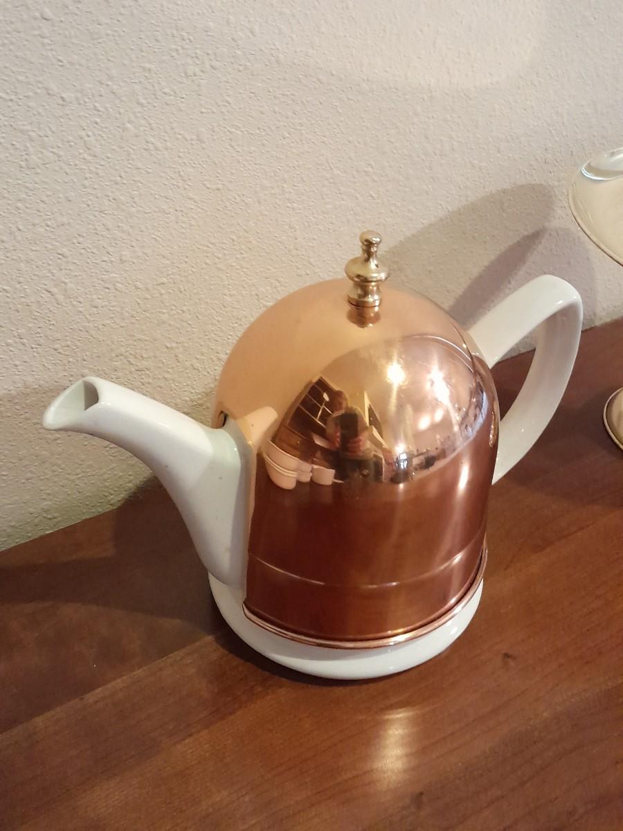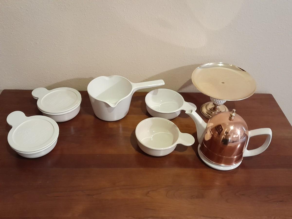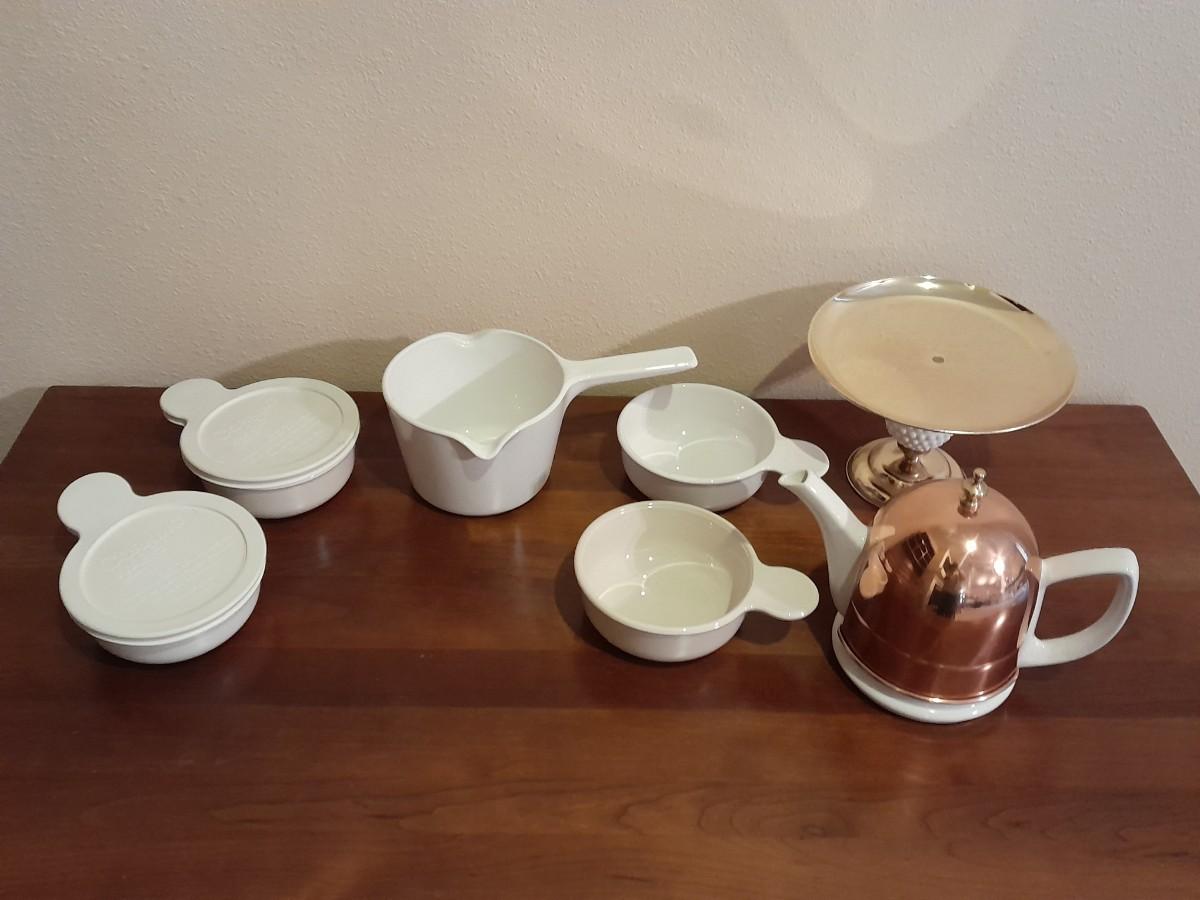 CORNINGWARE SOUP POT WITH BOWLS, AND COPPER COVERED TEA KETTLE