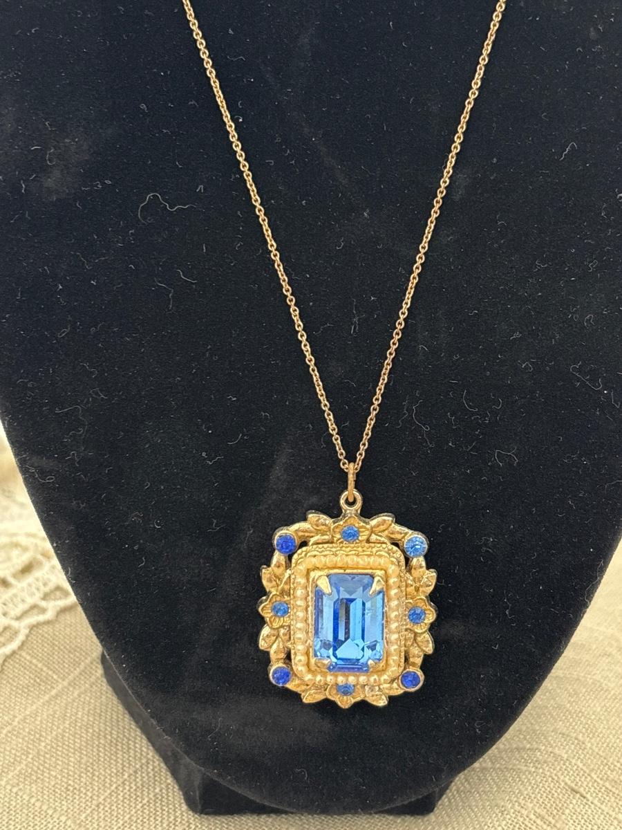 Coro Aquamarine Crystal & Faux Pearl Pendant in Gold tone Circa Mid 1900s