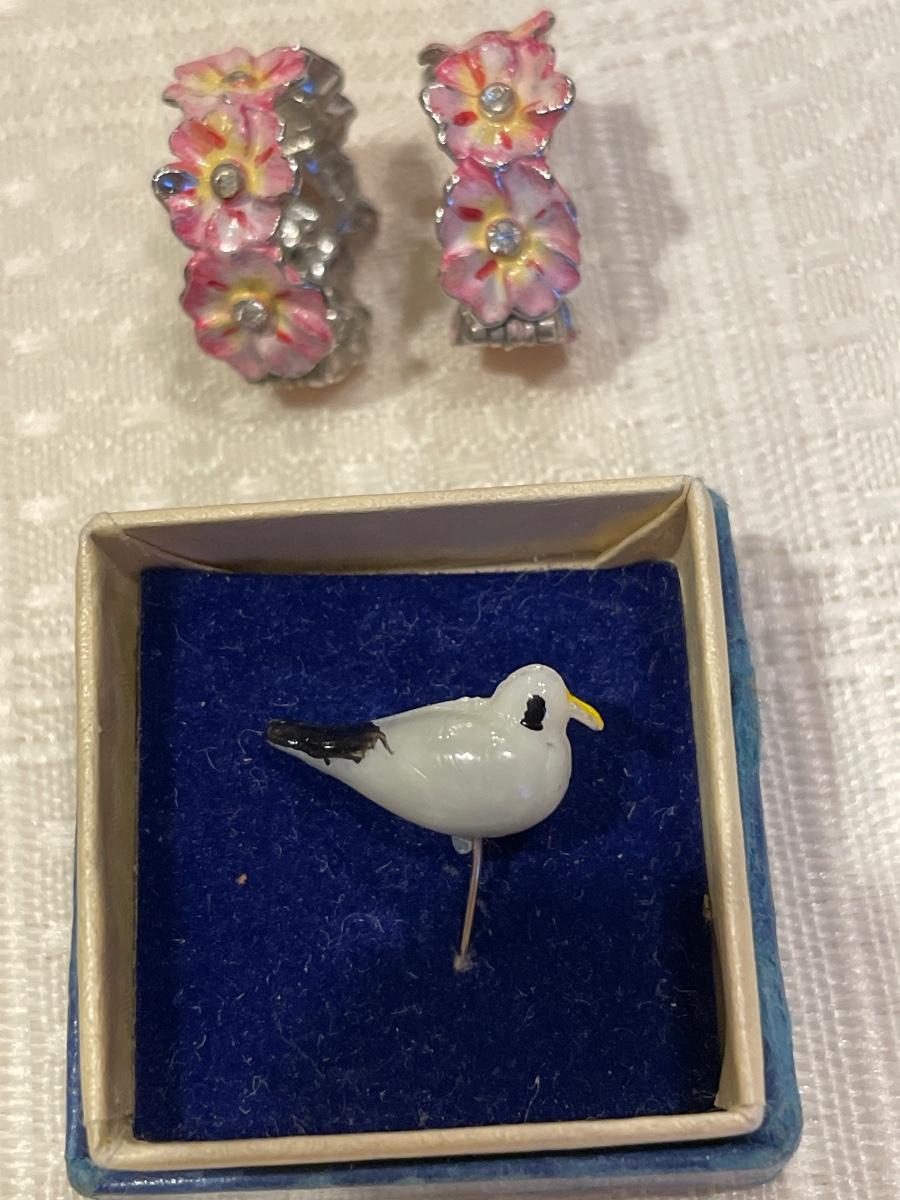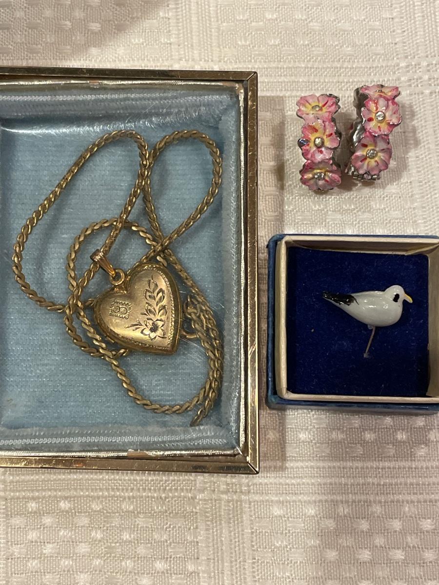 Coro flower clip on earrings, bird pin and locket