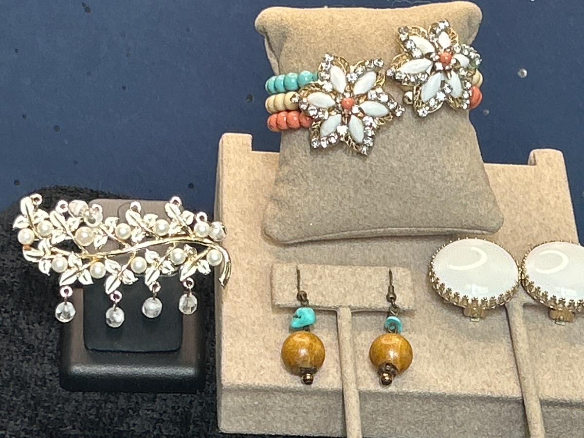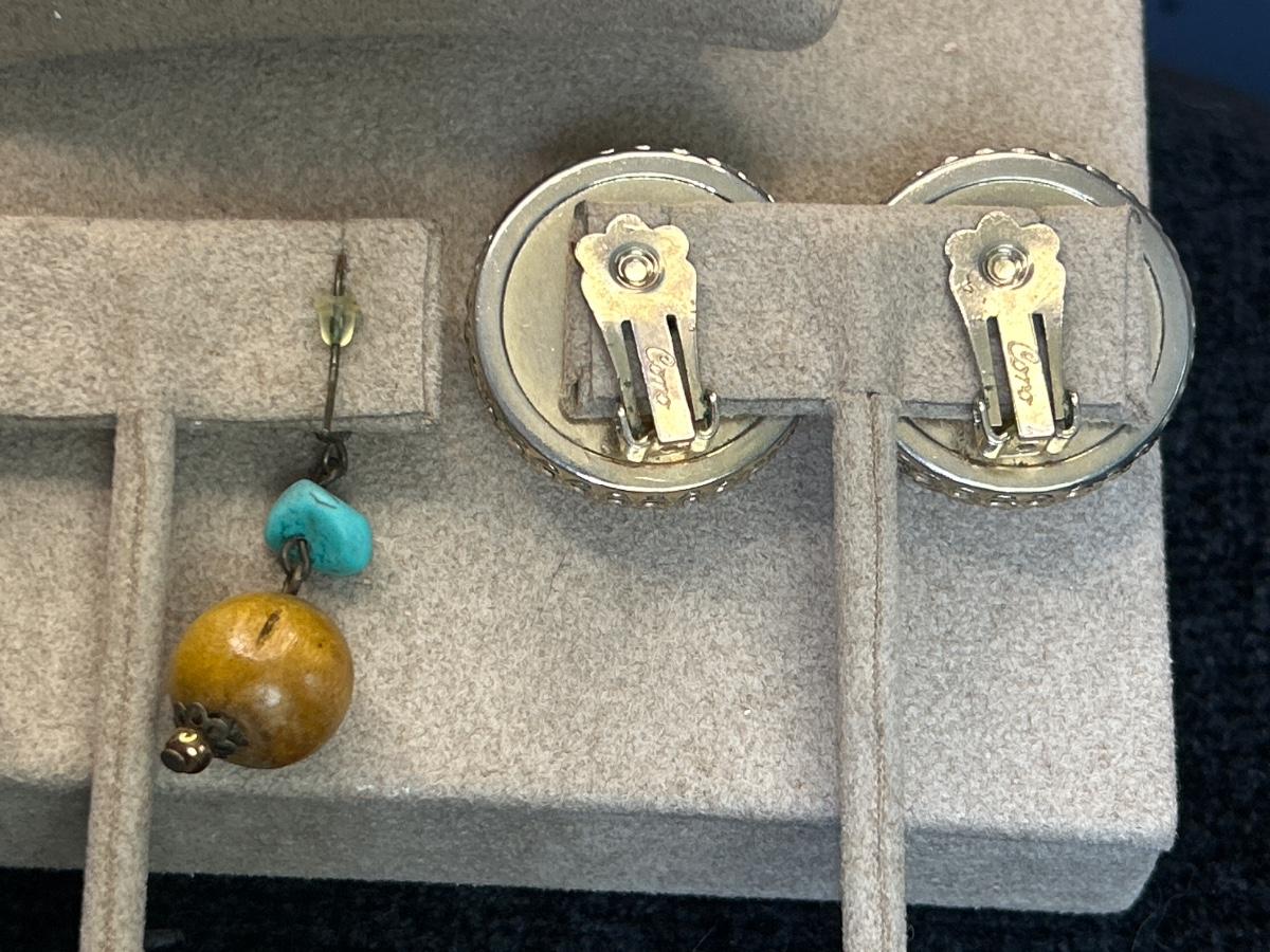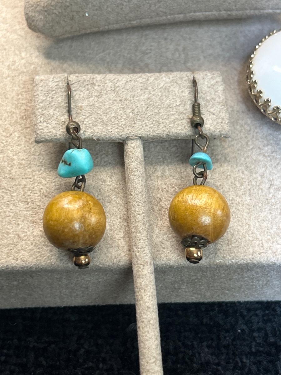 This bracelet is adorable, no maker, the wood earrings also no maker, the large white clip on earrings are Coro as well as the brooch.