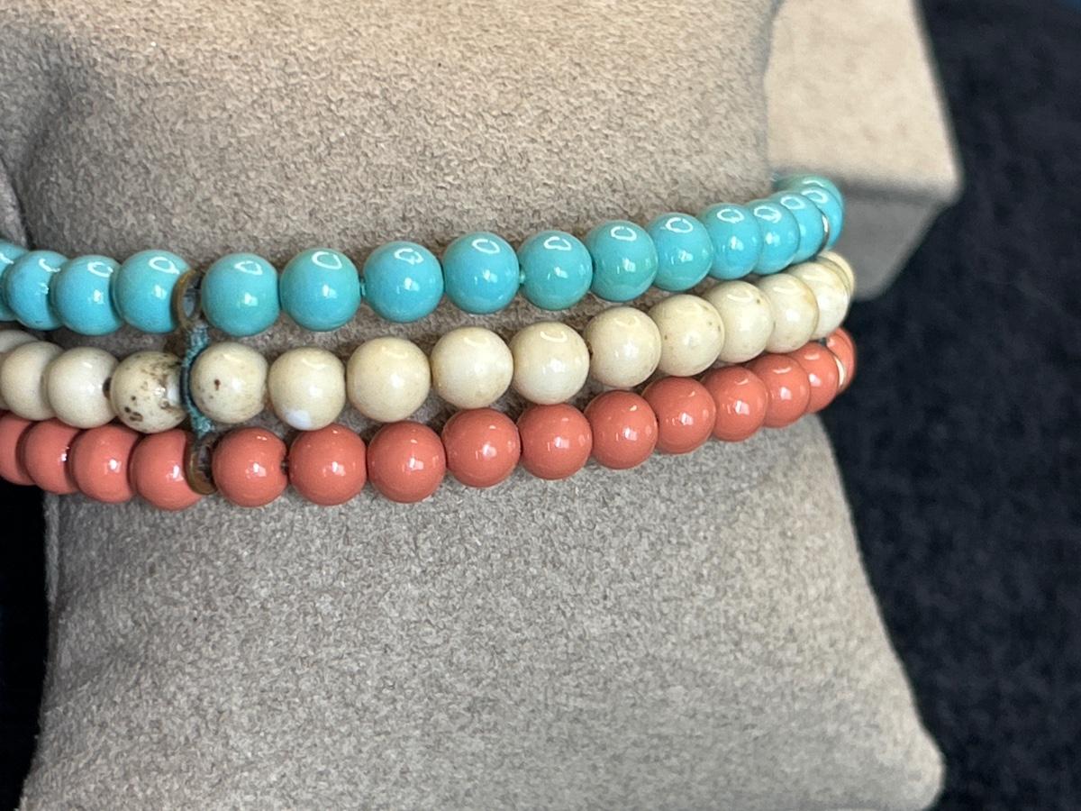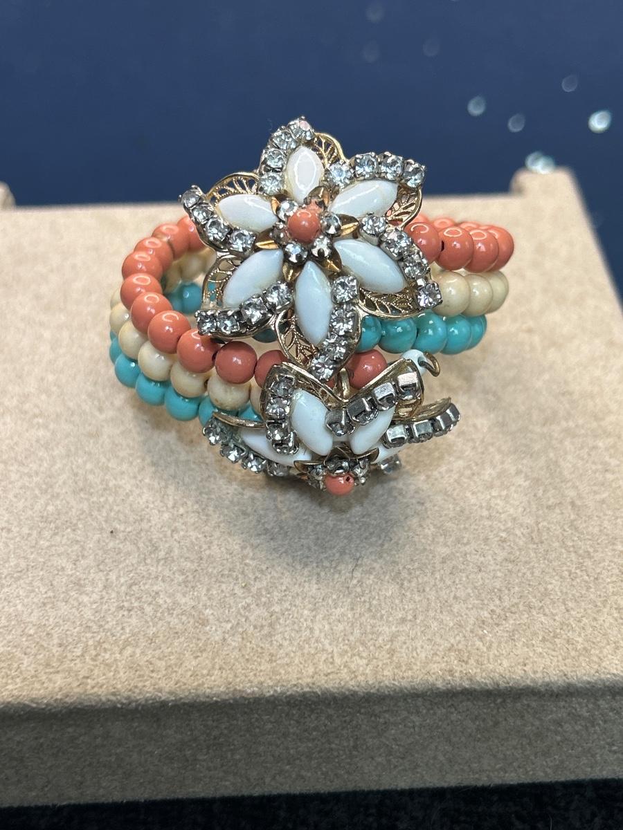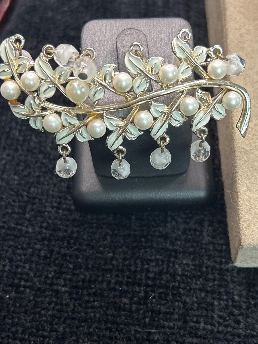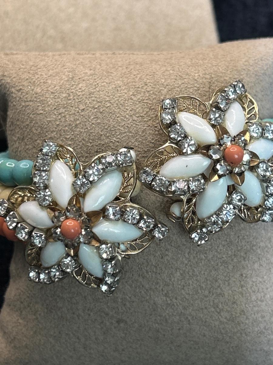 This bracelet is adorable, no maker, the wood earrings also no maker, the large white clip on earrings are Coro as well as the brooch.