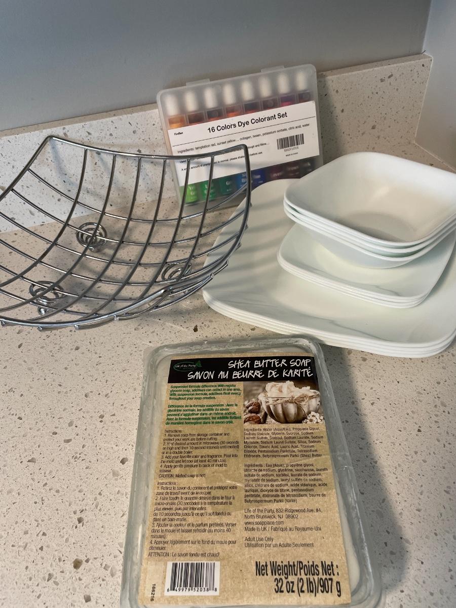 White corral table wear. Fruit basket. Shea butter soap, and dye colorant set.