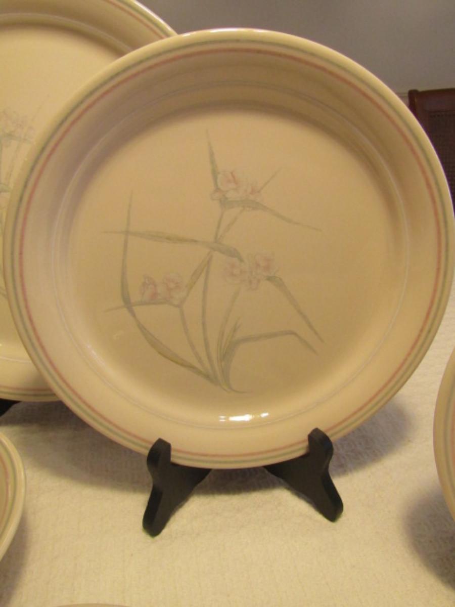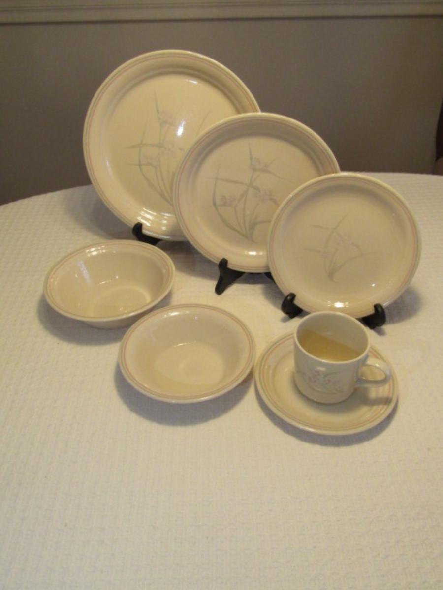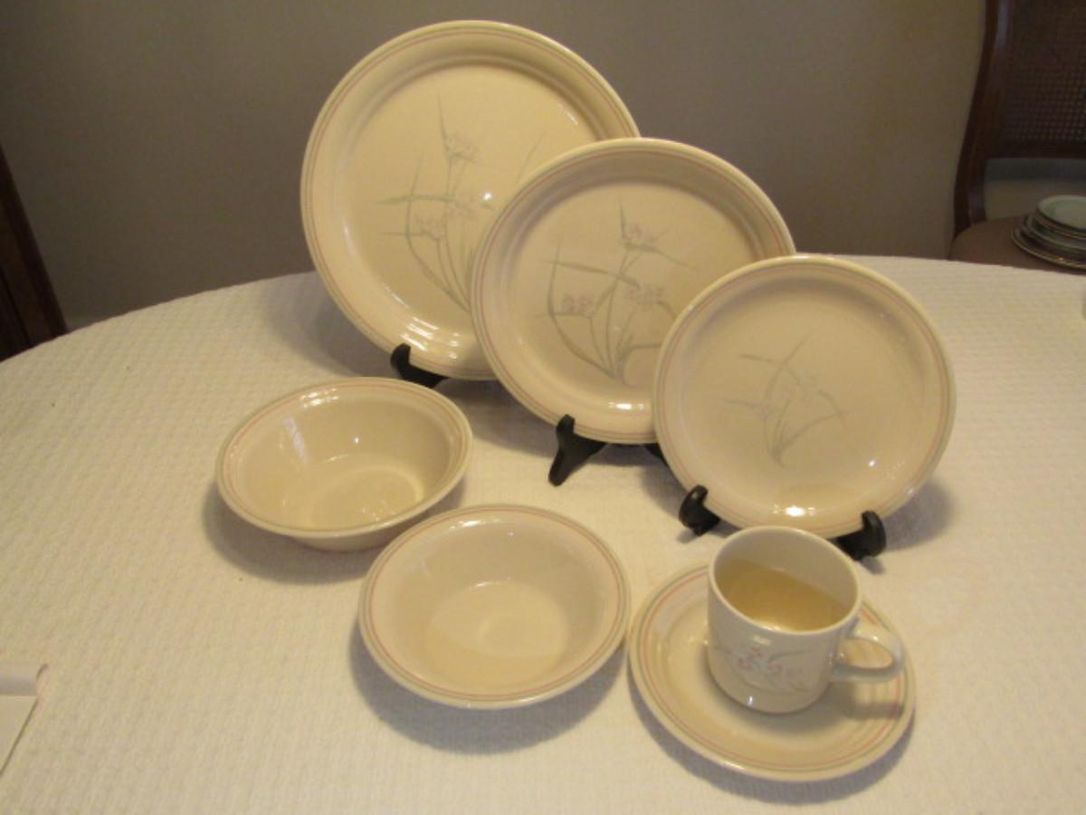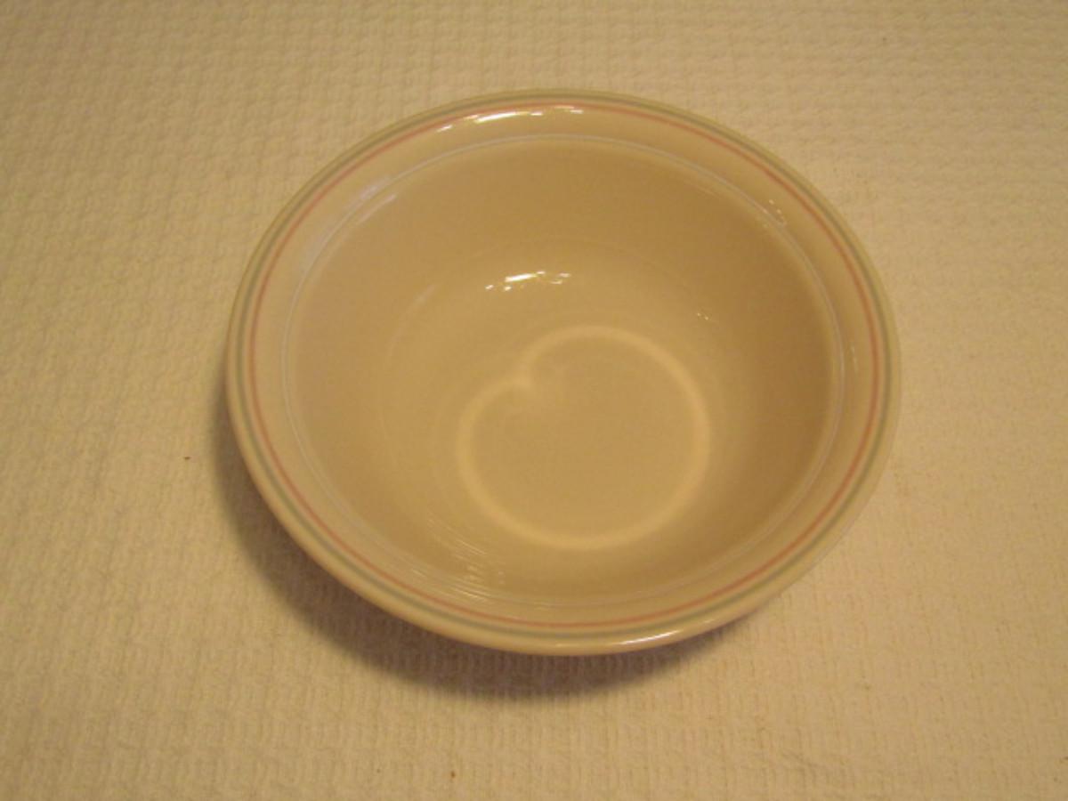Correll Dinnerware- Cream and Floral with Colored Stripes at Rim- Approx 69 Pieces. Dinner Plates (10 1/4")- 6, Salad Plates (8 1/2")- 6, Bread Plates (7 1/4")- 6, Cups- 9, Saucers- 12, Cream and Sugar, Soup Bowl- 6, Berry Bowl- 6, Ice Cream Bowl- 7, Gravy Boat, Butter Dish with Cover, 8 1/2" Vegetable Bowl- 1, 12 1/4" Platter- 6.