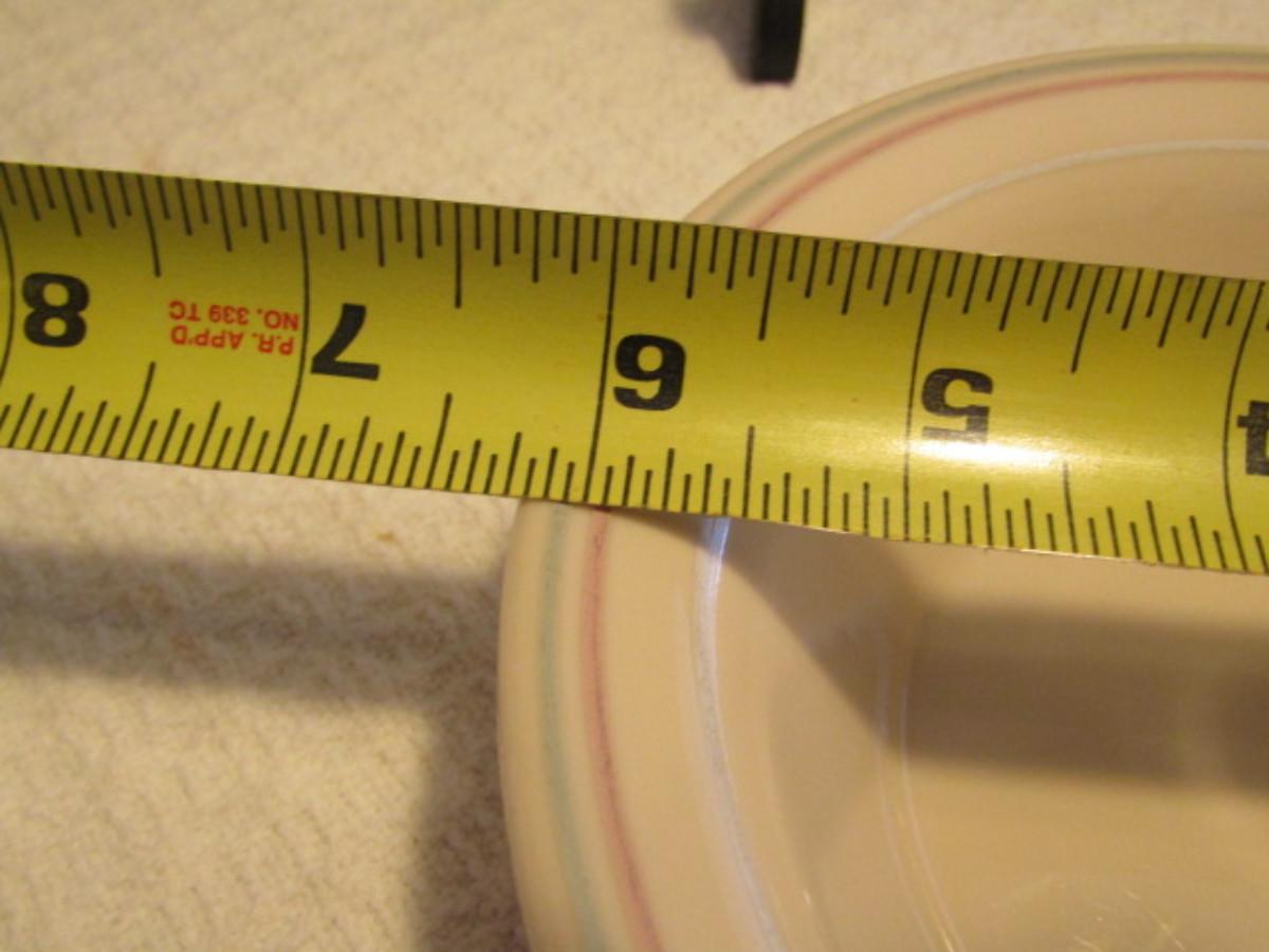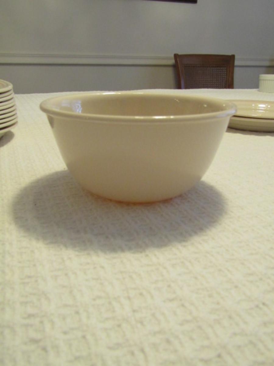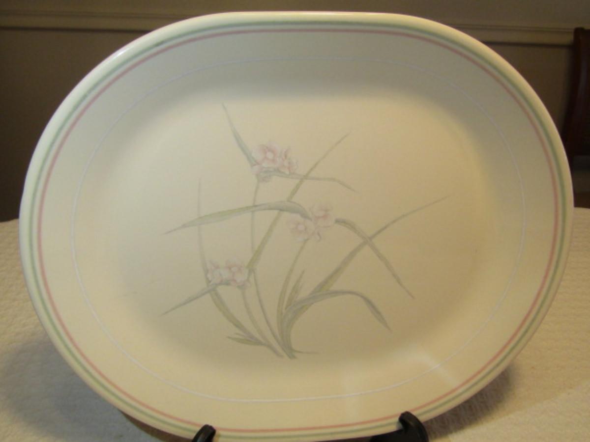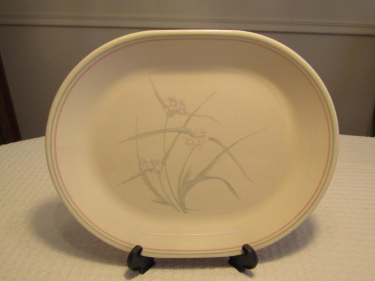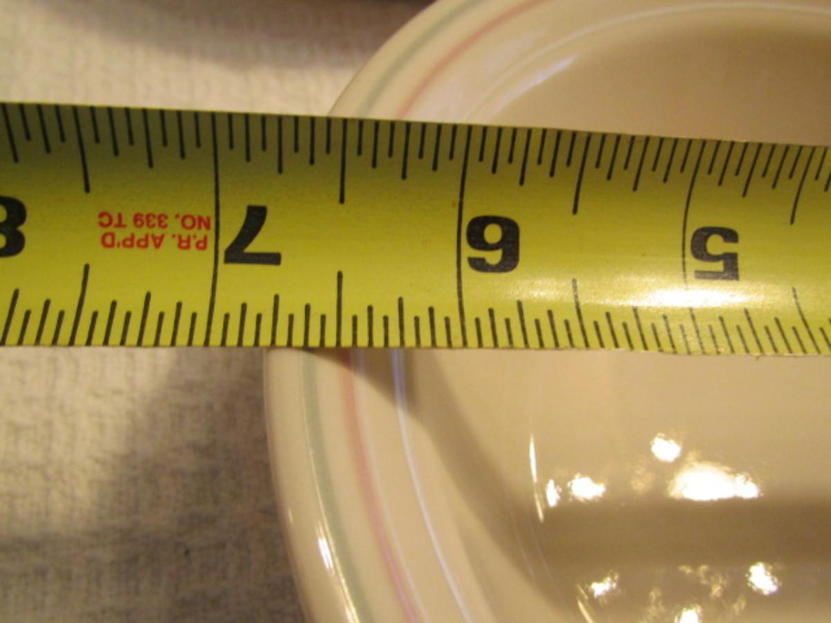 Correll Dinnerware- Cream and Floral with Colored Stripes at Rim- Approx 69 Pieces. Dinner Plates (10 1/4")- 6, Salad Plates (8 1/2")- 6, Bread Plates (7 1/4")- 6, Cups- 9, Saucers- 12, Cream and Sugar, Soup Bowl- 6, Berry Bowl- 6, Ice Cream Bowl- 7, Gravy Boat, Butter Dish with Cover, 8 1/2" Vegetable Bowl- 1, 12 1/4" Platter- 6.