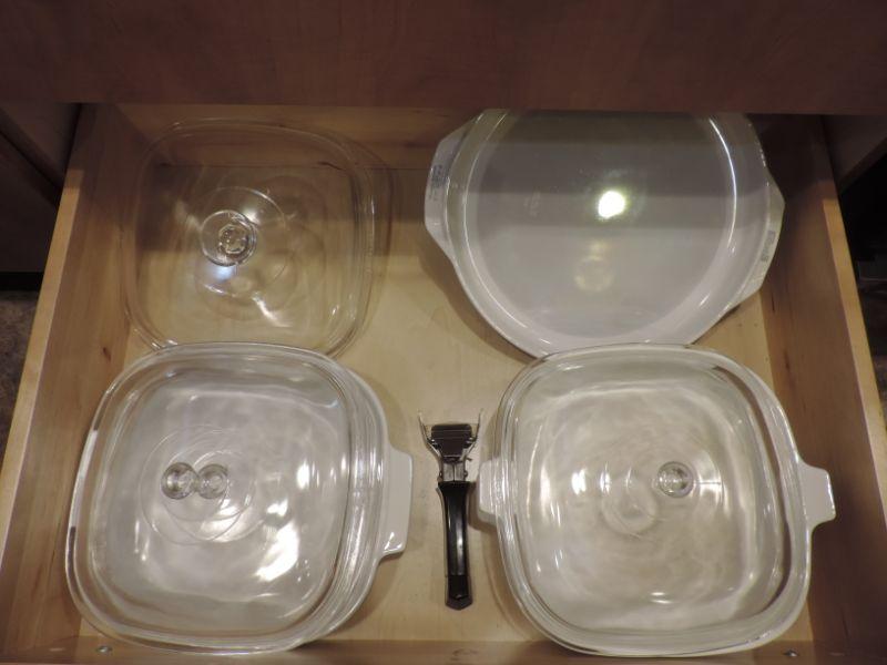CORNING WARE BAKING DISHES WITH LIDS AND A WARMER /COOKING PAD, MICROWAVE PIZZA DISH