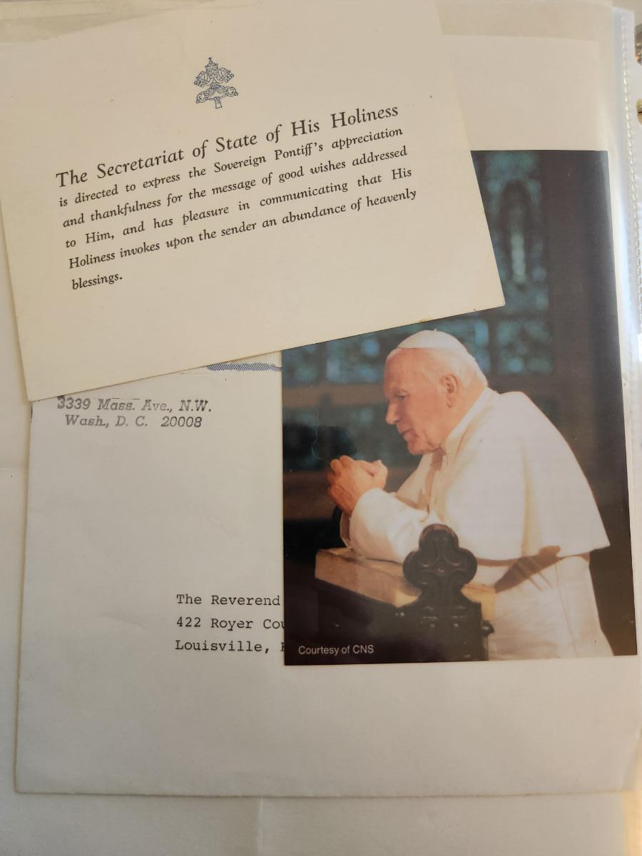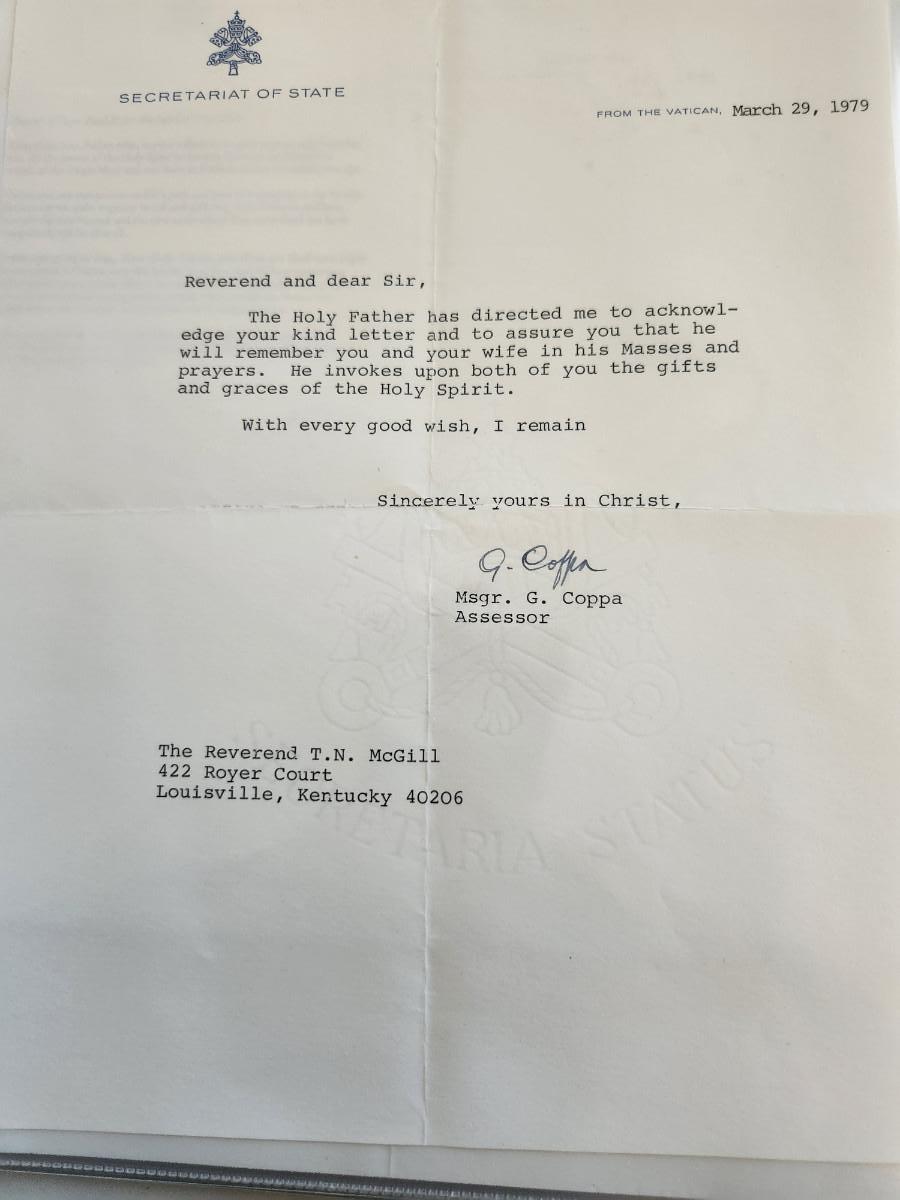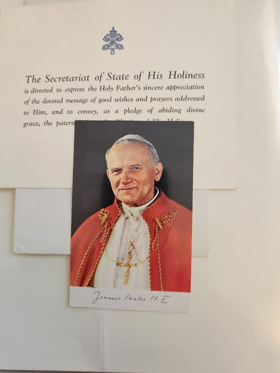 This auction lot is for a gathering of Correspondence from the Vatican. This includes two letters from the Secretariat of State, several acknowledgement cards, a reproduced photograph with prayer on the verso and a holy card - comes with envelopes.