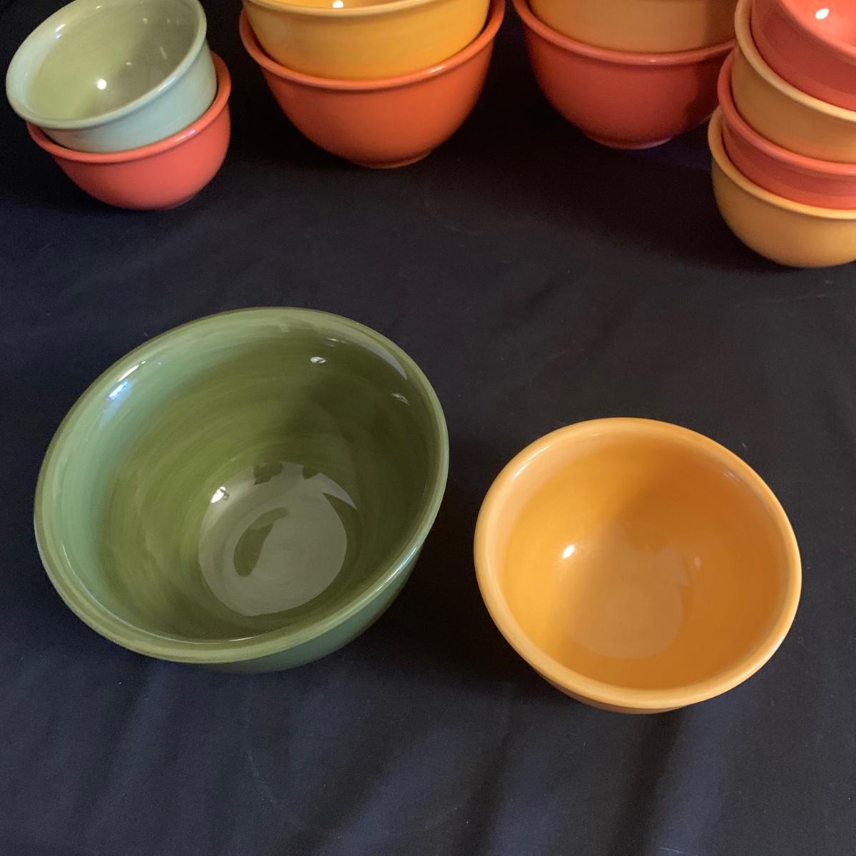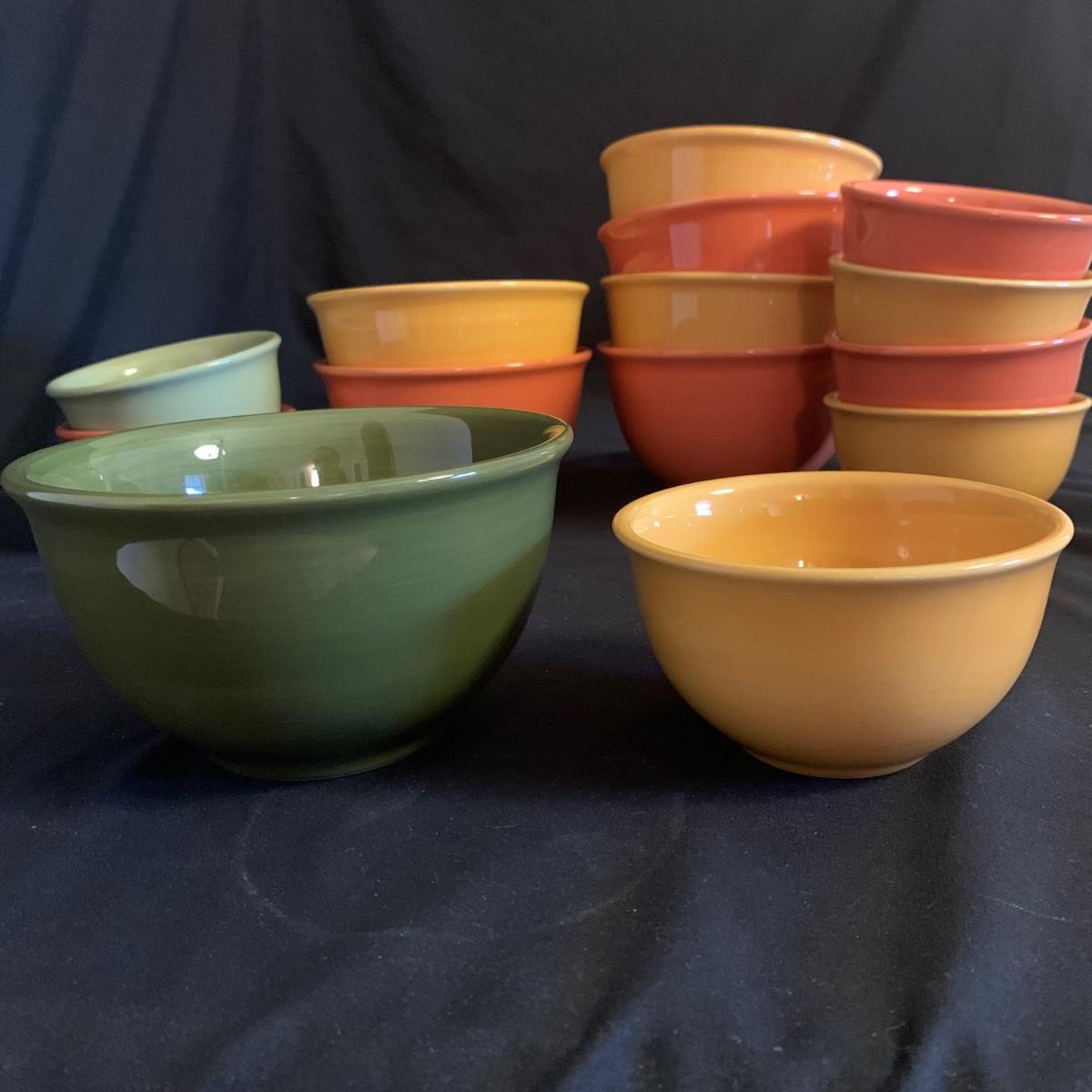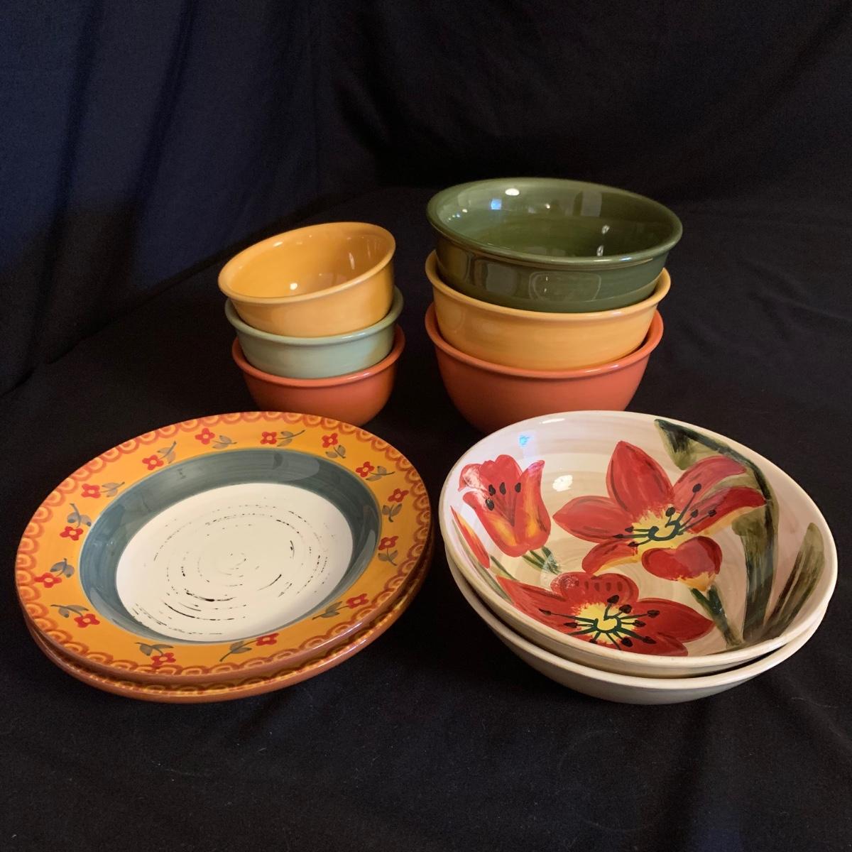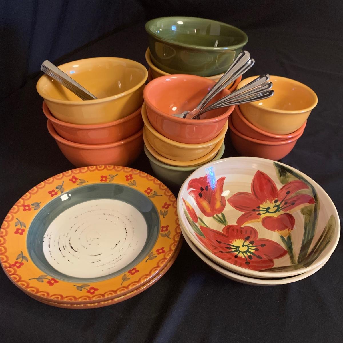 Corsica Home Bowl set with seven 6”D bowls and seven 4.5”D bowls, as well as six Farberware grapefruit spoons, 12 Delta Airlines soup spoons, two Folk Art Garden Path bowls, and two hand painted Honolulu bowls. One of the Honolulu bowls has a chip on the exterior of the rim and one of the smaller Corsica bowls has a tiny chip. Otherwise, all items are in good condition.