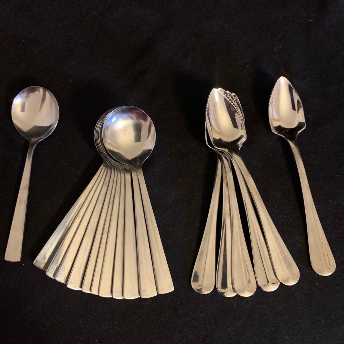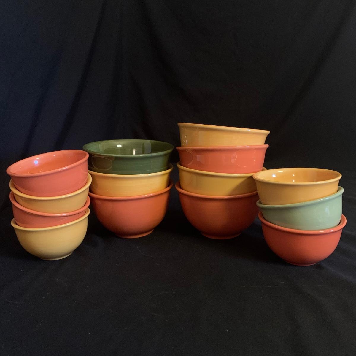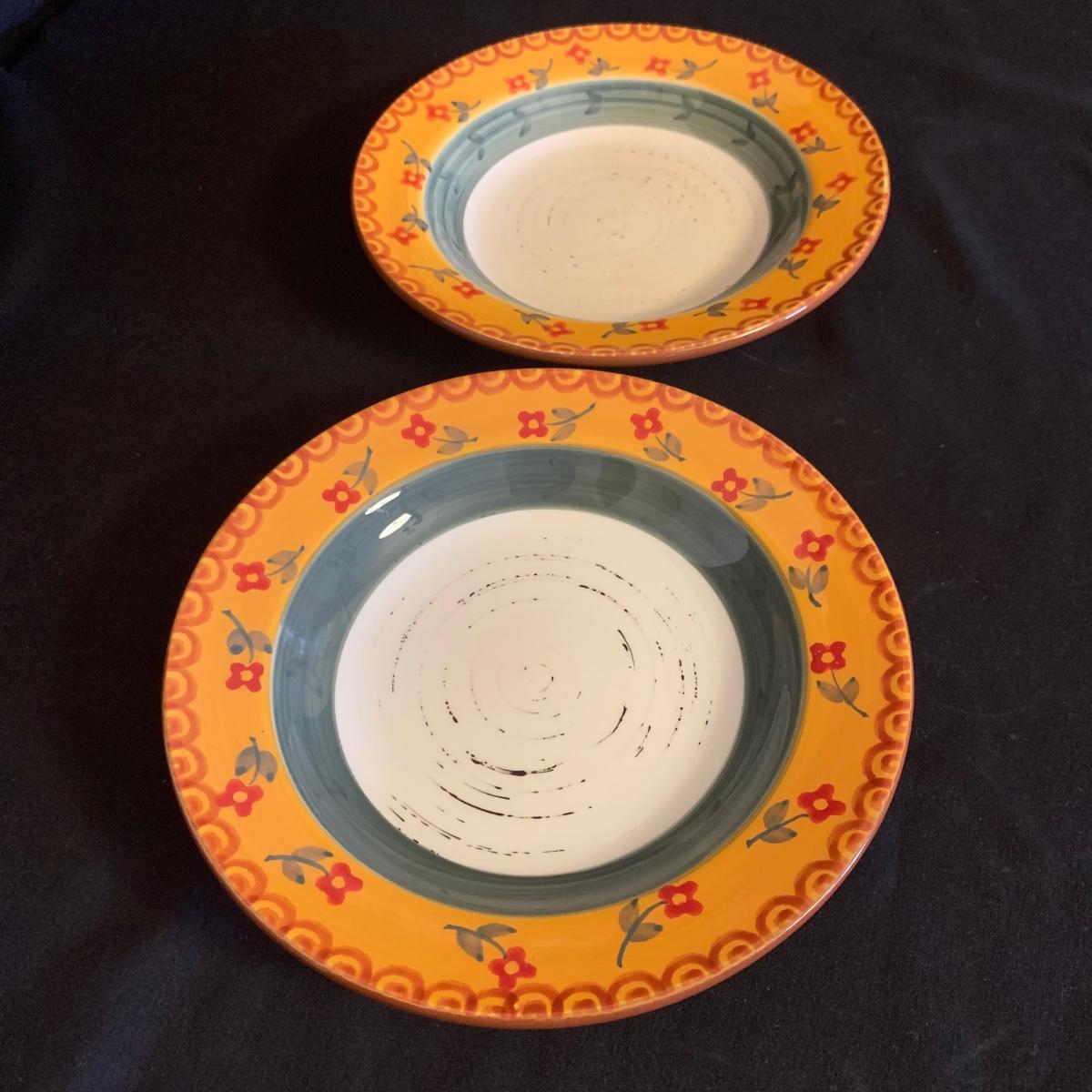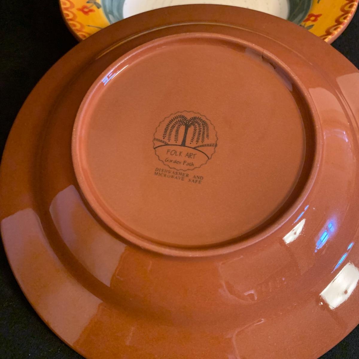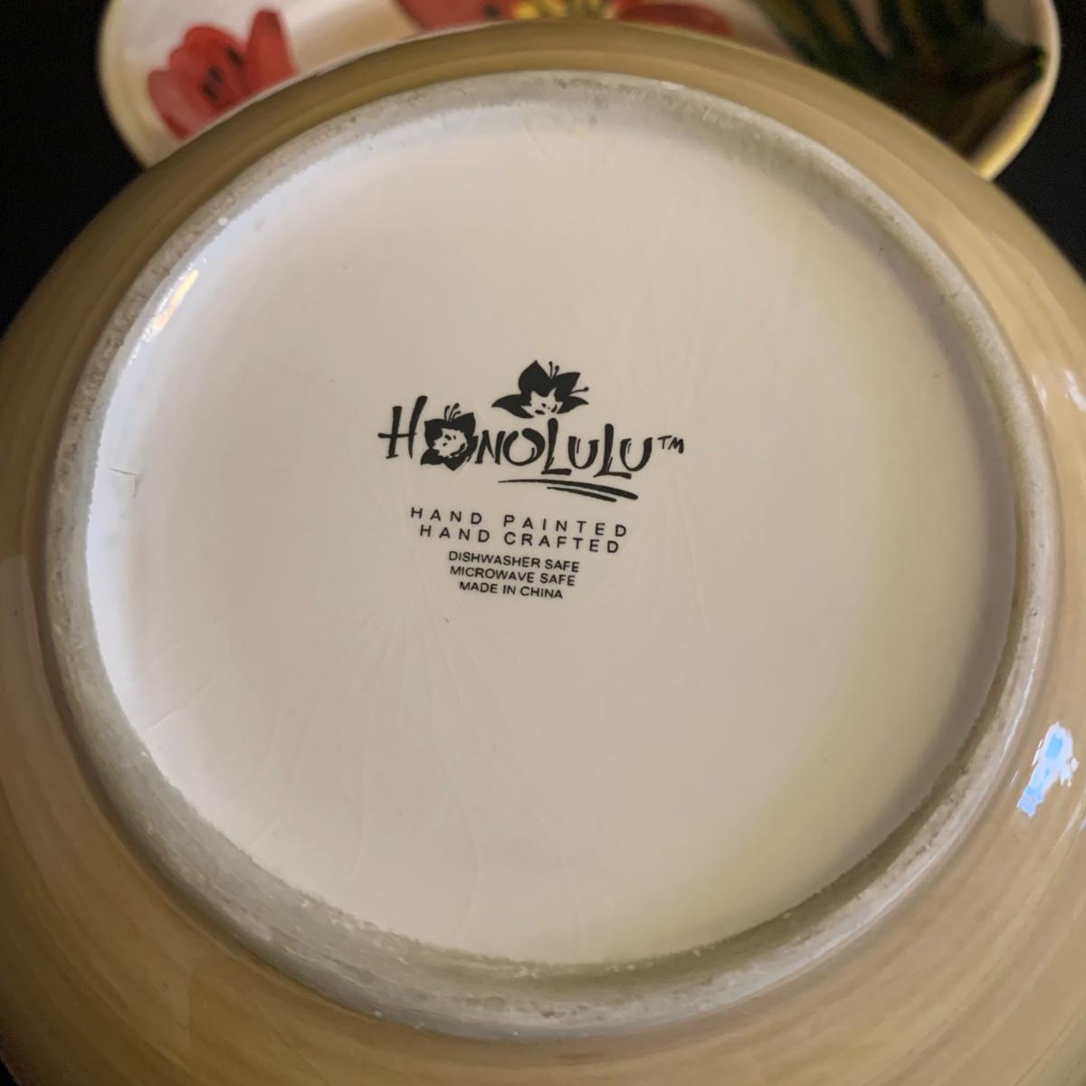 Corsica Home Bowl set with seven 6”D bowls and seven 4.5”D bowls, as well as six Farberware grapefruit spoons, 12 Delta Airlines soup spoons, two Folk Art Garden Path bowls, and two hand painted Honolulu bowls. One of the Honolulu bowls has a chip on the exterior of the rim and one of the smaller Corsica bowls has a tiny chip. Otherwise, all items are in good condition.
