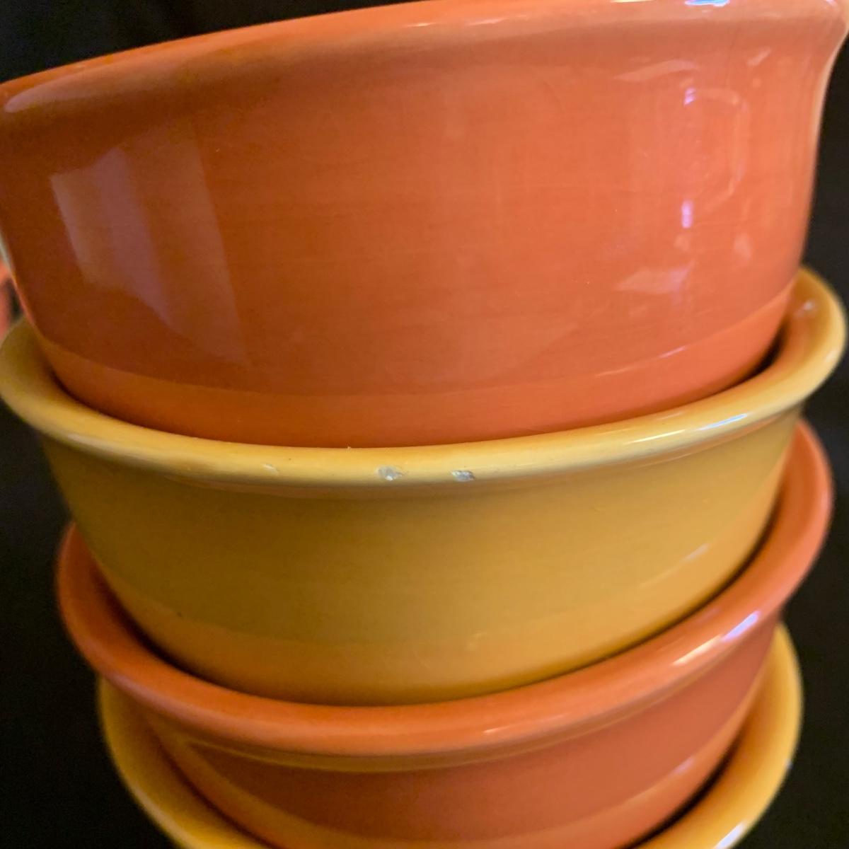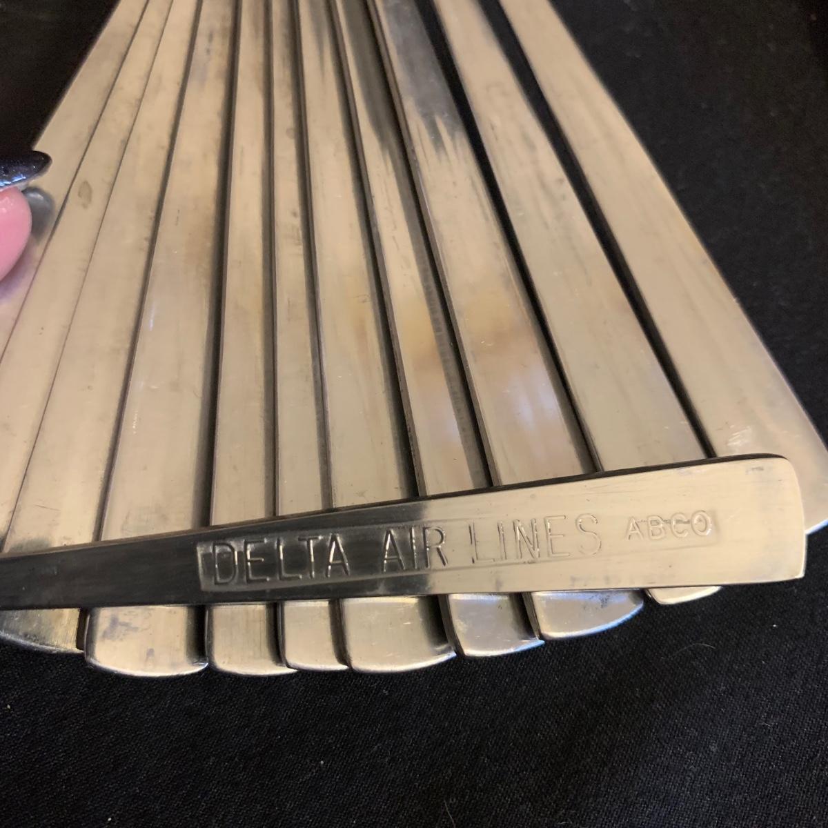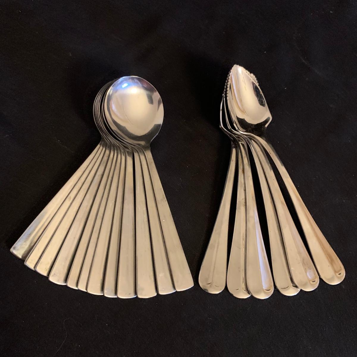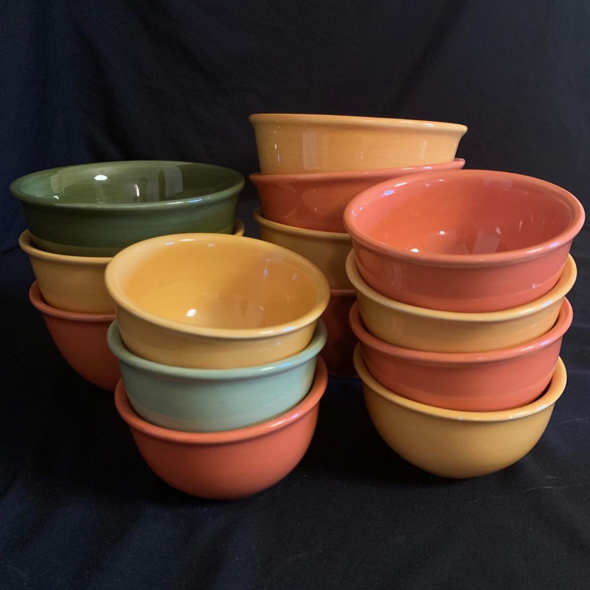 Corsica Home Bowl set with seven 6”D bowls and seven 4.5”D bowls, as well as six Farberware grapefruit spoons, 12 Delta Airlines soup spoons, two Folk Art Garden Path bowls, and two hand painted Honolulu bowls. One of the Honolulu bowls has a chip on the exterior of the rim and one of the smaller Corsica bowls has a tiny chip. Otherwise, all items are in good condition.