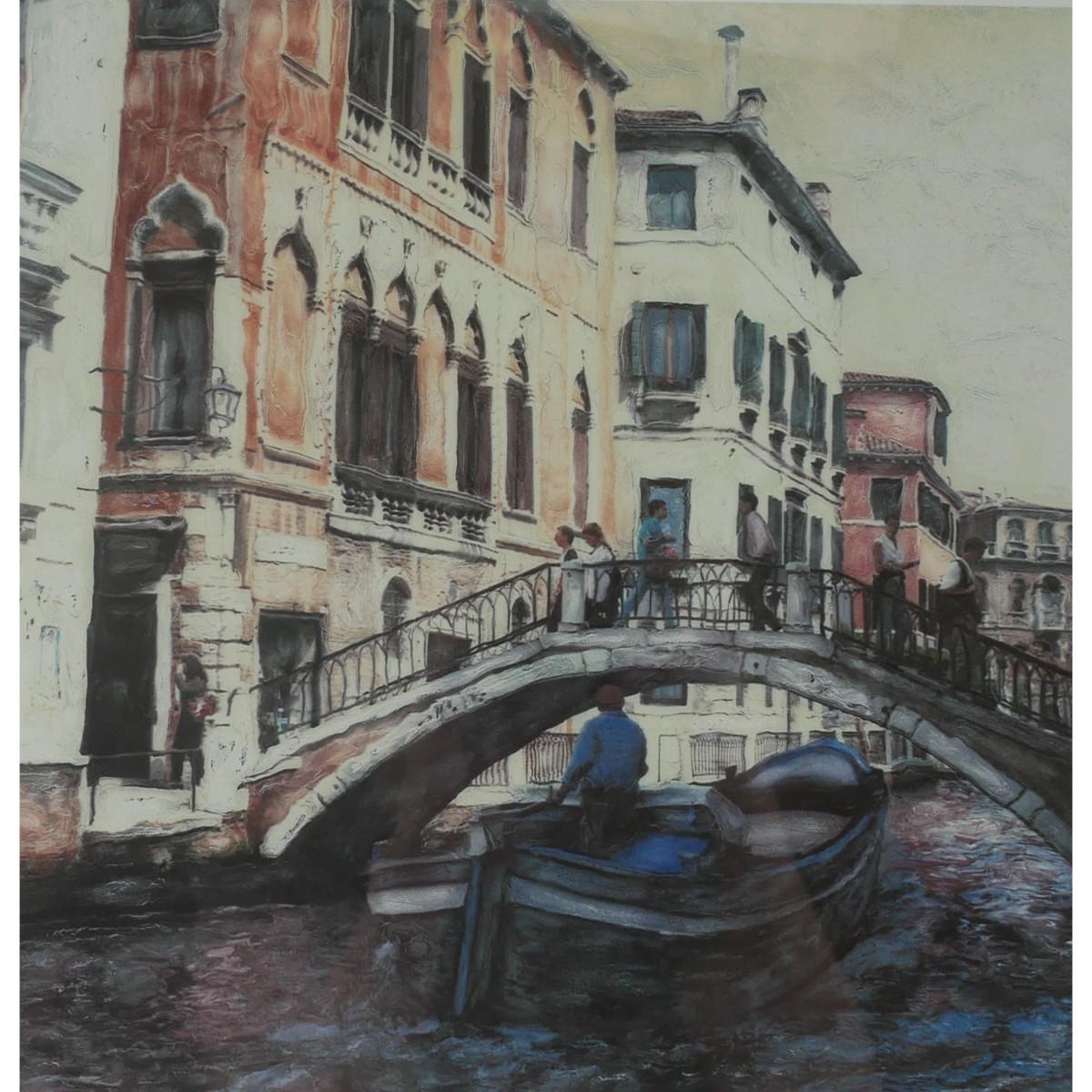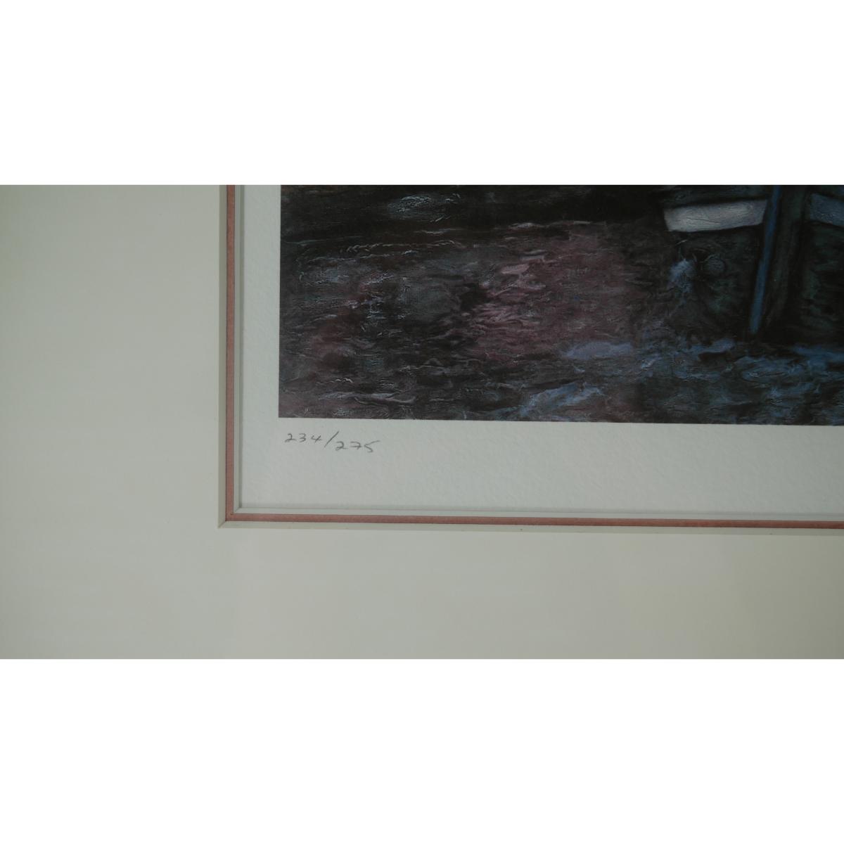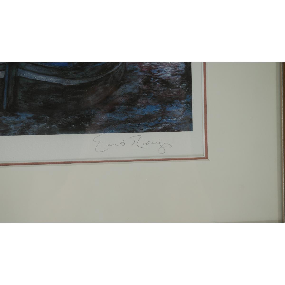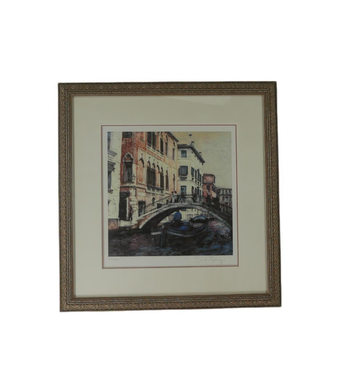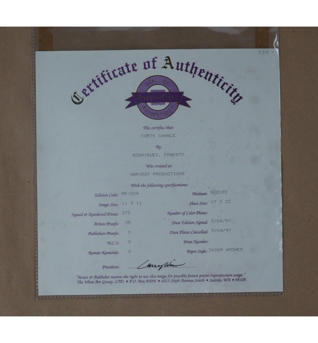 "Corte Canale" by Ernesto Rodriguez limited edition giclee, numbered 234/275. Signed in pencil by artist. Dated 1997. Certificate of authenticity is included. Art measures L 11" x H 11". Frame measures L 19.5" H 20.25" x D 1". Weight is 5 lb 10 oz. (A53)