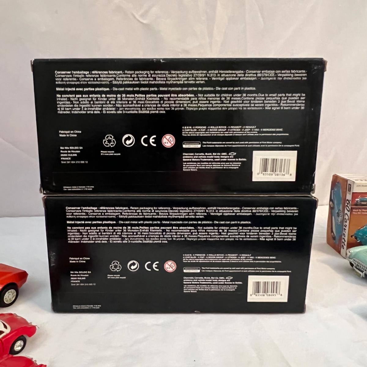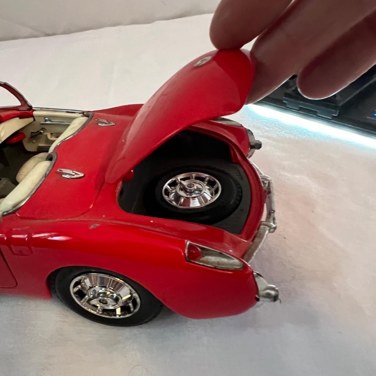 The 1/18 scale cars (two in box, a third red car without box) measure approximately 4” x 8”.