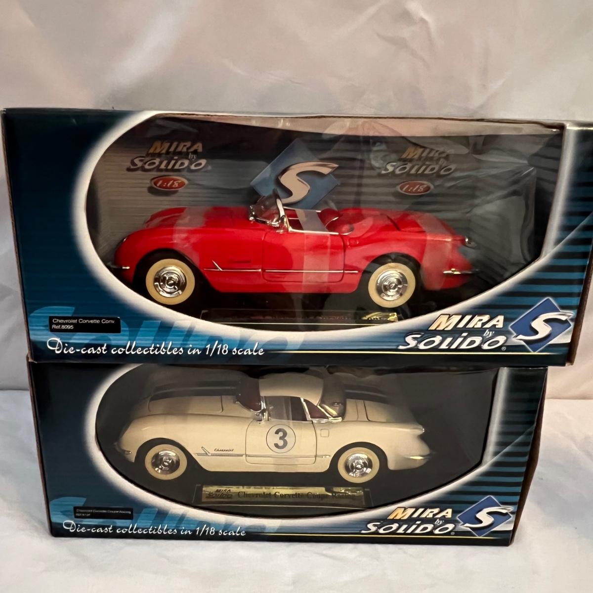 This Corvette car collectible lot includes two 1/18 scale cars in their original display box along with another seven Chevy toy cars that are Corvettes and one Camaro plus a 1/25 scale “˜60 Corvette kit (please see image as we cannot guarantee all pieces are present).
