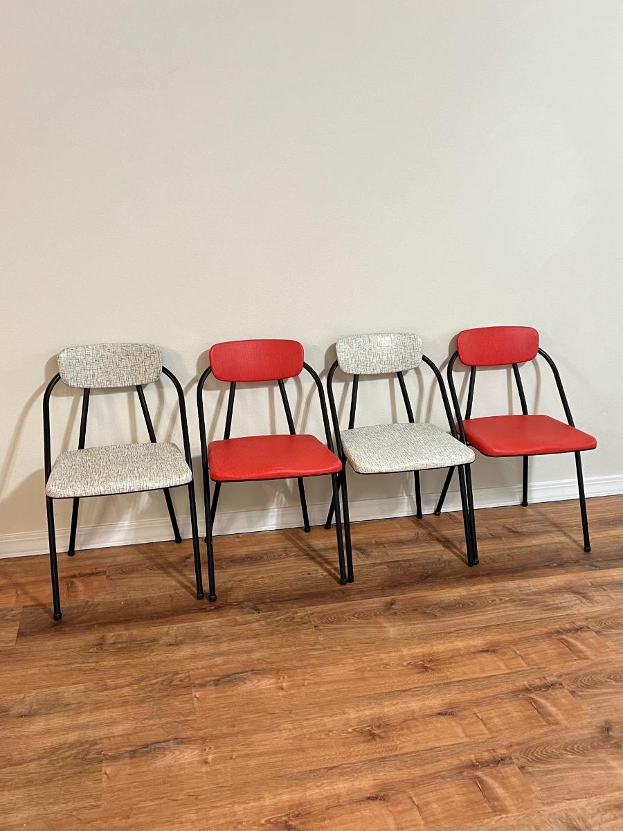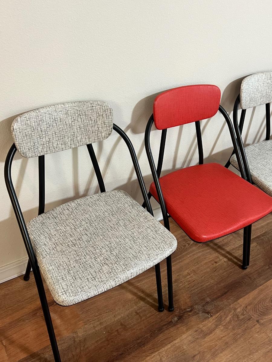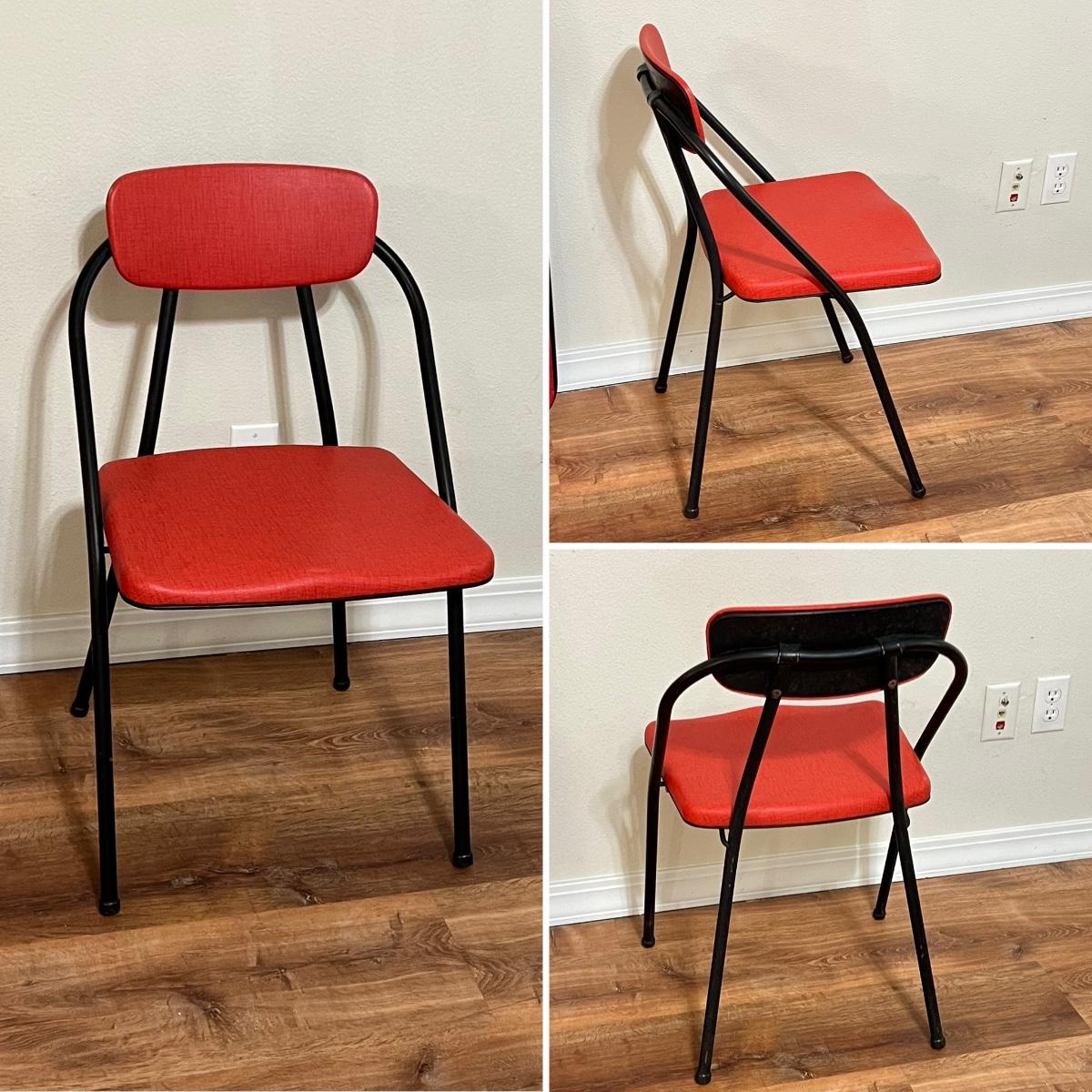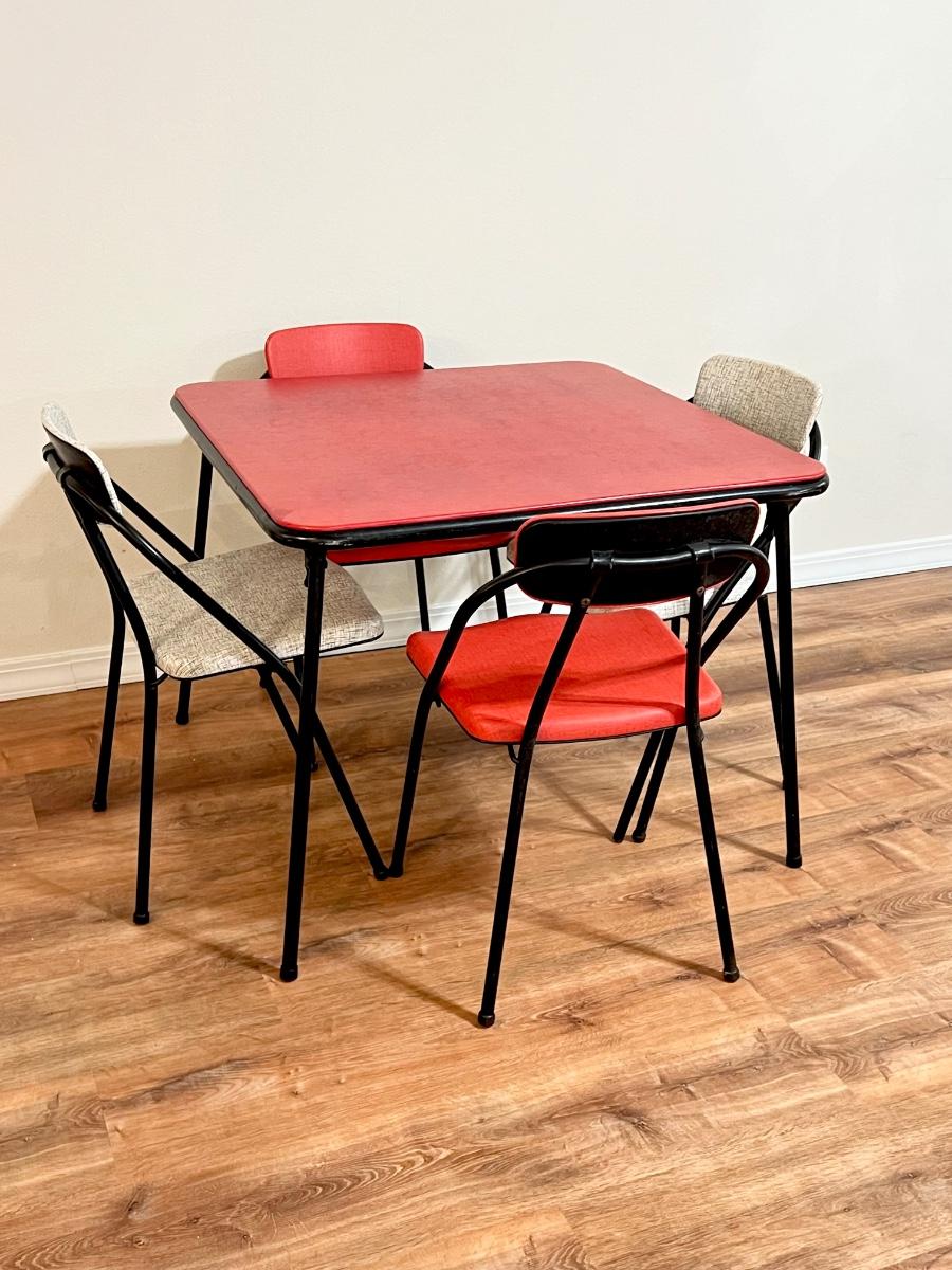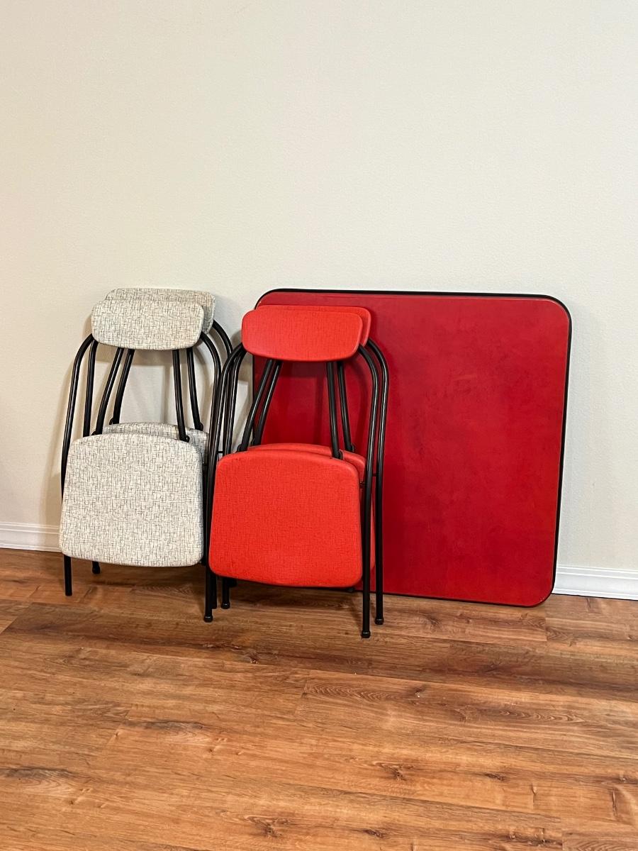 Has wear from use, see photos ~ Table = 27.5” H x 35” Square ~ Folding chairs = 30” H x 17” W x 19” D