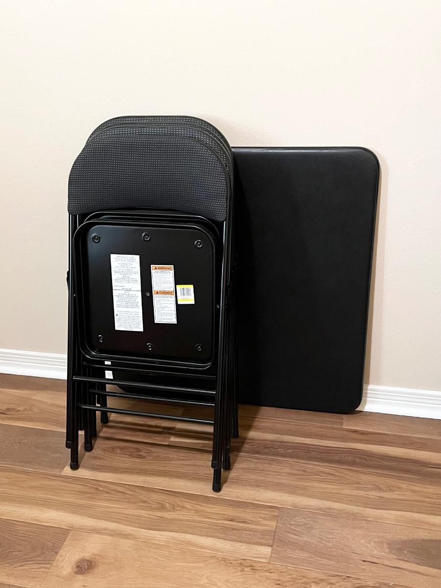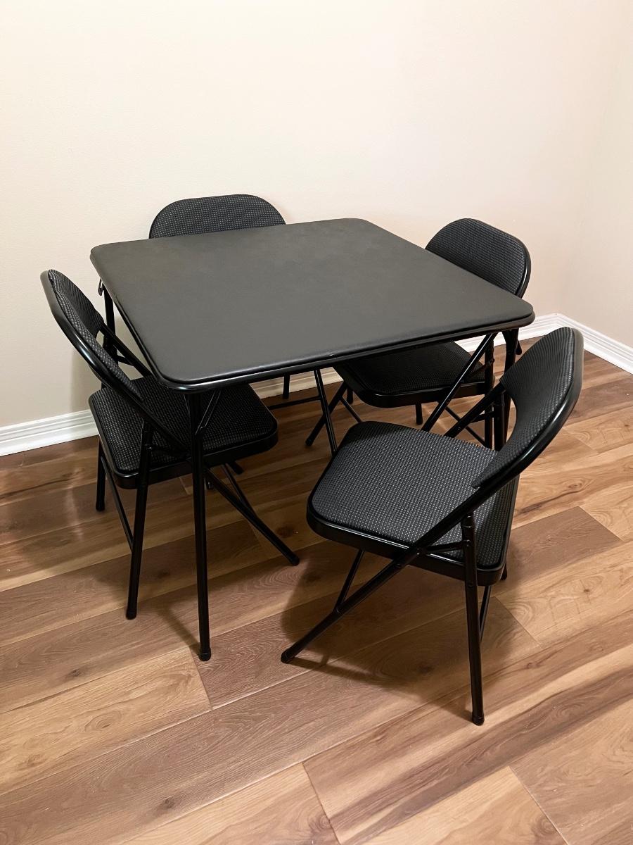 Folding chairs are COSCO, the table is not ~ Chairs have been deodorized, sanitized, & disinfected ~ Table has minor rips on soft top, see photos ~ Table = 28” H x 34” Square