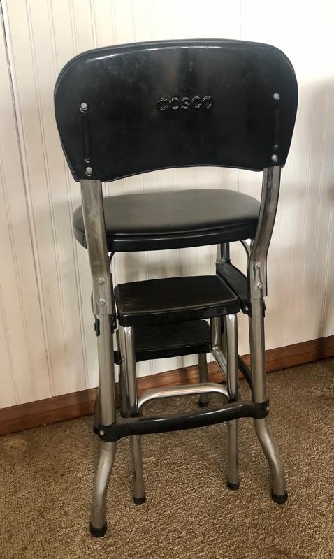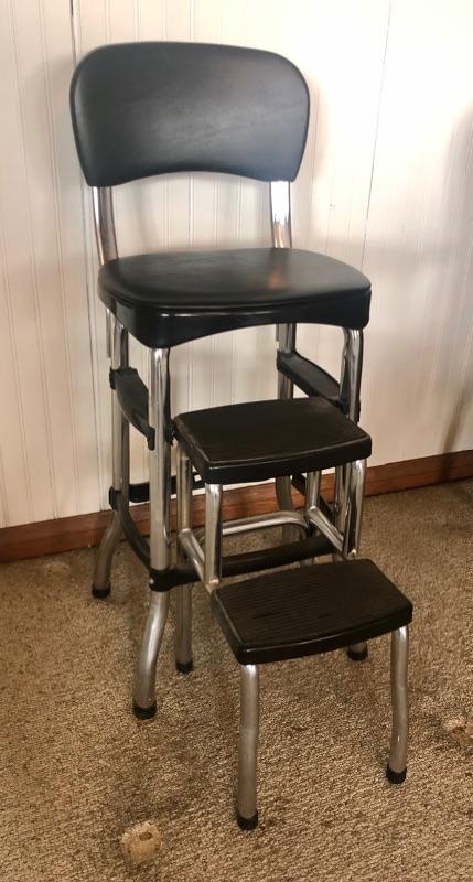 Black and chrome kitchen step stool chair, near new condition. Approx 14” wide x 14” deep, and 34” tall.