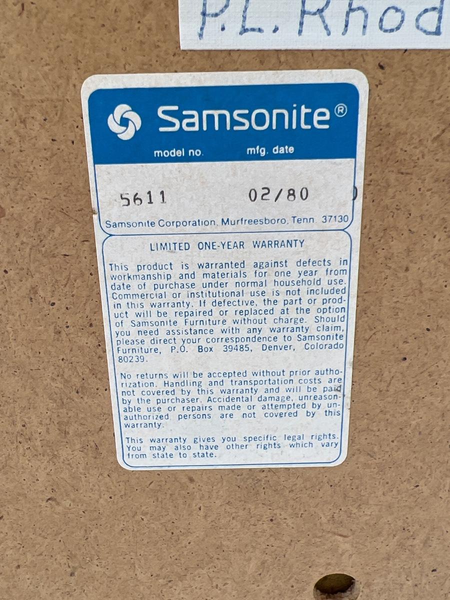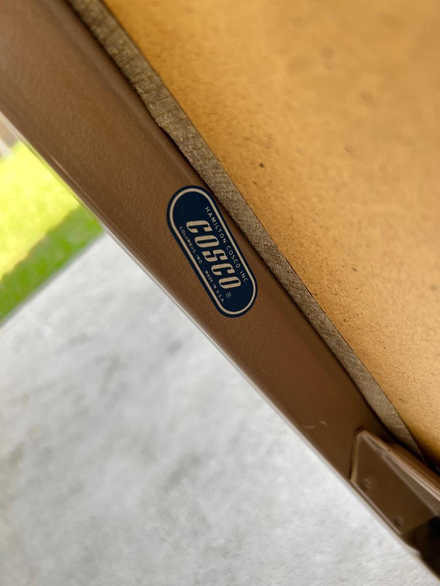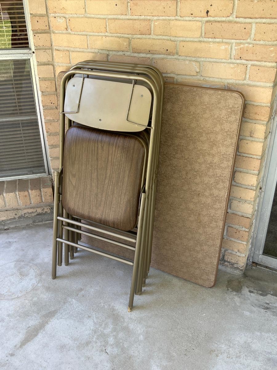 The table is Cosco & the 4 chairs are Samsonite. No rips, holes, or tears. Table = 28” H x 35” Square. Chairs = 31” H x 17.25” W x 21” D.