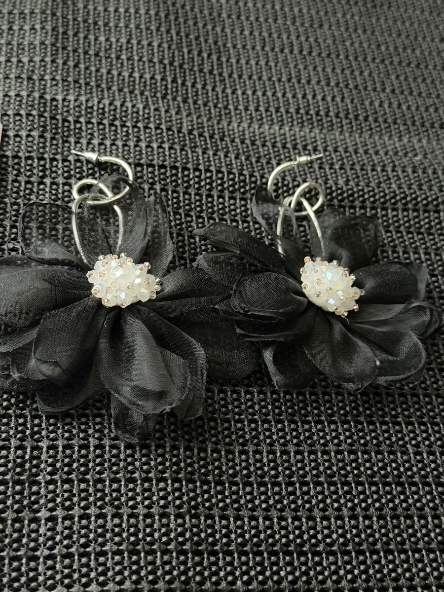 Cosmopolitan Chiffon black earrings featuring chiffon petals and iridescent beads.