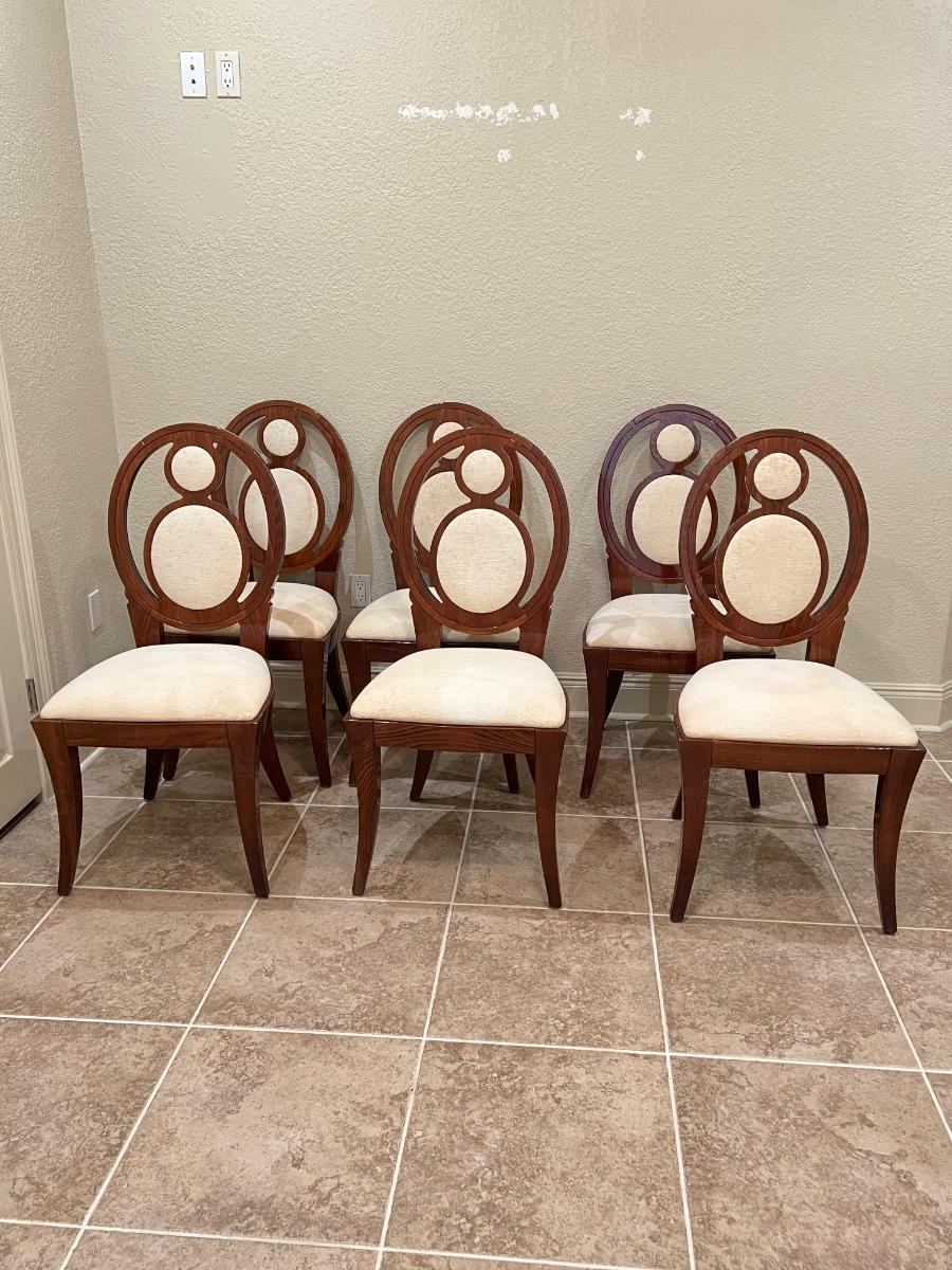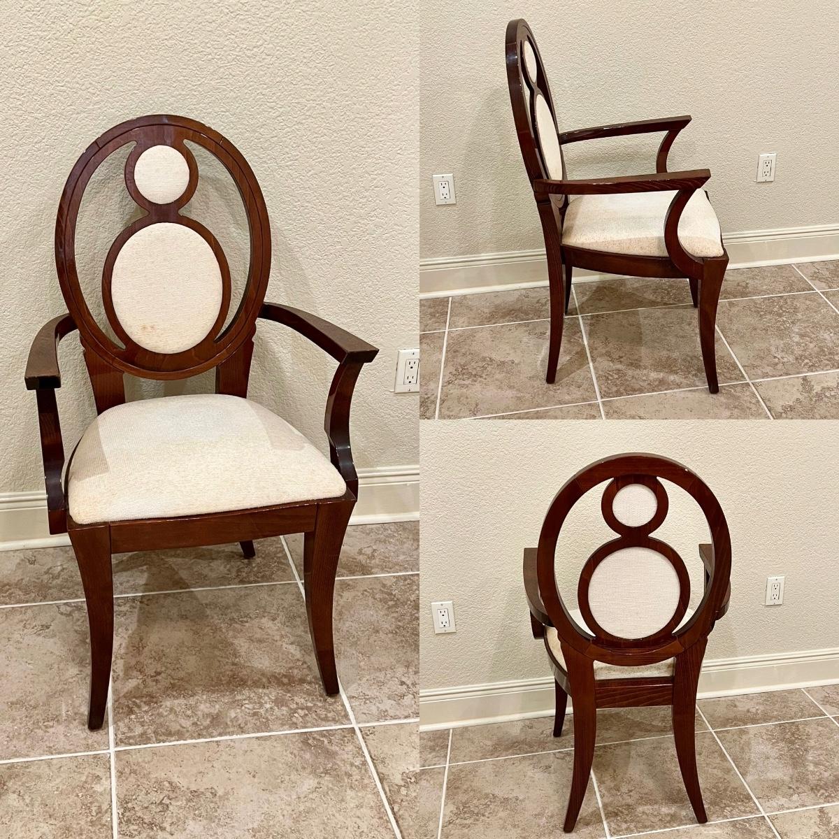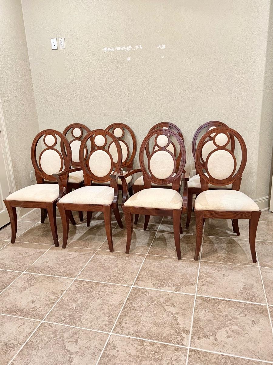Set includes: 6 regular chairs & 2 captains chairs ~ Upholstery needs to be cleaned or totally reupholstered. They have been in storage, captains chairs have minor surface scratches see photos ~ Regular chairs = 40.75” H x 20” W x 23.5” D ~ Captains chairs = 40.75” H x 23.5” W x 23.5” D